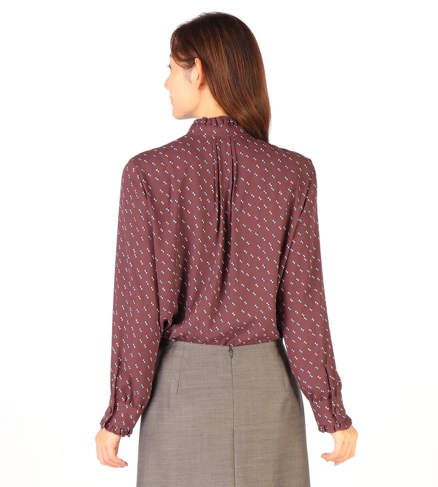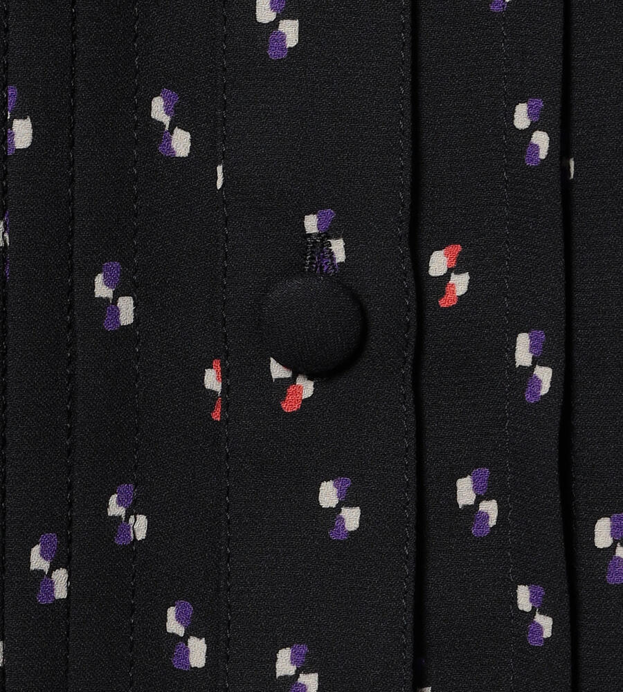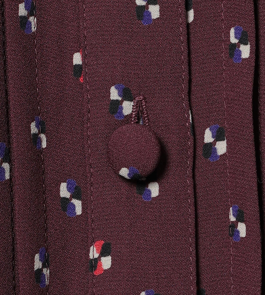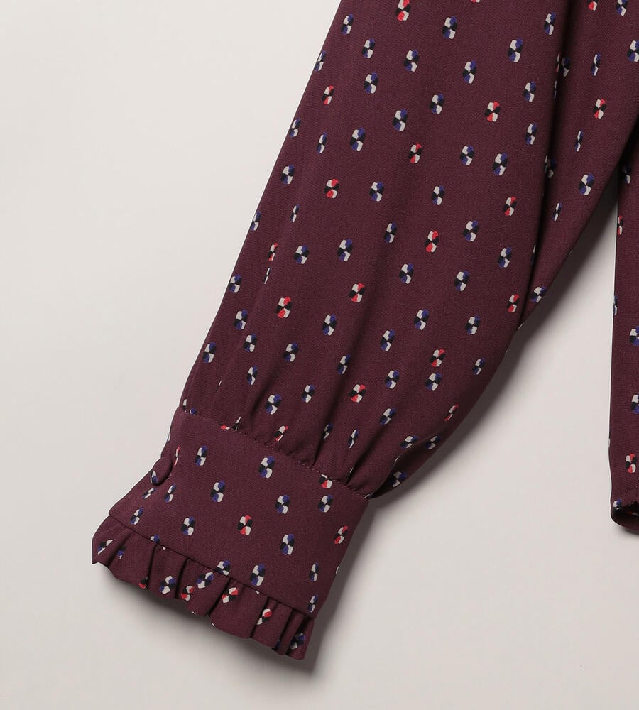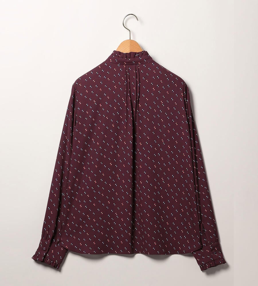 グラフィカルでレトロな雰囲気のドット柄が全面にプリントされた、エレガントな長袖ブラウス。ピンタック入りのフロントが上品かつ、華やかなムード。袖口とスタンドカラーの襟元のフリル、コロンとしたくるみボタンも愛らしいデザインポイント。スタイリッシュなスタイリングが完成するアイテムです。