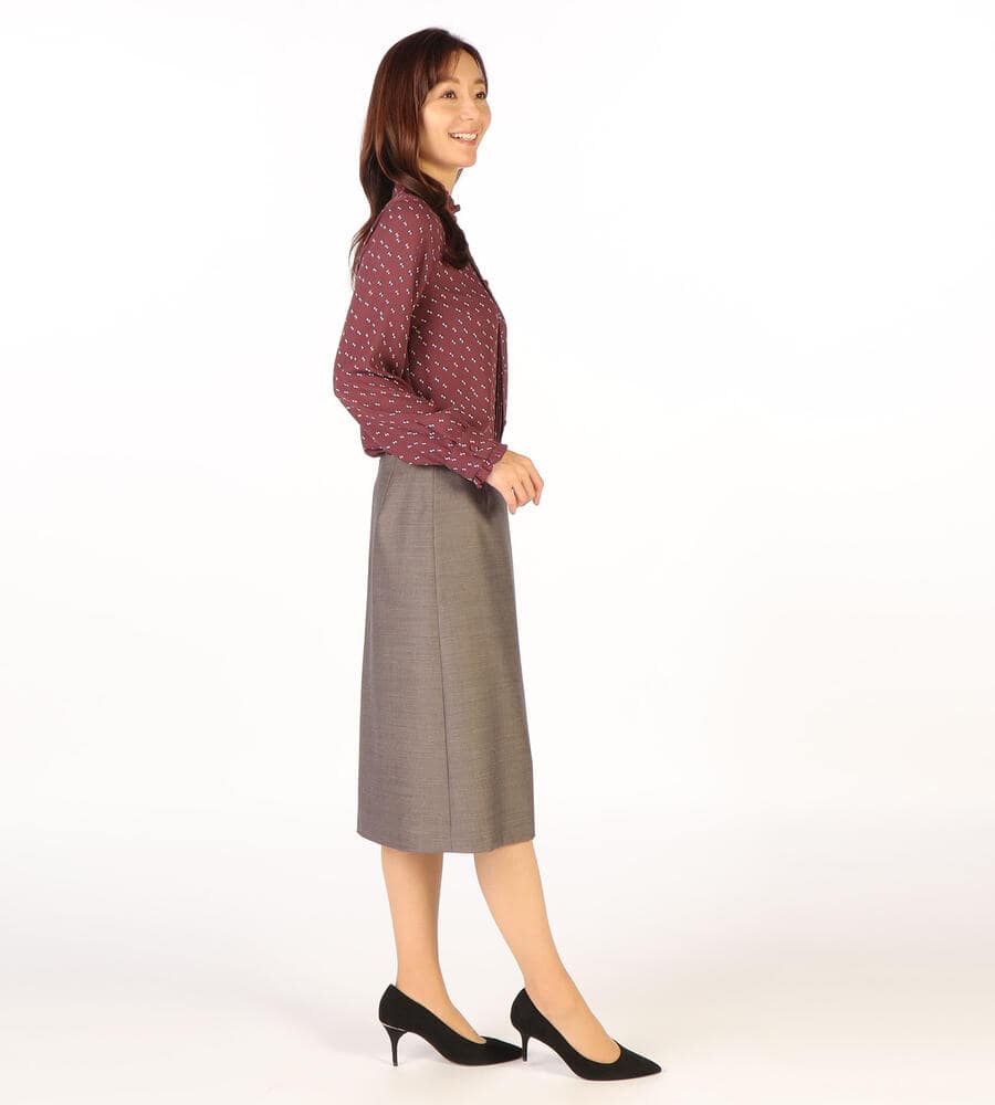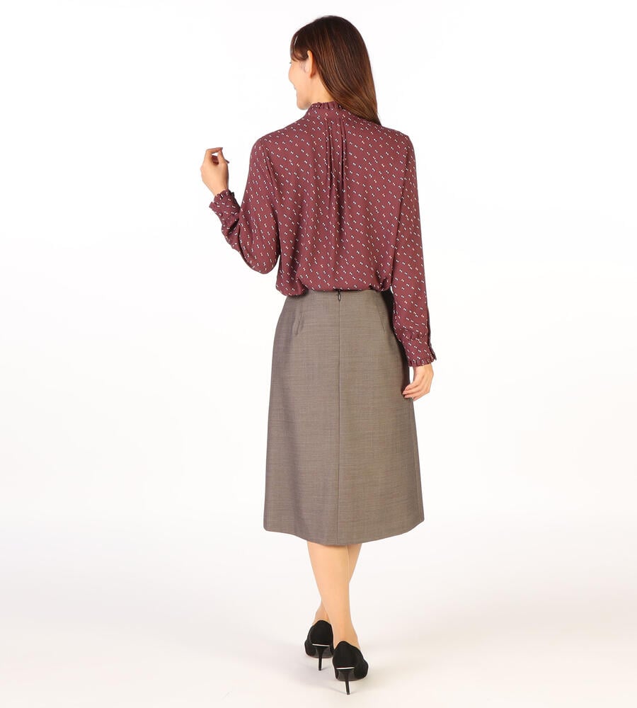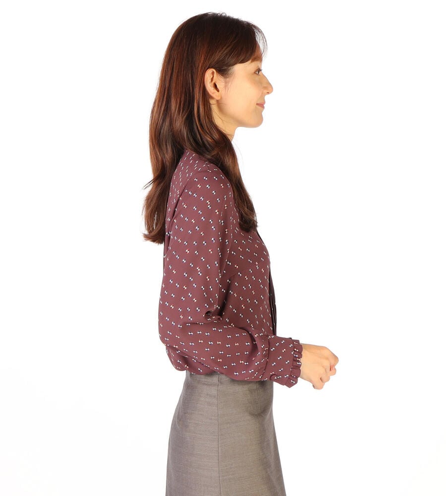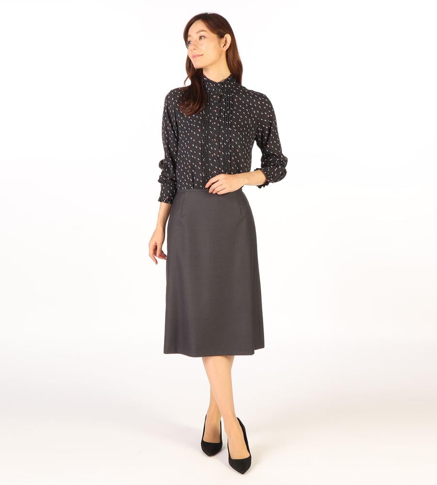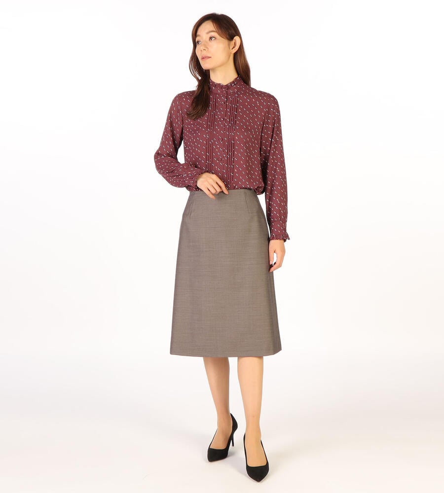 グラフィカルでレトロな雰囲気のドット柄が全面にプリントされた、エレガントな長袖ブラウス。ピンタック入りのフロントが上品かつ、華やかなムード。袖口とスタンドカラーの襟元のフリル、コロンとしたくるみボタンも愛らしいデザインポイント。スタイリッシュなスタイリングが完成するアイテムです。
