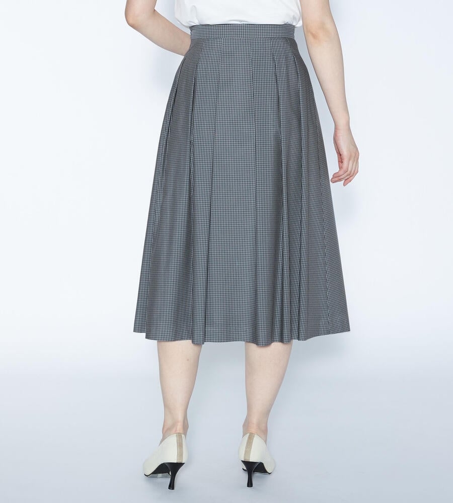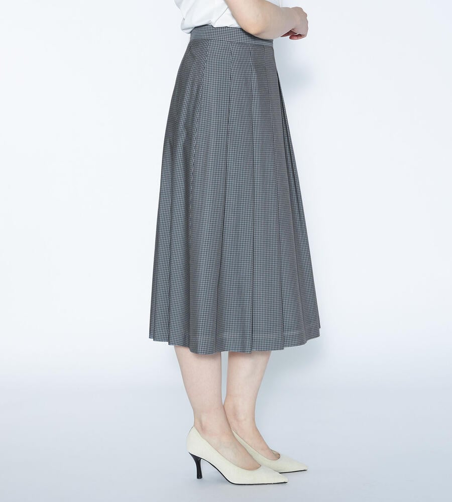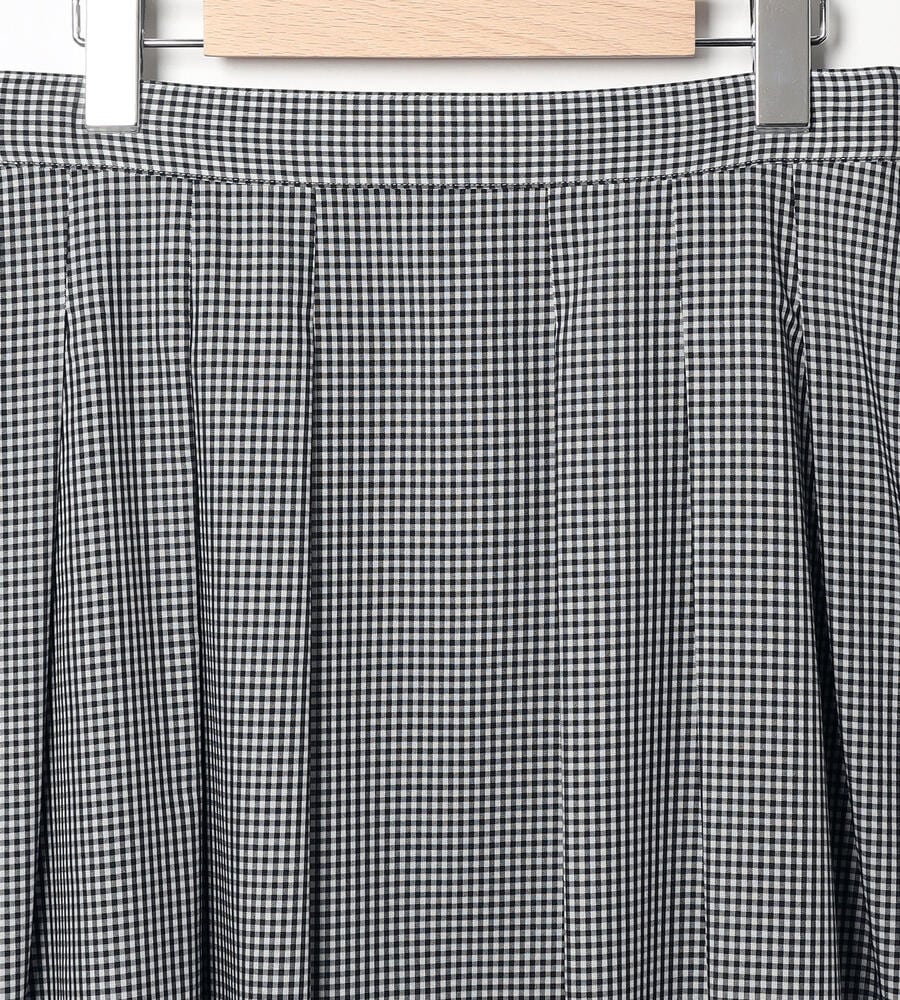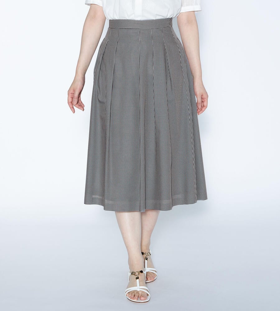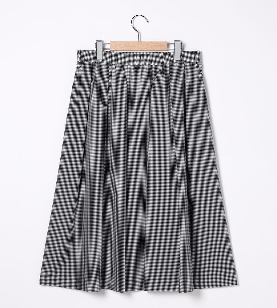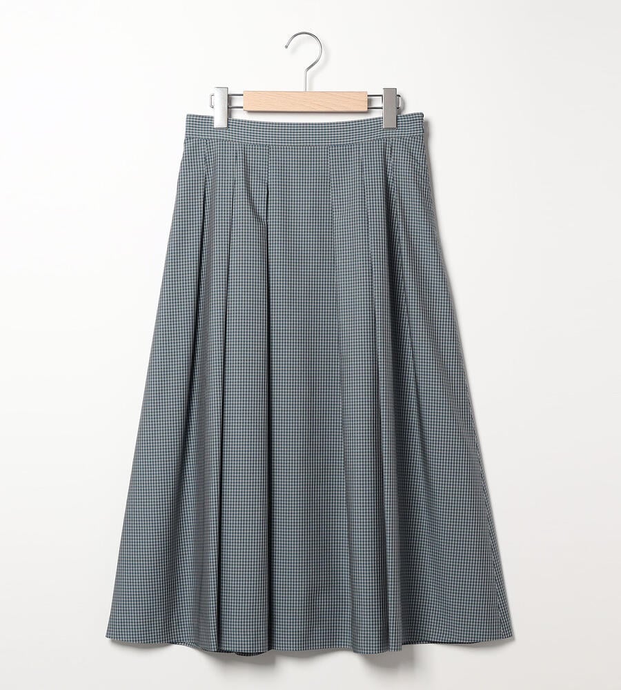 着こなしのアクセントになる細かなギンガムチェック柄がさわやかなムードのスカート。腰回りにボックスプリーツ加工をほどこし、フレアに広がるシルエットがフェミニンなムードを演出。軽やかかつエレガントに決まるひざ下ミモレ丈で、スタイリッシュなおでかけコーディネートにぴったりなアイテムです。
