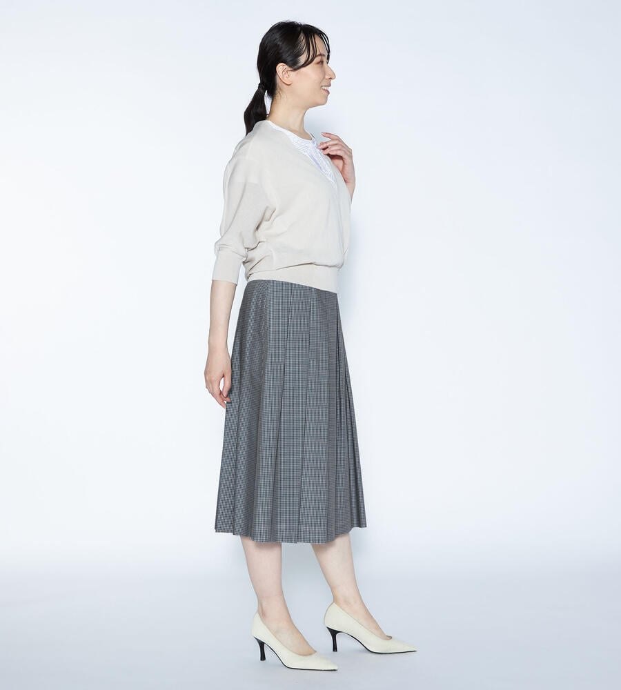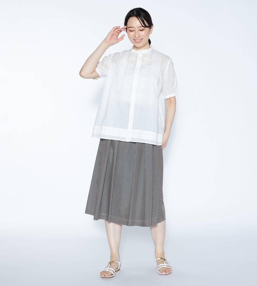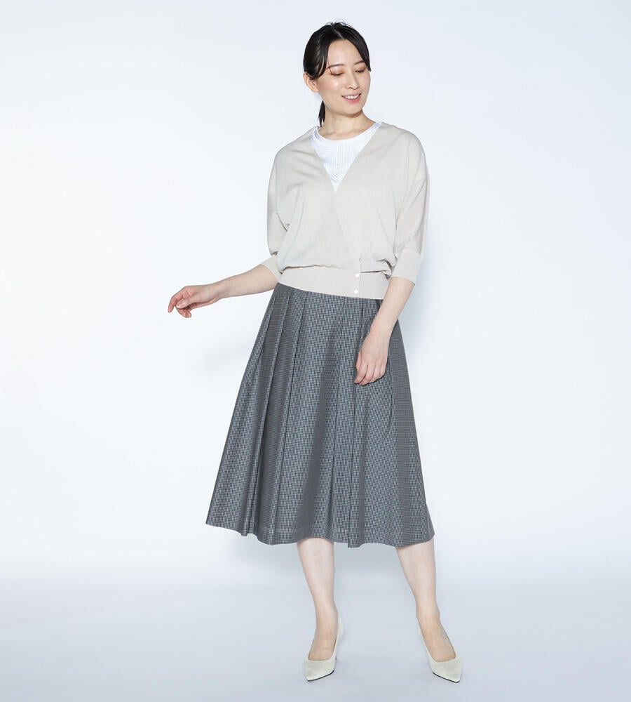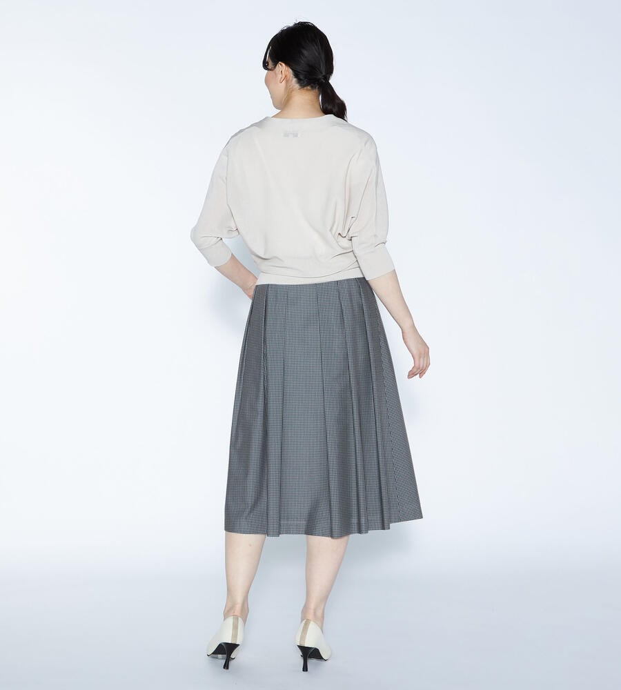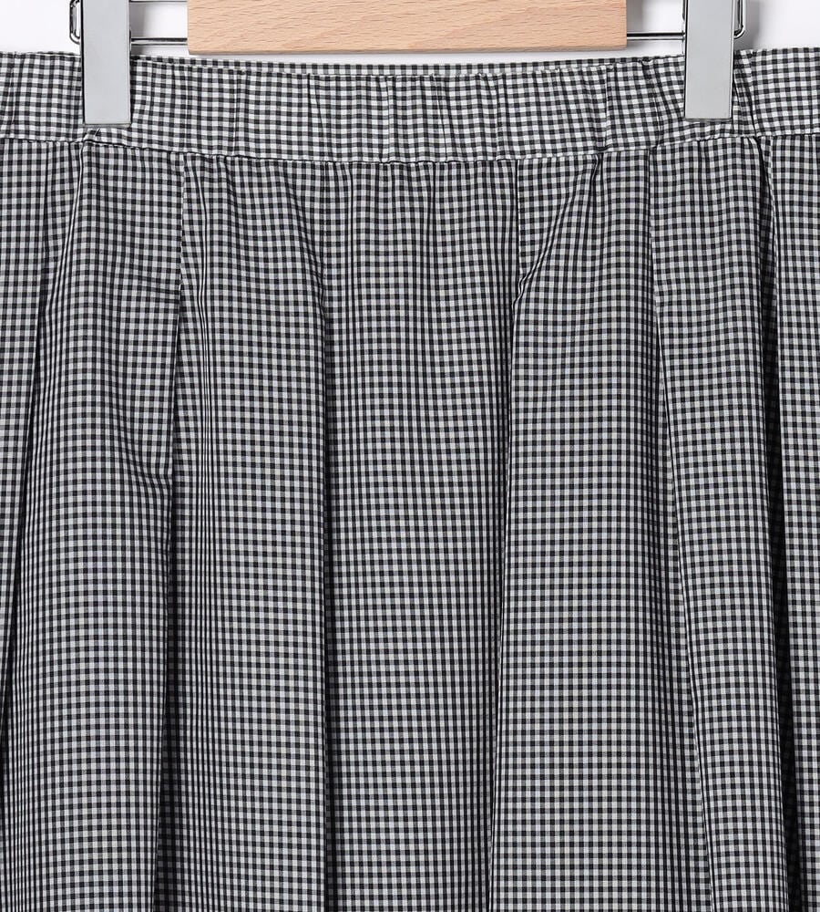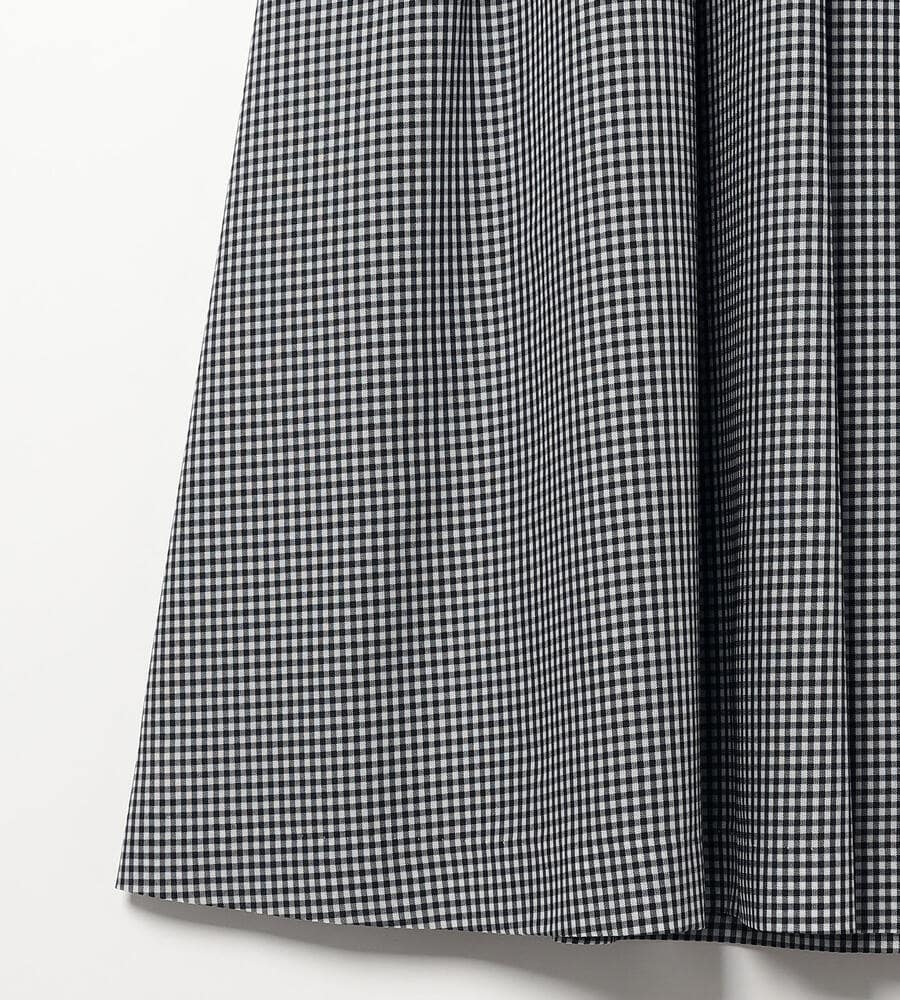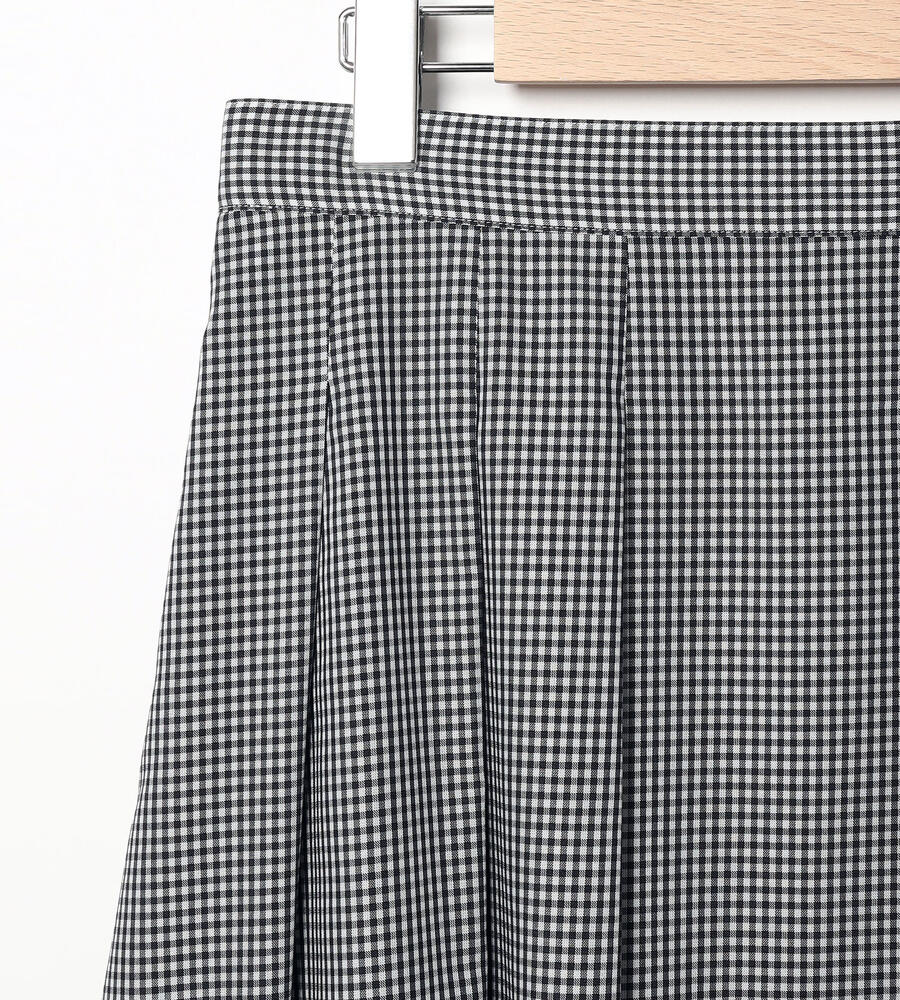 着こなしのアクセントになる細かなギンガムチェック柄がさわやかなムードのスカート。腰回りにボックスプリーツ加工をほどこし、フレアに広がるシルエットがフェミニンなムードを演出。軽やかかつエレガントに決まるひざ下ミモレ丈で、スタイリッシュなおでかけコーディネートにぴったりなアイテムです。