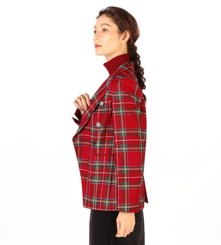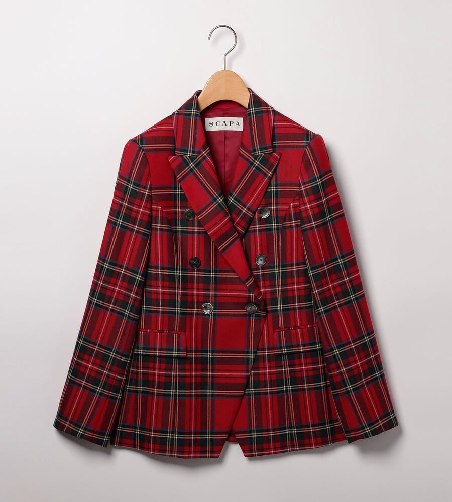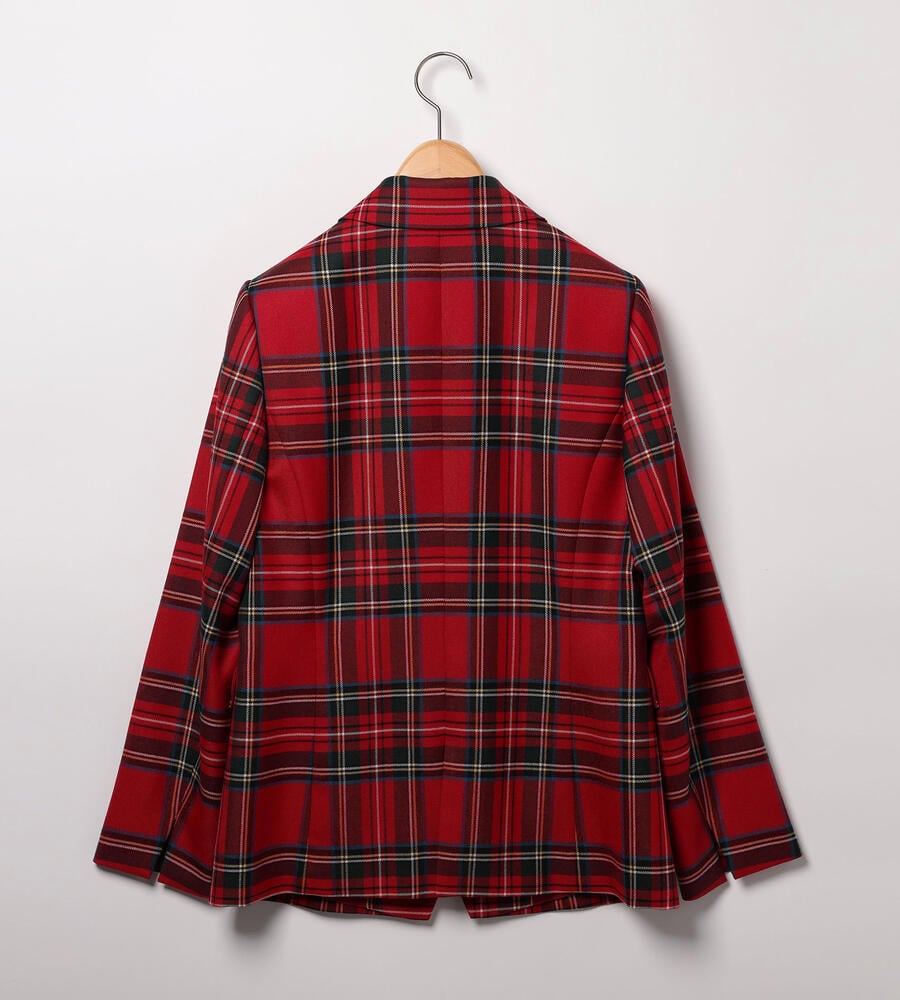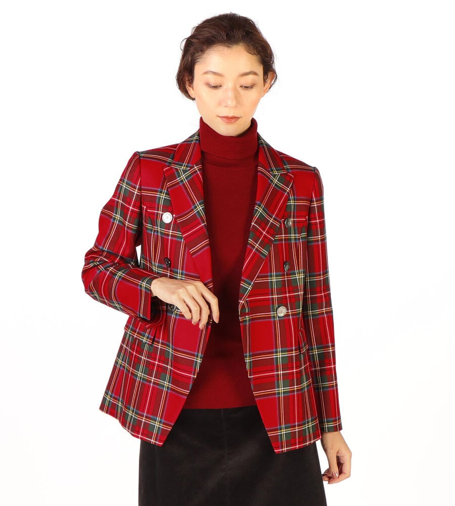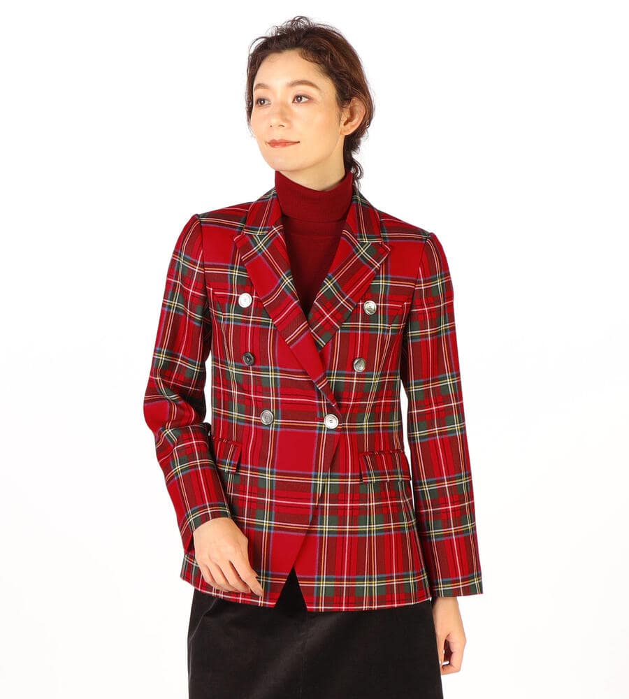 ダブルボタンのフロントがシックなムードのジャケット。華やかなチェック柄が着こなしのアクセントになるデザイン。ダーツ入りですっきりとしたシルエットで着こなせます。フロントを開けても閉めて着ても様になる印象的なフロントカットが魅力。スタイリッシュなコーディネートが実現するアイテムです。