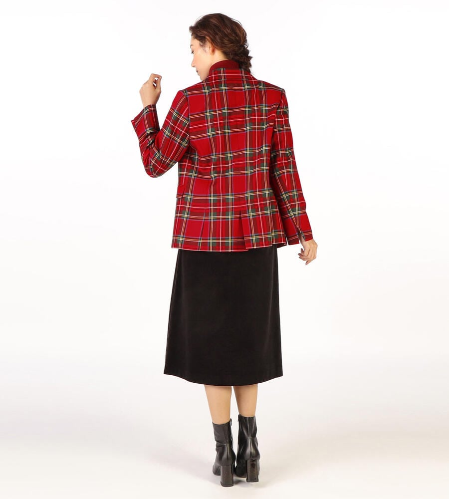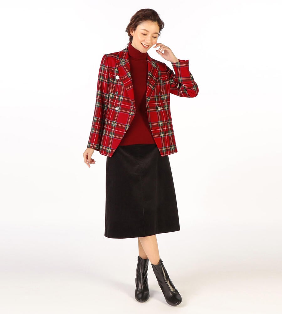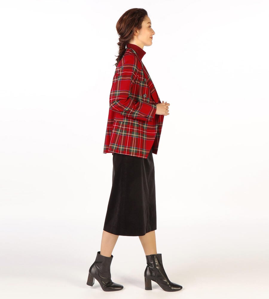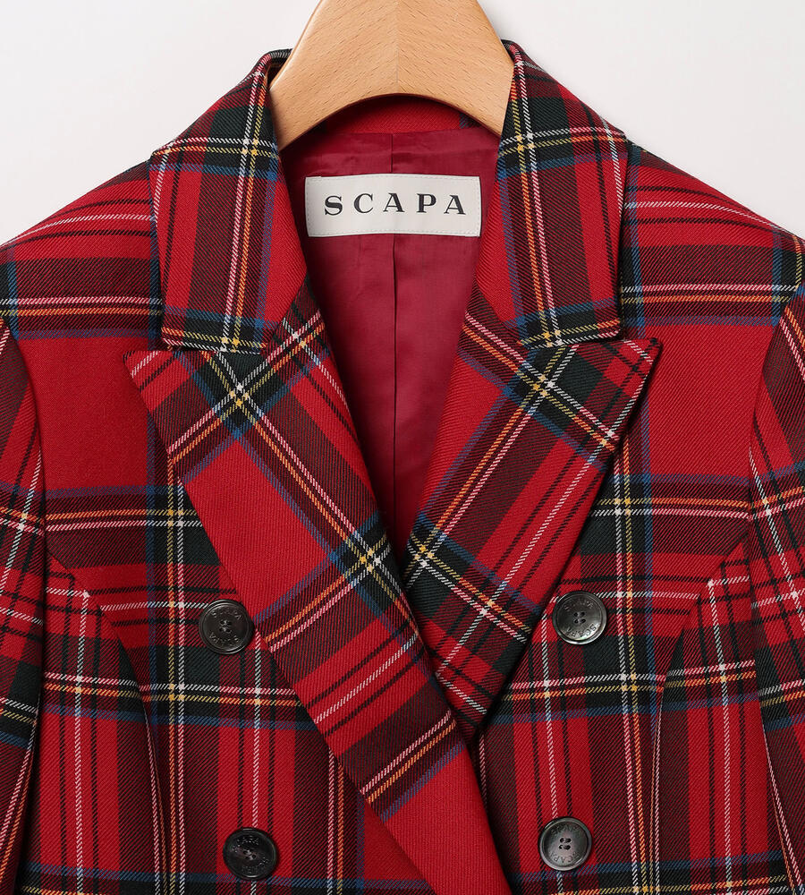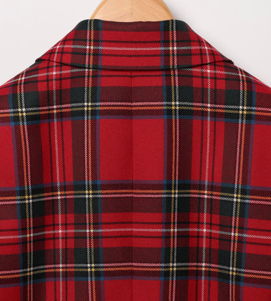 ダブルボタンのフロントがシックなムードのジャケット。華やかなチェック柄が着こなしのアクセントになるデザイン。ダーツ入りですっきりとしたシルエットで着こなせます。フロントを開けても閉めて着ても様になる印象的なフロントカットが魅力。スタイリッシュなコーディネートが実現するアイテムです。