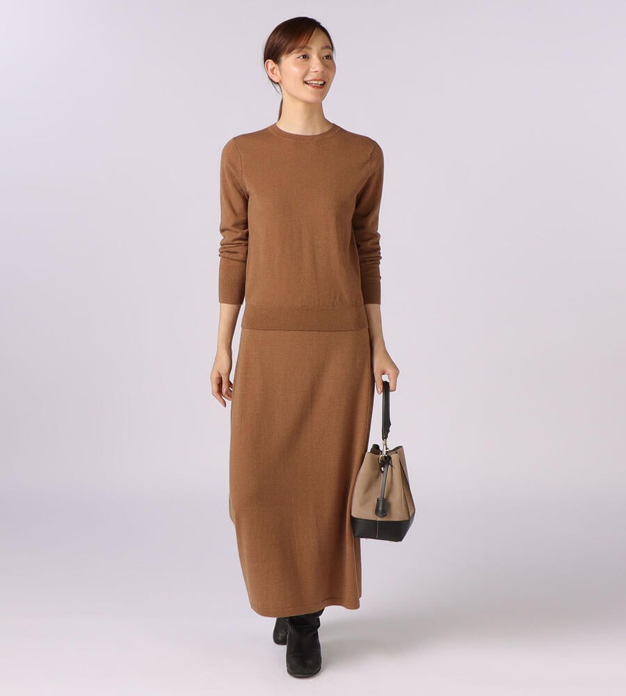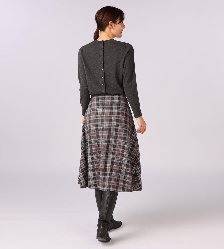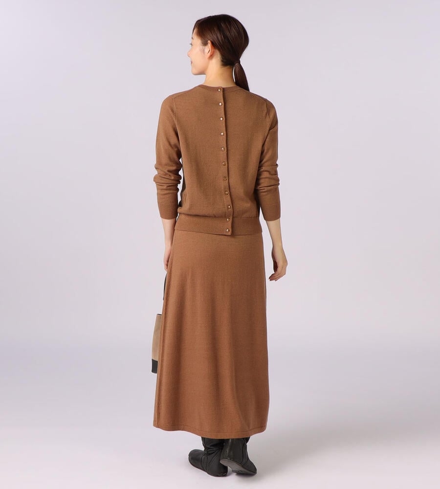 フロントはシンプルに、バックに同色のボタンを並べてアクセントをつけたニットプルオーバー。コンパクトなシルエットと品の良いハイゲージ編みが好印象。薄手ながらも毛100%素材のあたたかく快適な着心地も嬉しい。同シリーズのスカートとセットアップで着こなしていただけます。