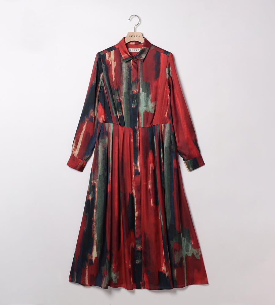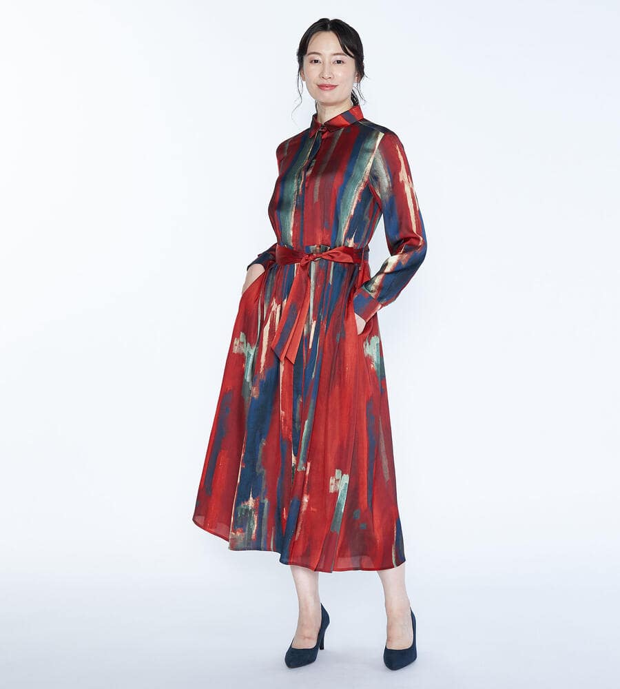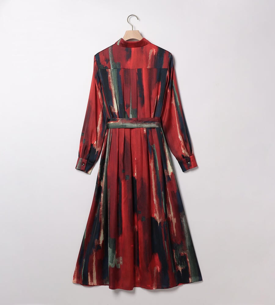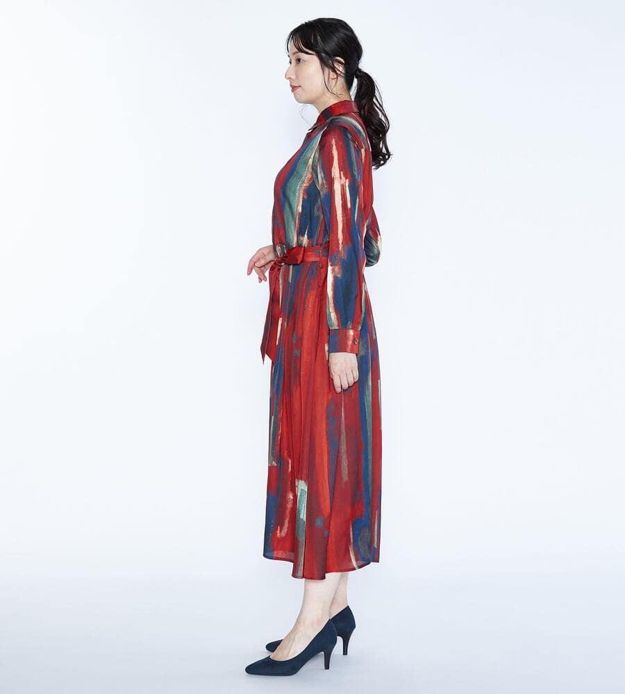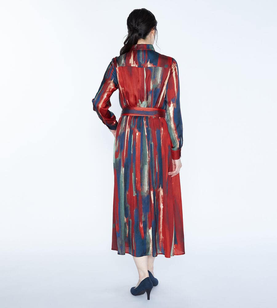 サテンのような上質な光沢を持つ生地に、まるでアートのような色彩をのせたワンピースです。襟の付いたシャツタイプは、ドレスアップオーラも満点です。ウエストをきゅっと絞るシルエットで、メリハリのある着こなしを演出。膝が隠れる着丈で、淑女のようなエレガントなスタイリングを楽しめます。