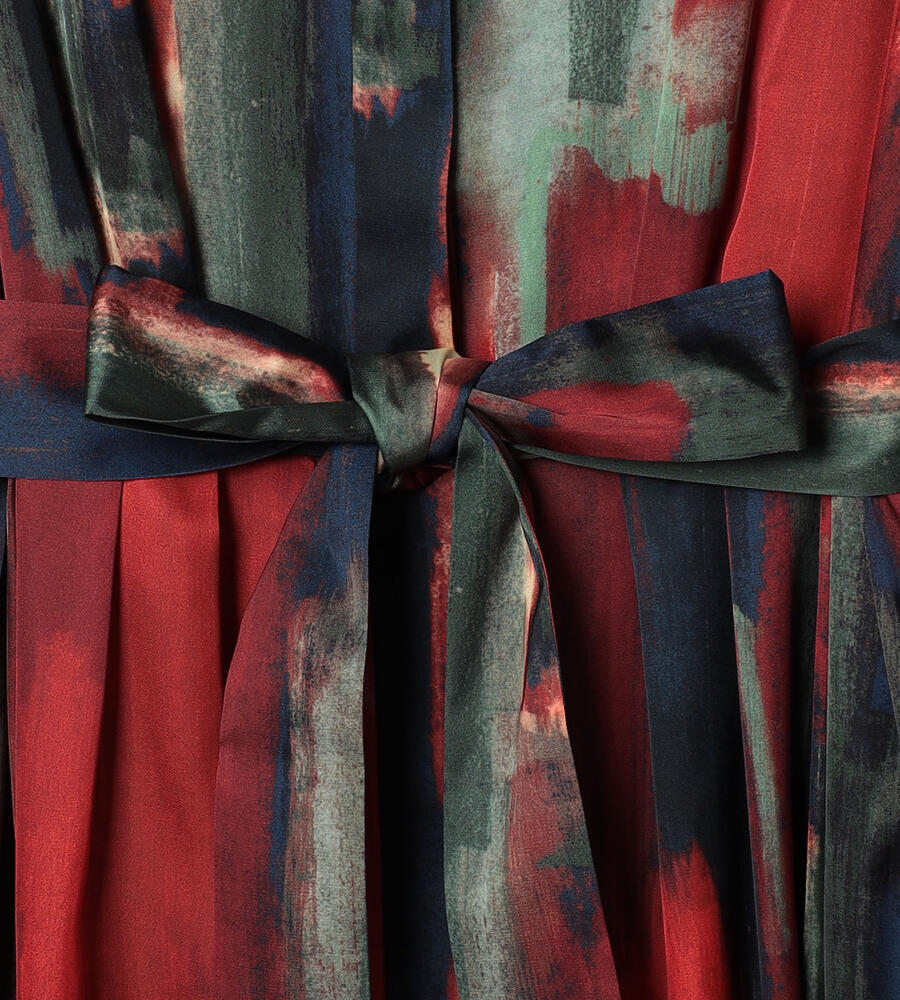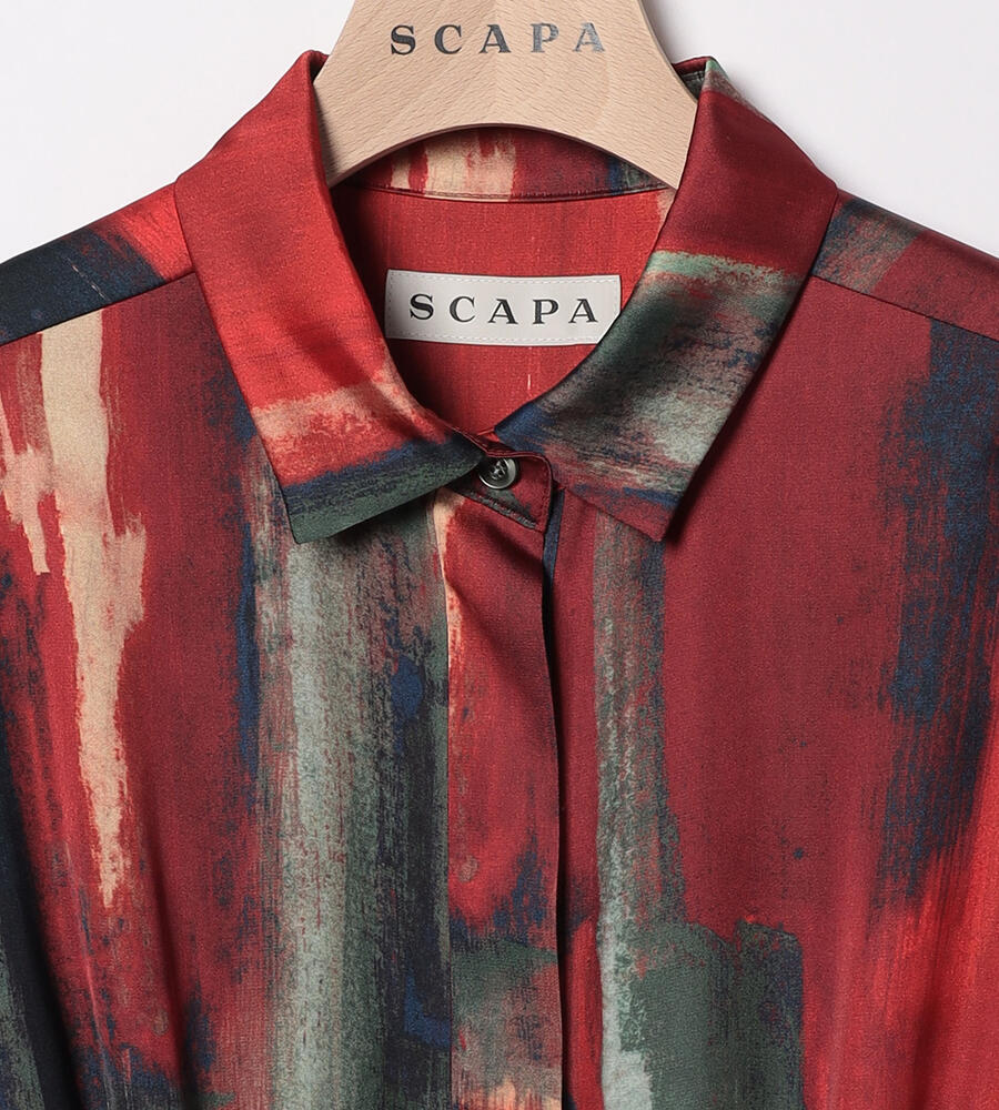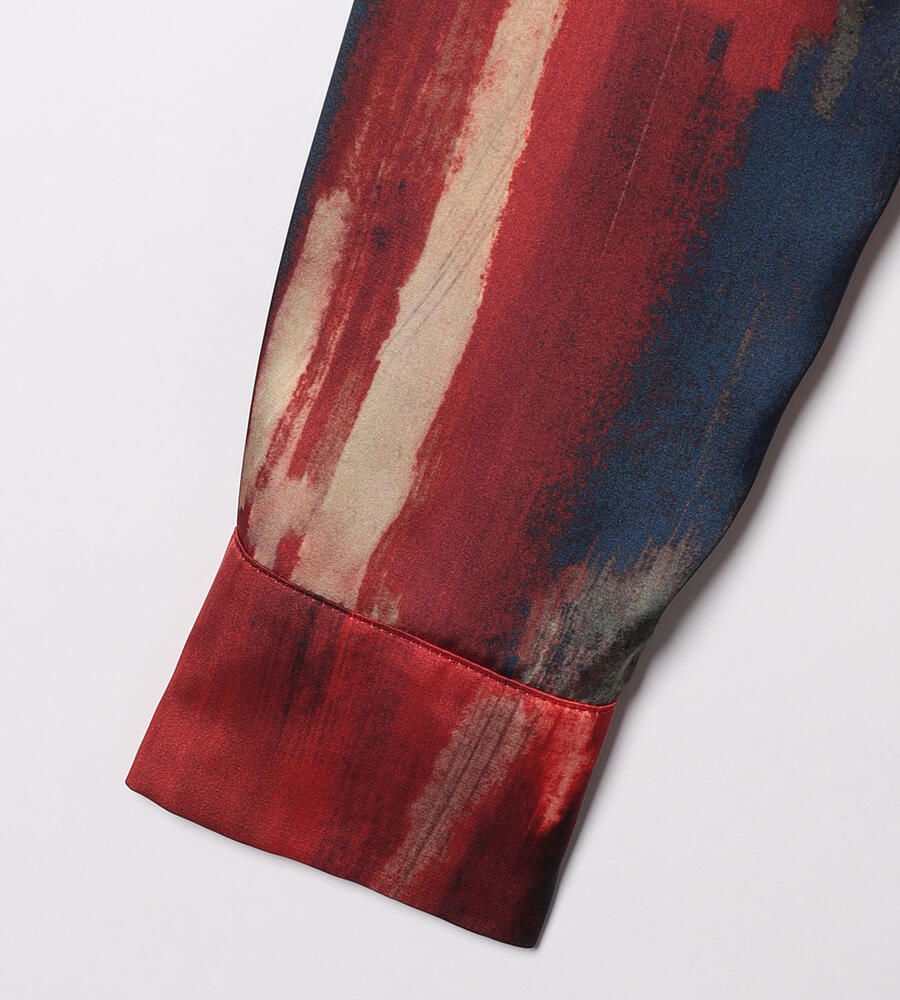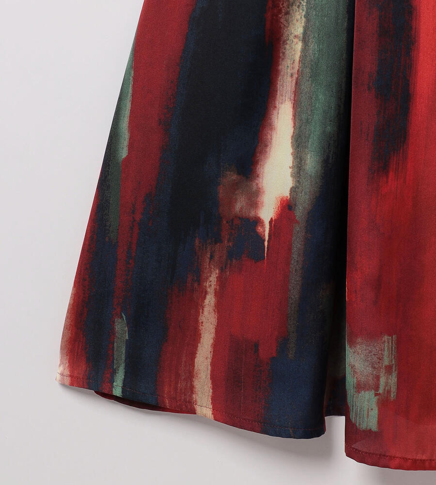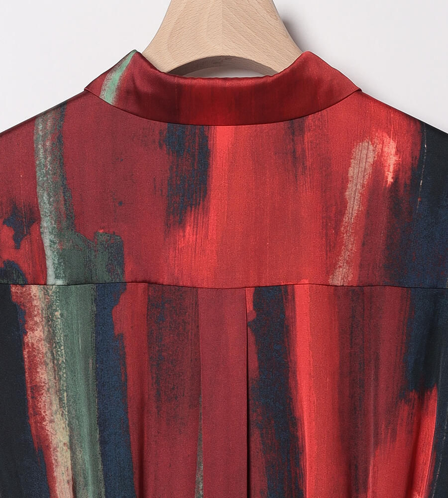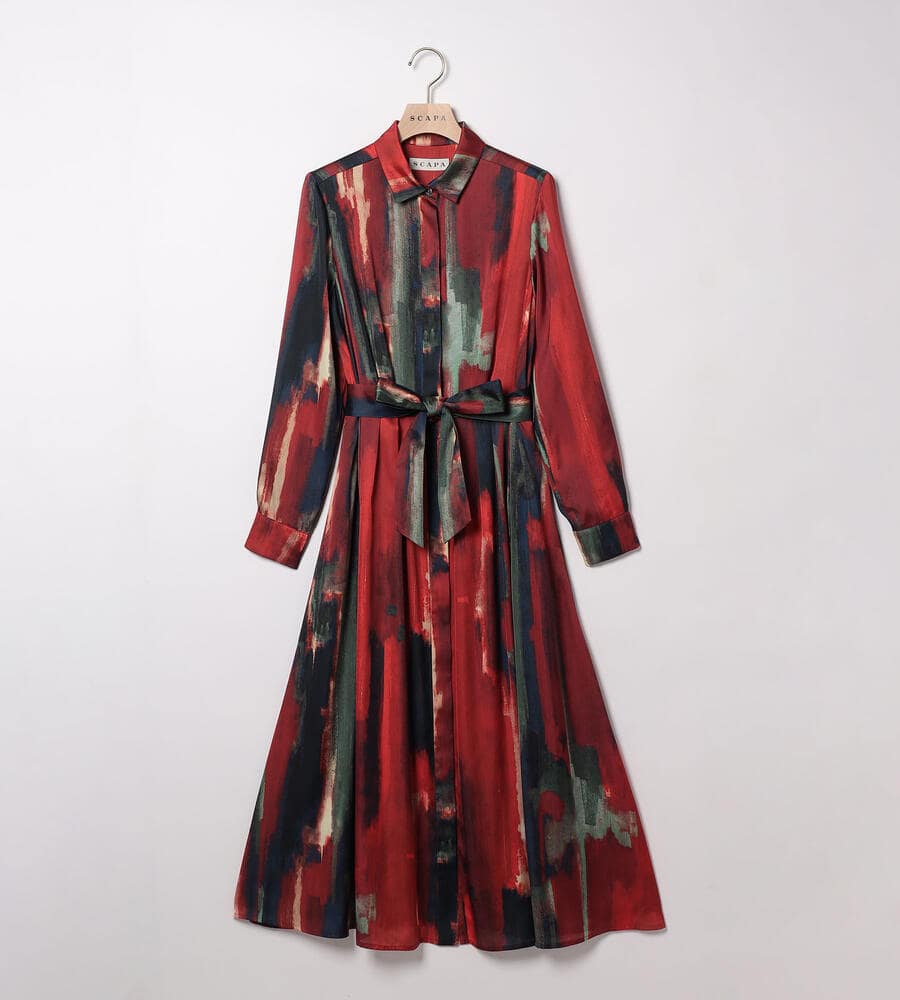 サテンのような上質な光沢を持つ生地に、まるでアートのような色彩をのせたワンピースです。襟の付いたシャツタイプは、ドレスアップオーラも満点です。ウエストをきゅっと絞るシルエットで、メリハリのある着こなしを演出。膝が隠れる着丈で、淑女のようなエレガントなスタイリングを楽しめます。