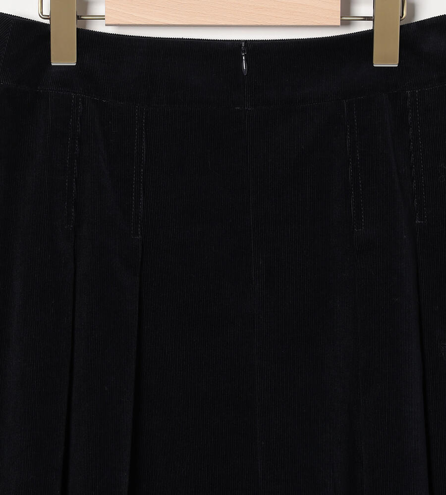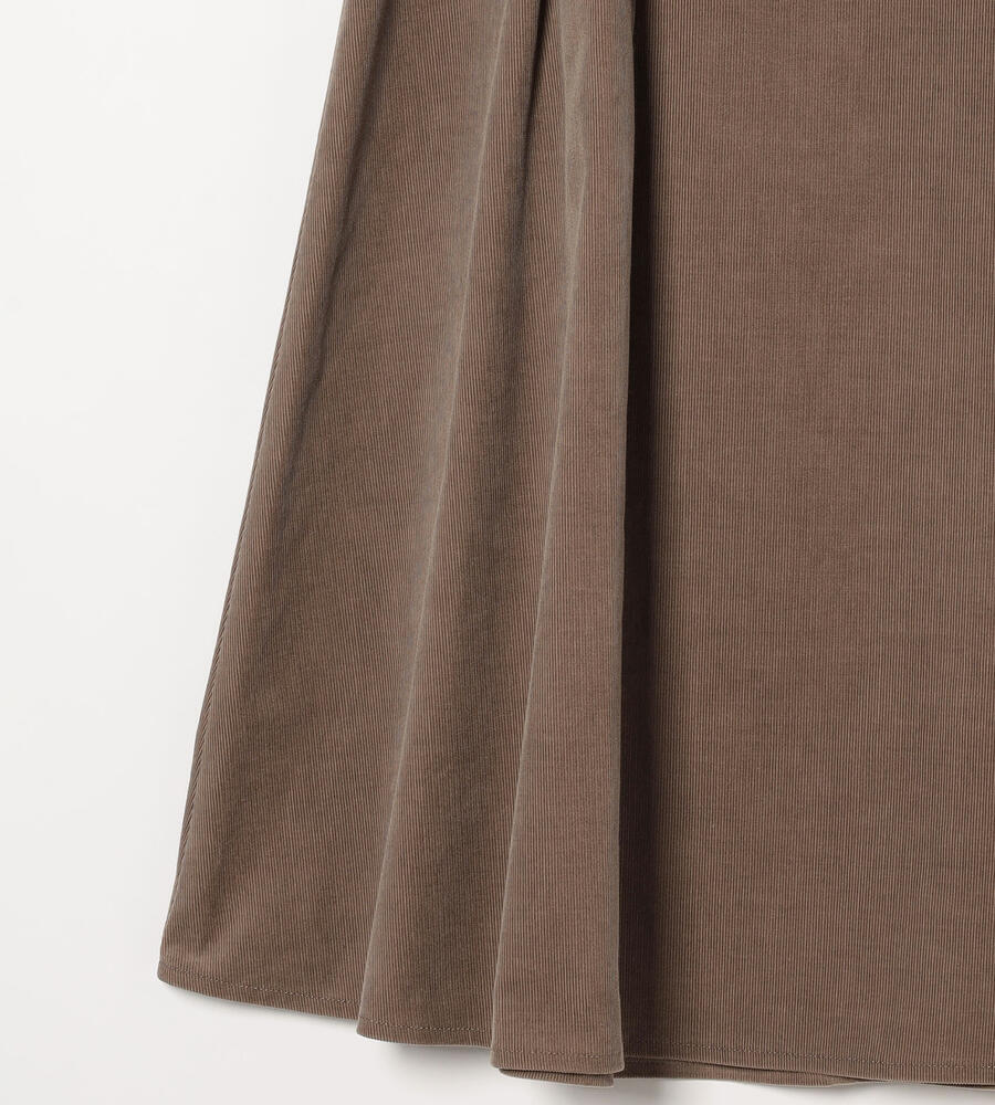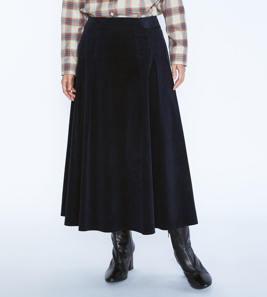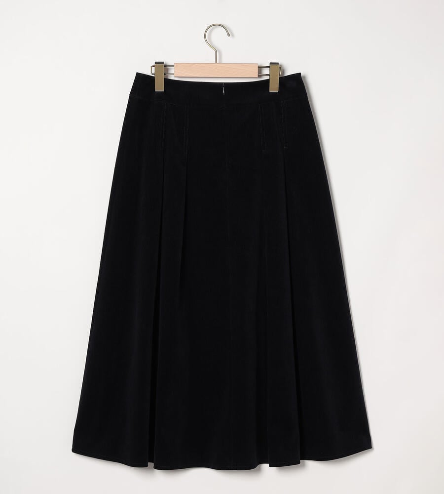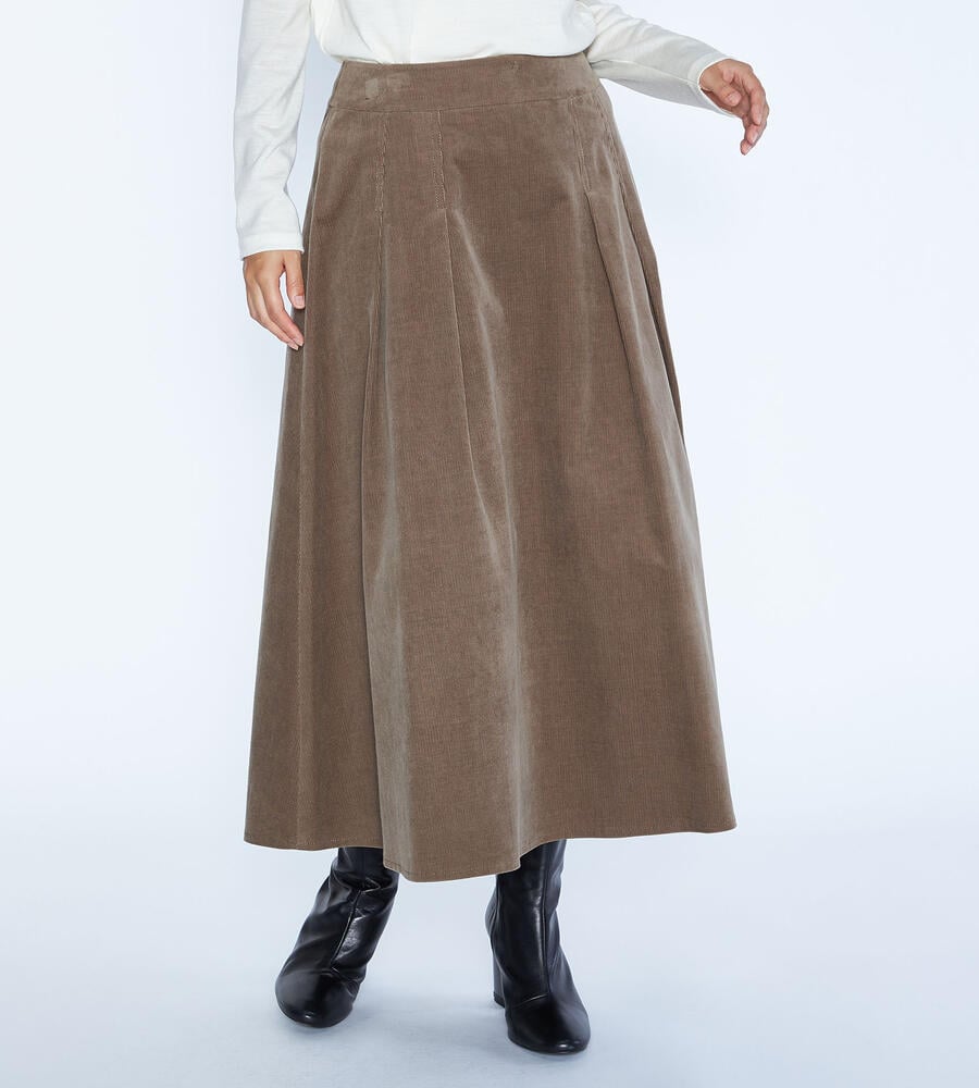 こっくりとした色使いに光沢感、そして温もりを感じさせる起毛感を併せ持つコーデュロイ素材を用いたスカート。ウエスト直下にプリーツを添えて、優雅なフレアが広がるシルエットに仕立てています。足首に届く程度の長めの着丈でも、軽やかな動きで重く見えないのが特徴。足元にブーツを合わせると、よりバランスの取れた着こなしを楽しめます。