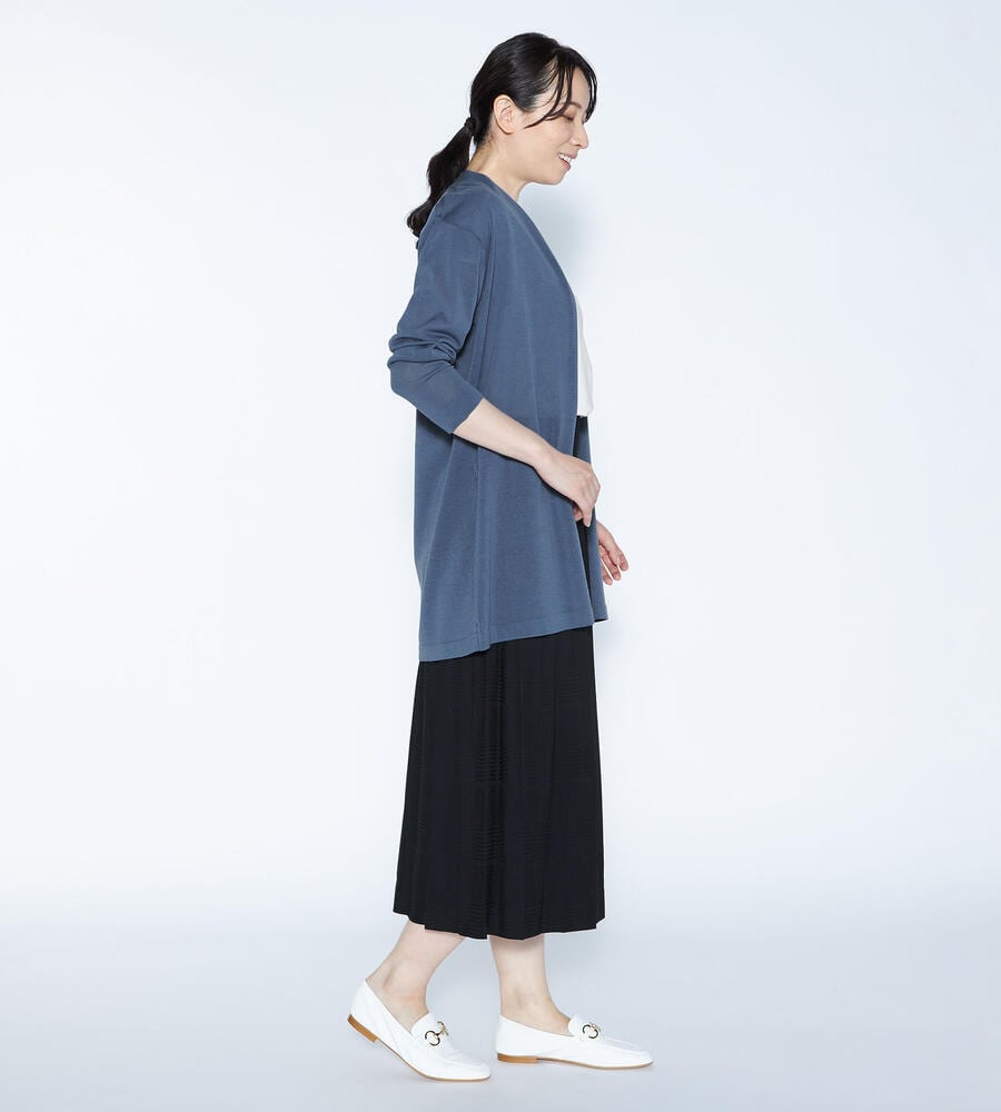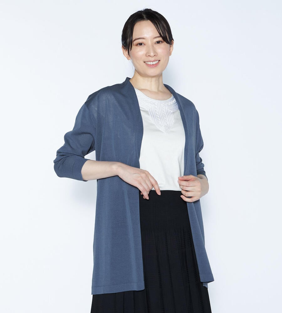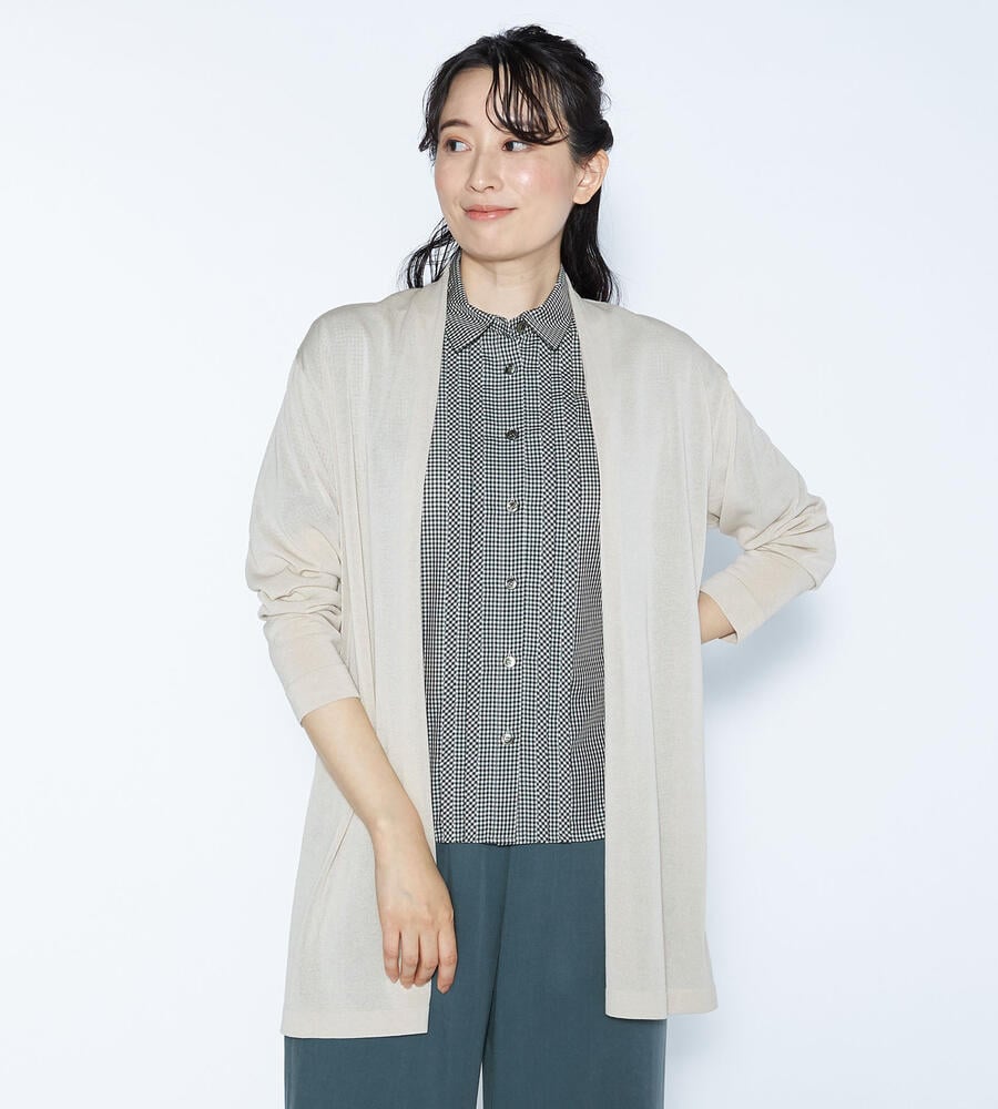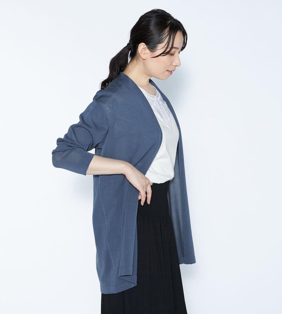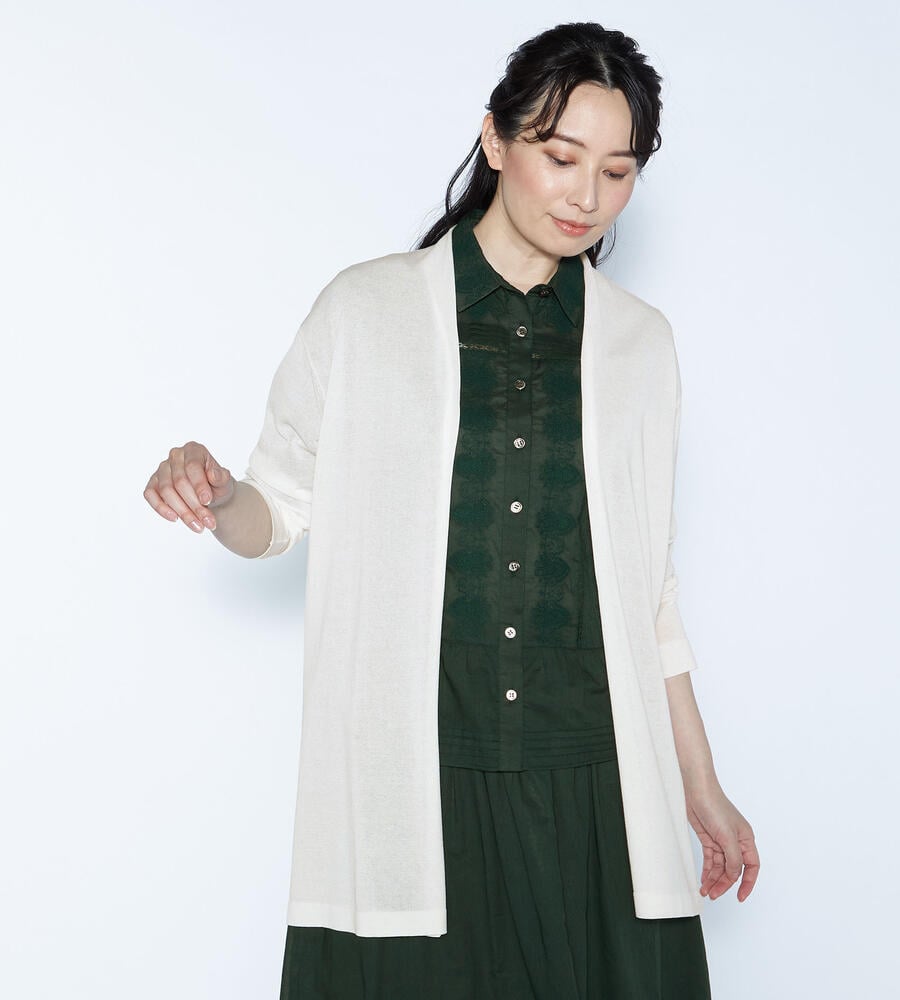 コットン混合生地で春夏らしいさわやかな素材感のニットカーディガン。ほどよい光沢感がエレガントなムード。シンプルなデザインで、様々なスタイリングとマッチ。ロング丈で軽い羽織としても活躍する一枚です。ほんのり透け感がある軽やかなムードの生地感で、おしゃれな重ね着コーディネートが実現します。