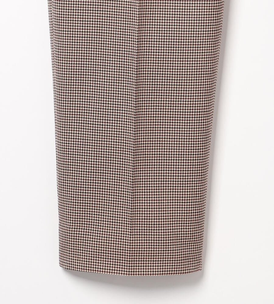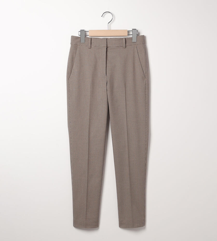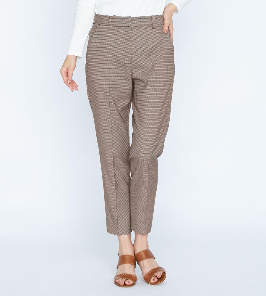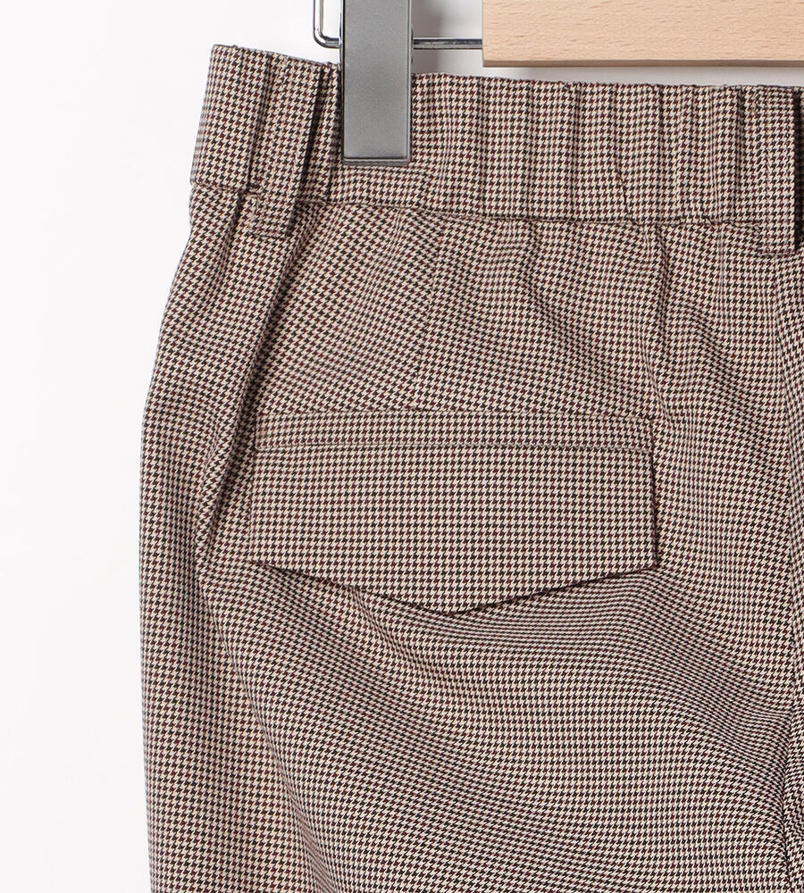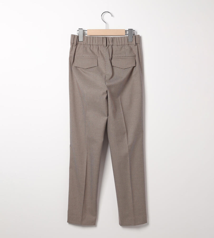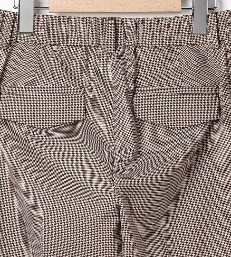 トラディショナルな雰囲気漂うガンクラブチェックのストレッチパンツ。脚のラインをすっきりと見せるセンタープレス、裾に向かってスリムになるテーパードシルエットで仕上げました。バックウエストがゴム仕様になったストレスフリーな履き心地もポイントです。細やかな模様でさりげない華やかさを添えています。