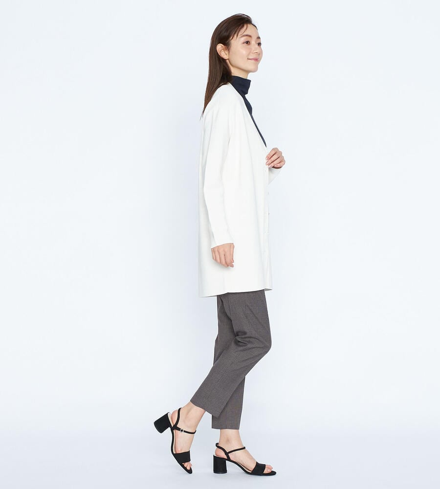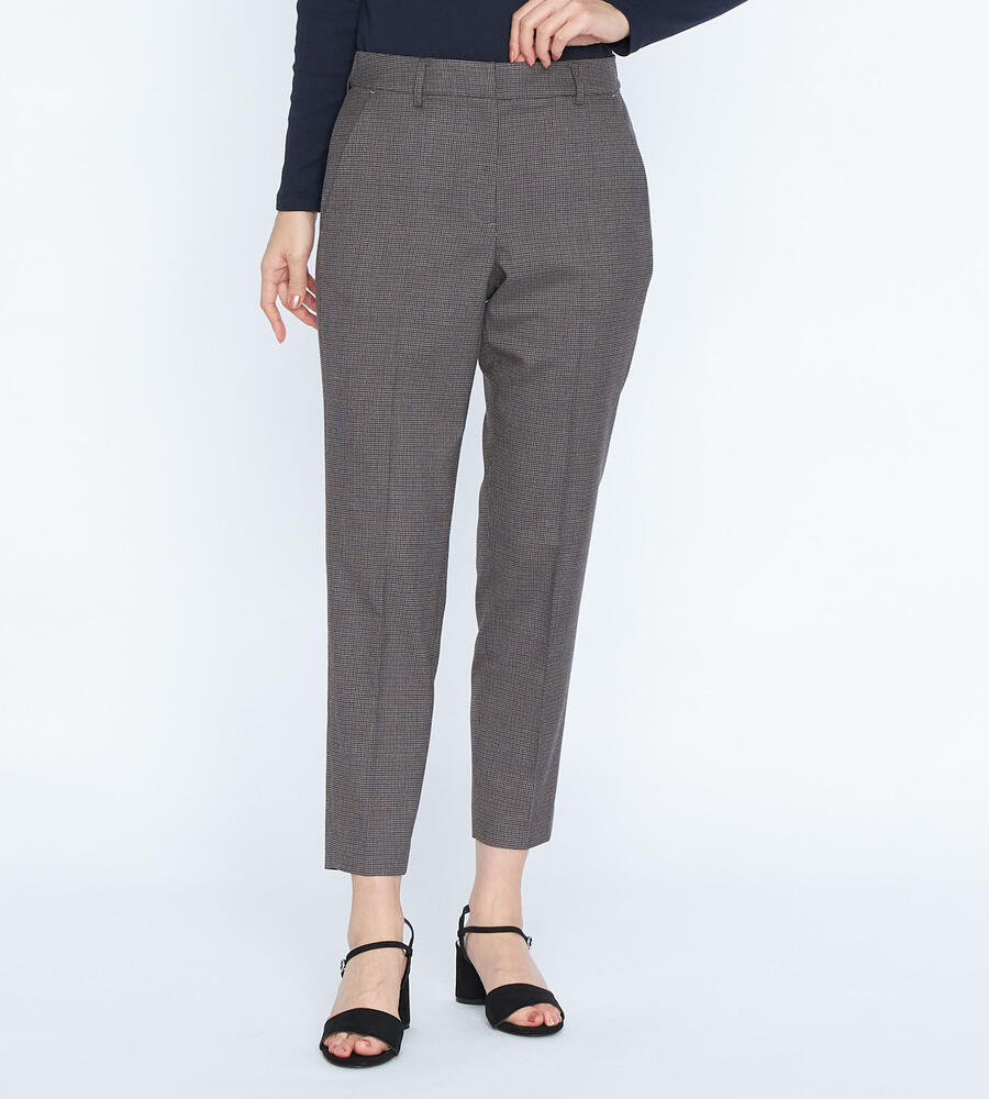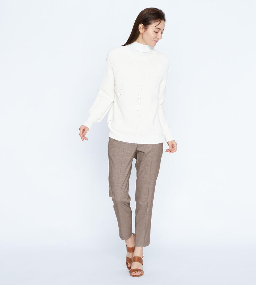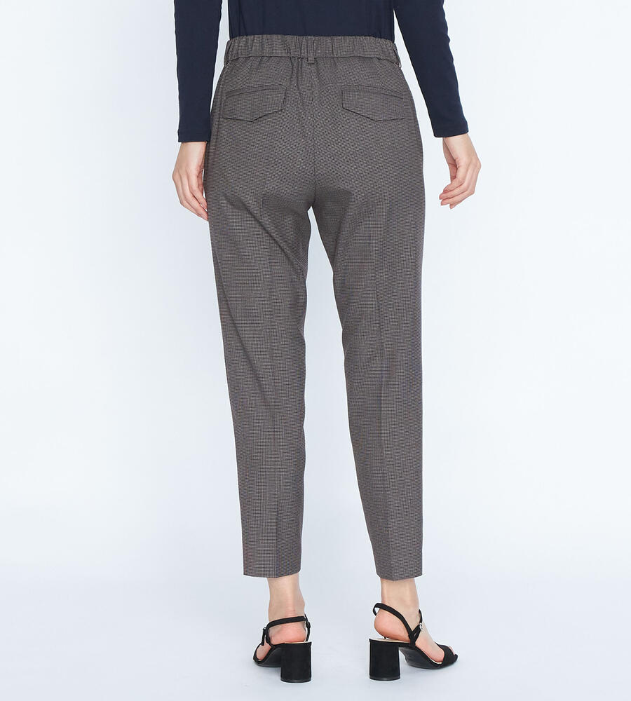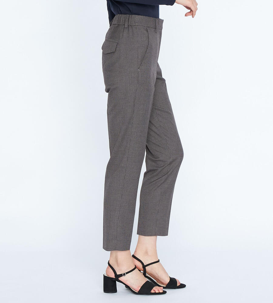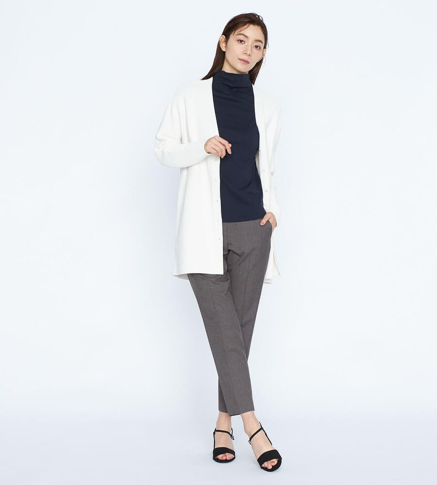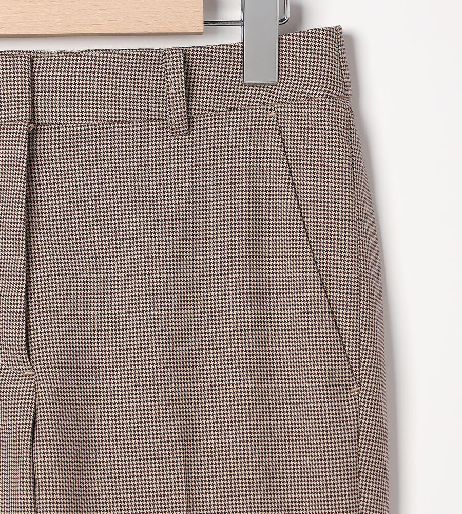 トラディショナルな雰囲気漂うガンクラブチェックのストレッチパンツ。脚のラインをすっきりと見せるセンタープレス、裾に向かってスリムになるテーパードシルエットで仕上げました。バックウエストがゴム仕様になったストレスフリーな履き心地もポイントです。細やかな模様でさりげない華やかさを添えています。