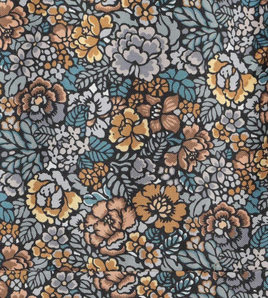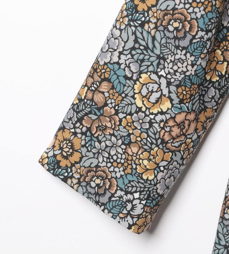 落ち着いた色味のガーデンリバティプリントが美しいワンピース。ウエスト切り替え部分にタックをあしらい、裾に向かって優美に広がるフレアシルエットでエレガントに仕上げています。軽やかな七分袖がグッドバランス。1枚で主役スタイルに。
