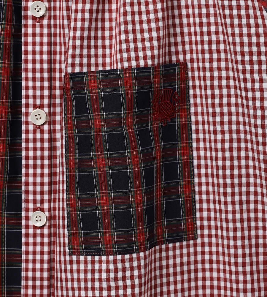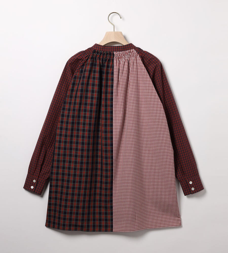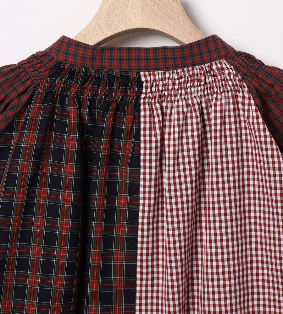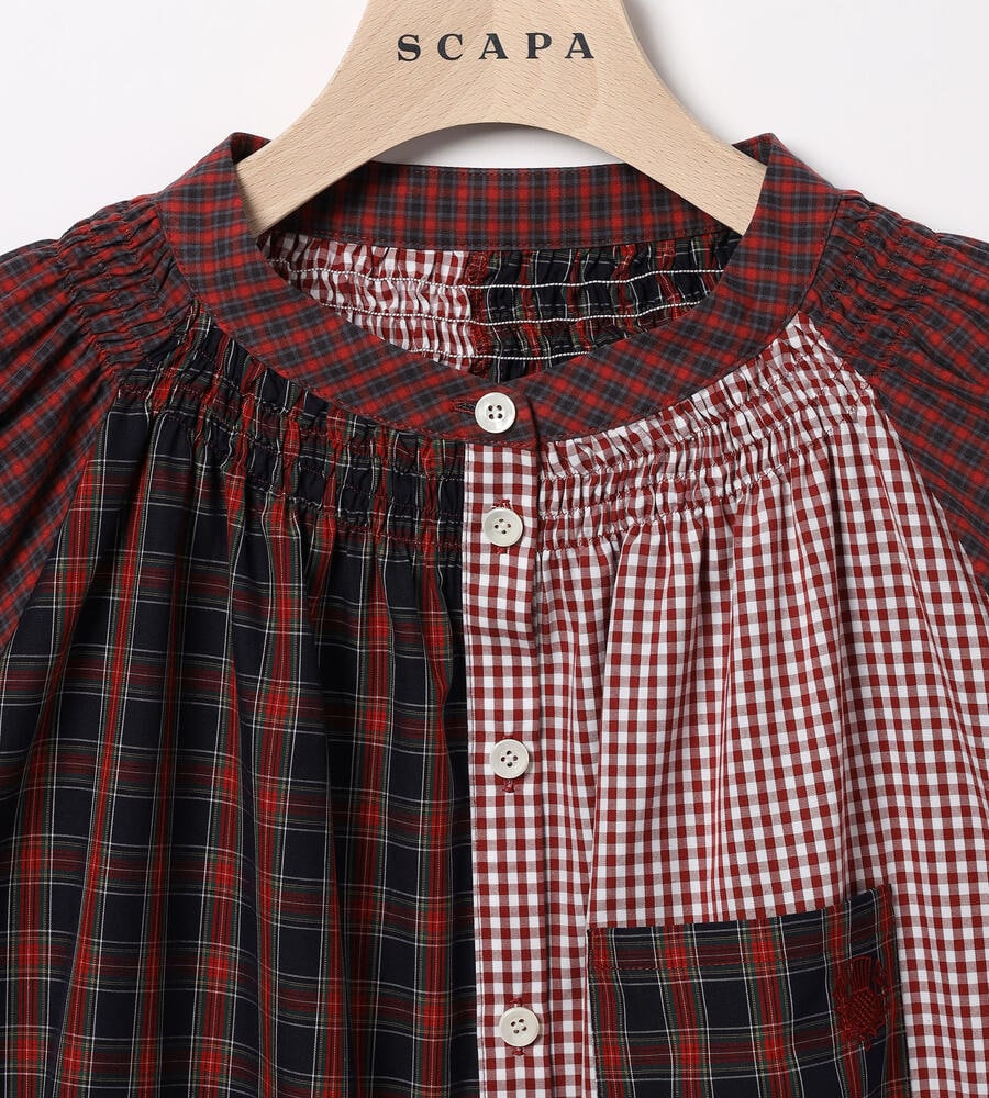 ネック下のギャザーにより、ふわっとした愛らしいシルエットに仕上がった前開きの長袖シャツ。さまざまなチェック柄を組み合わせた、クレイジーパターンのパッチワークデザインとなっています。トラッドなエッセンスを効かせつつ、まるでスリープウェアのようなリラックス感もあって、一枚でしっかりと主張を放つアイテムです。軽いコットン素材で快適に着用できます。