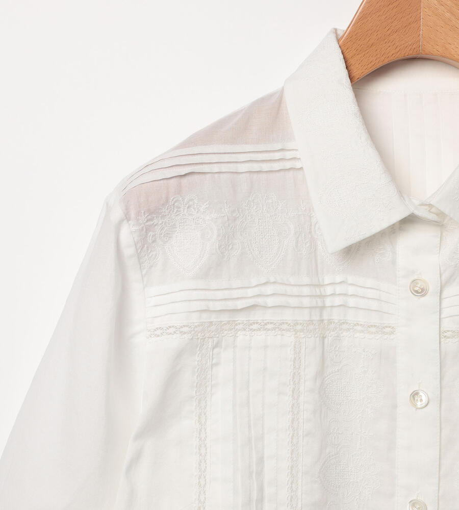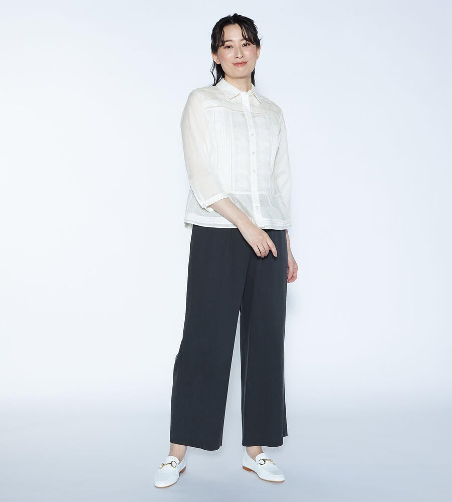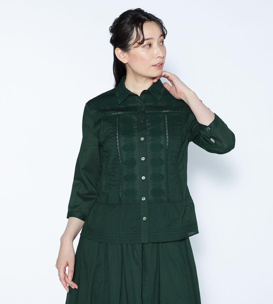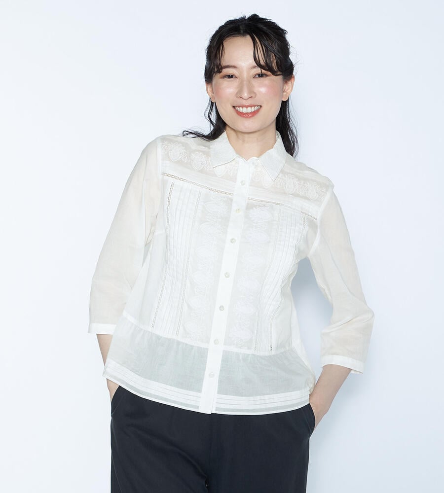 薄手の素材で春夏らしい軽やかなムードのコットンローン生地で仕立てた七分袖ブラウス。刺繍、タック、裾フレアのデザインがエレガントなデザインポイント。ほどよいハリ感と光沢感のある生地で、美しいシルエットを実現。透け感のある生地で、おしゃれな重ね着コーディネートが実現するアイテムです。