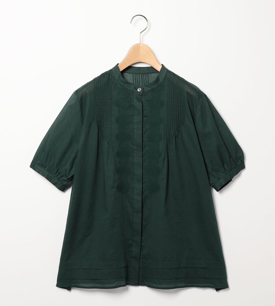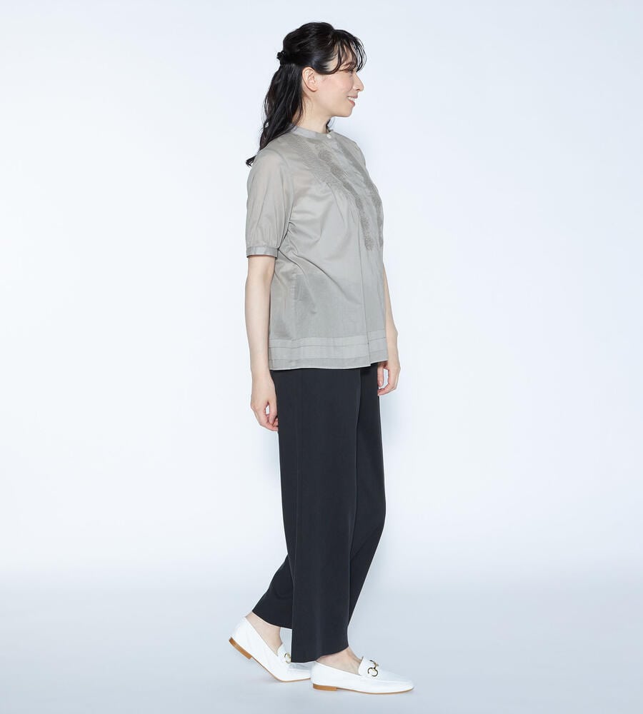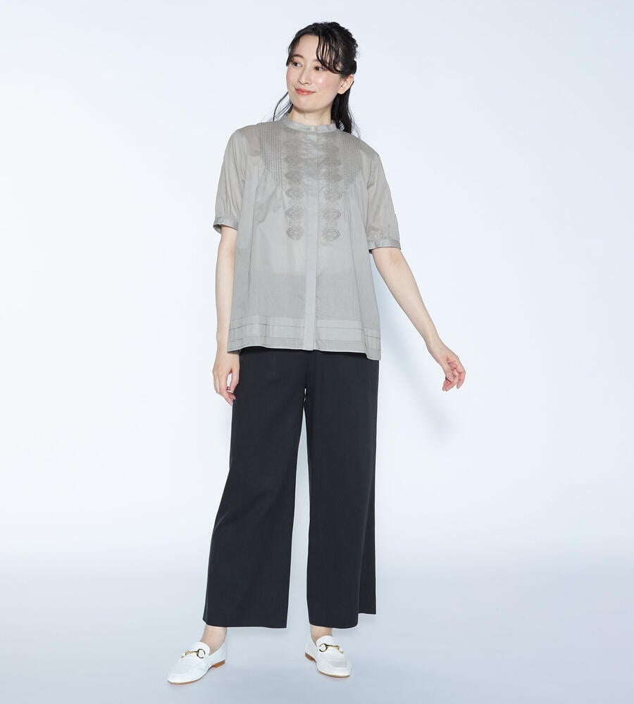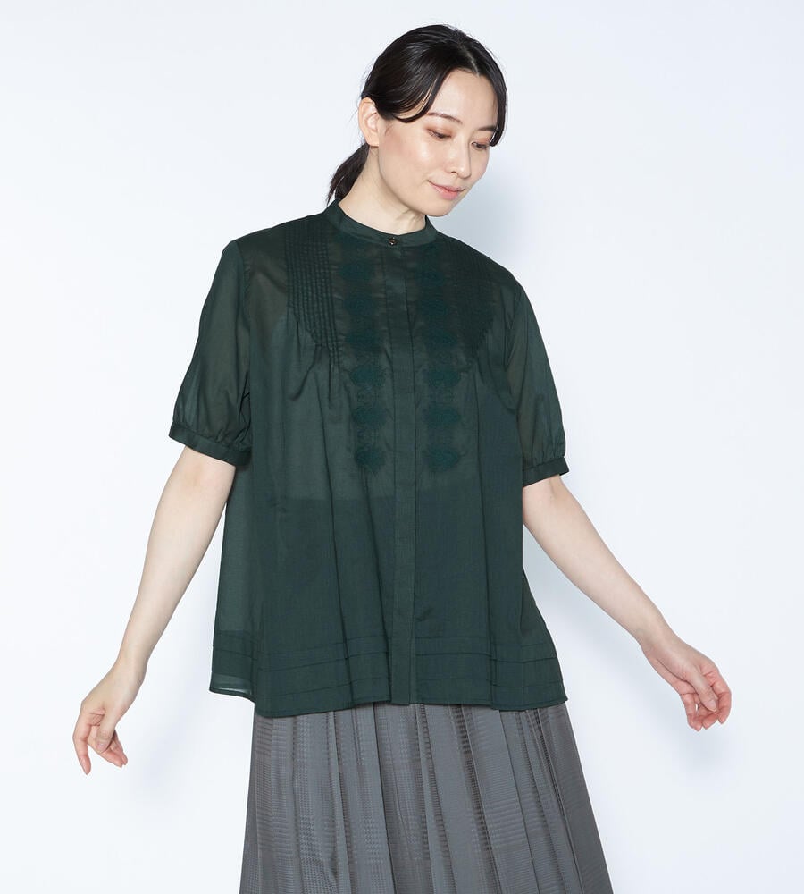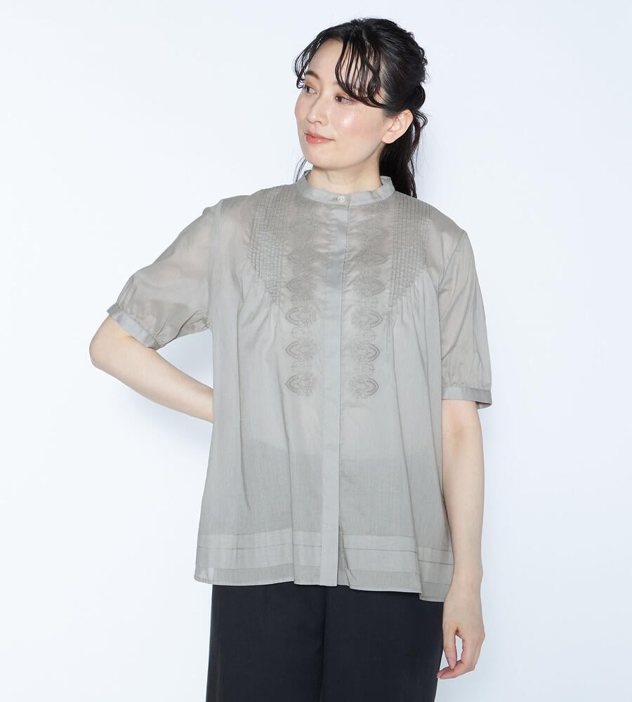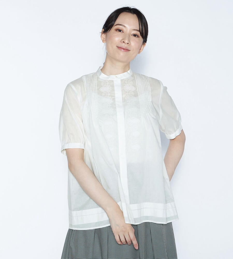 薄手の素材で春夏らしい軽やかなムードのコットンローン生地で仕立てた五分袖ブラウス。刺繍、タック、裾フレアのデザインがエレガントなデザインポイント。ほどよいハリ感と光沢感のある生地で、美しいシルエットを実現。透け感のある生地で、おしゃれな重ね着コーディネートが実現するアイテムです。