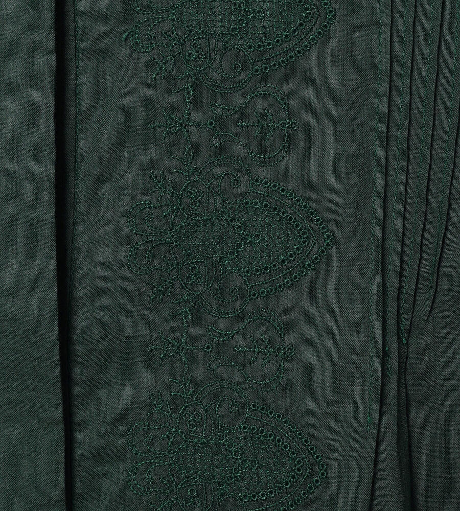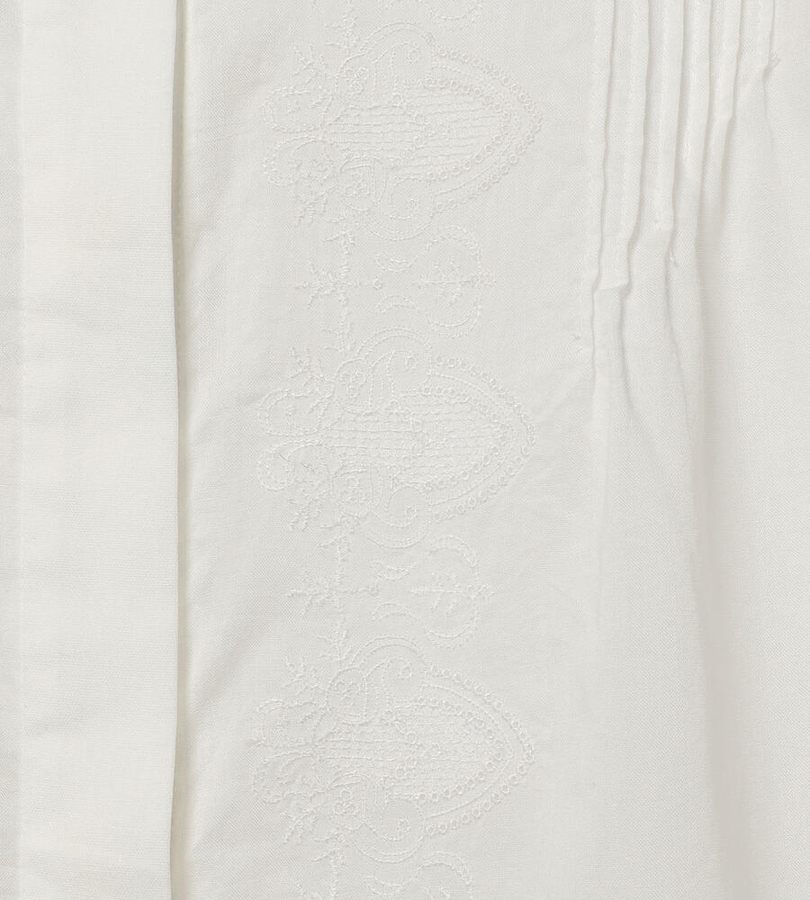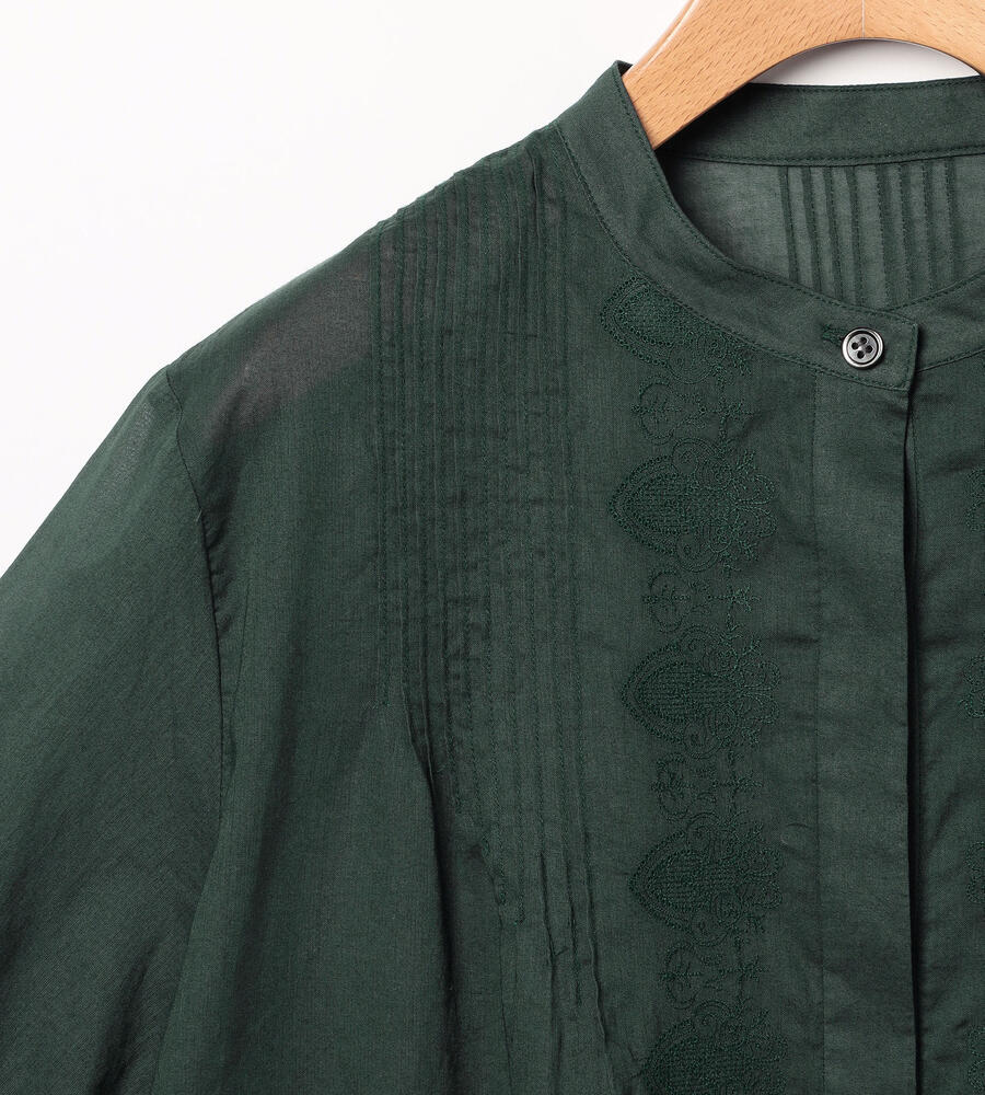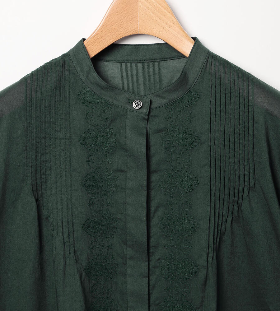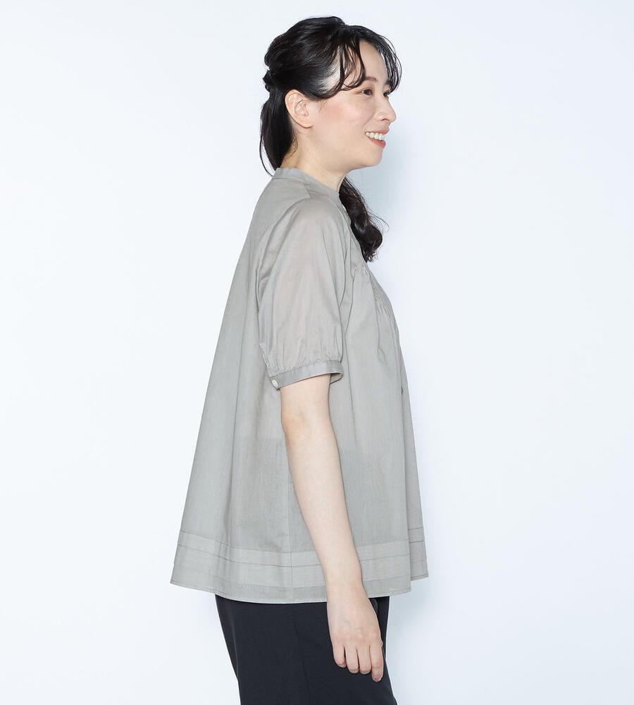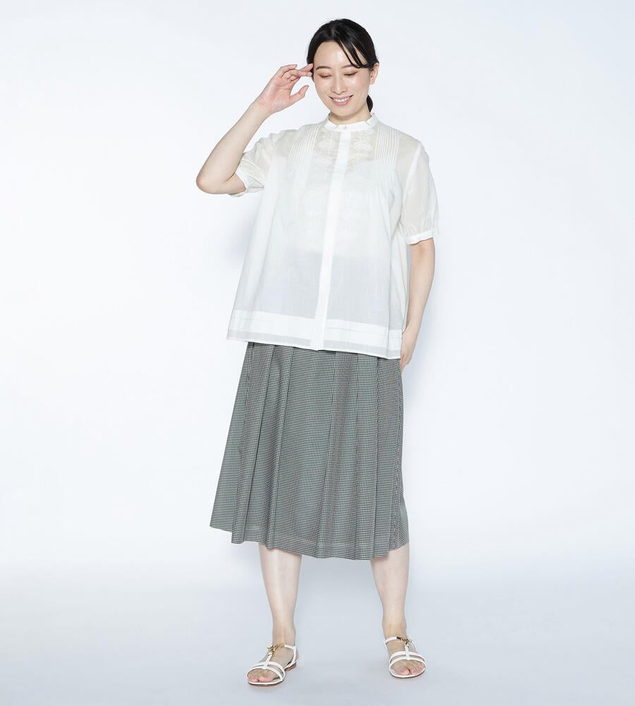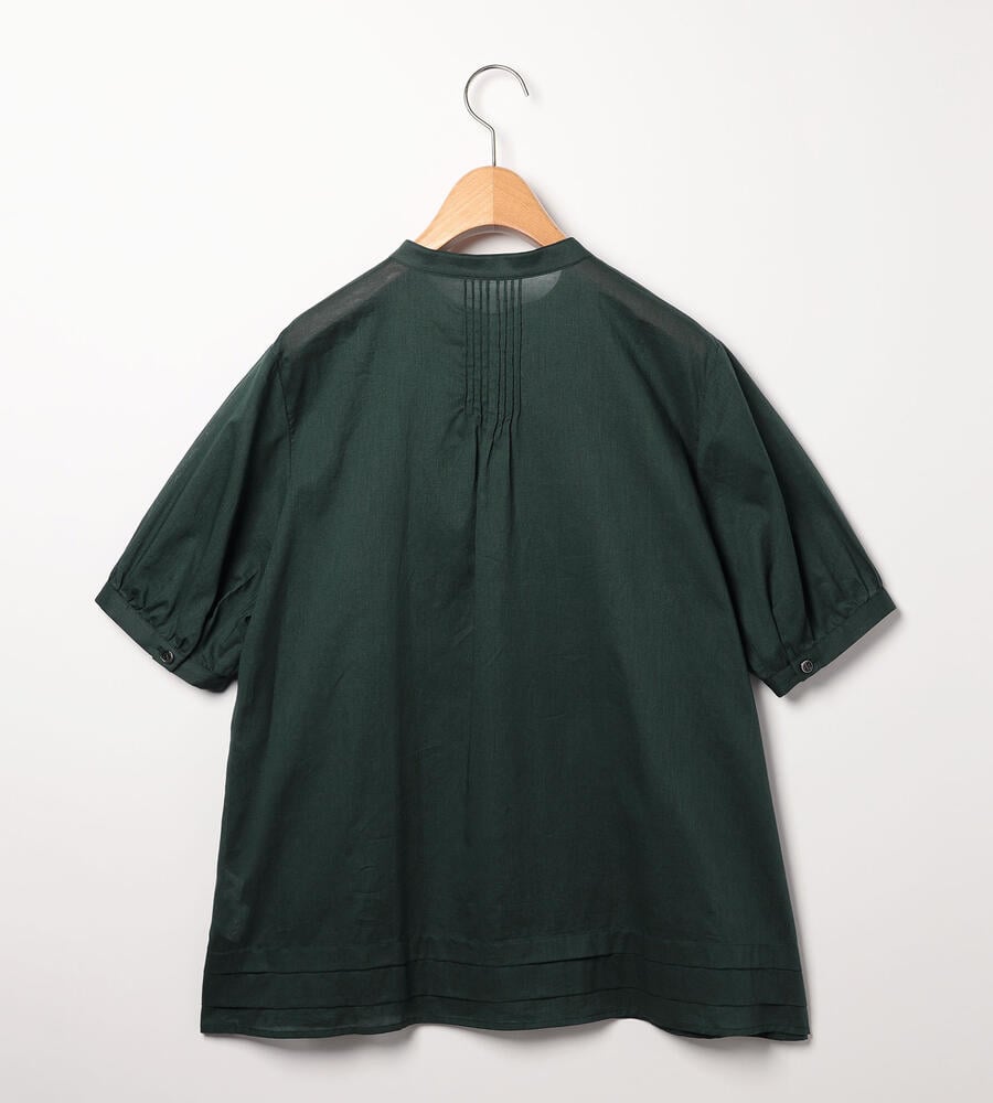 薄手の素材で春夏らしい軽やかなムードのコットンローン生地で仕立てた五分袖ブラウス。刺繍、タック、裾フレアのデザインがエレガントなデザインポイント。ほどよいハリ感と光沢感のある生地で、美しいシルエットを実現。透け感のある生地で、おしゃれな重ね着コーディネートが実現するアイテムです。