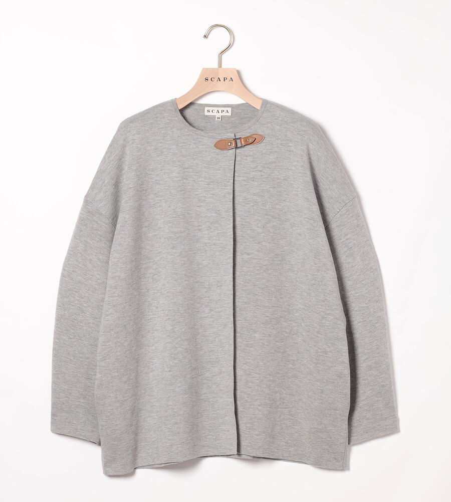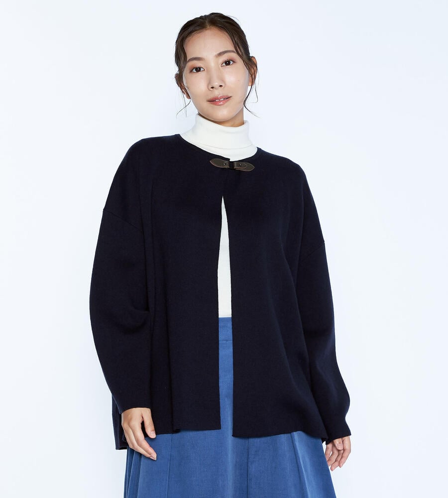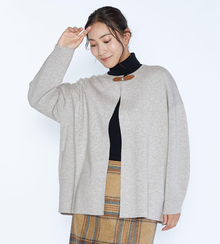 秋冬シーズンのコーディネートで重宝する長袖ニットジャケット。ノーカラーのすっきりとした首周りで様々なトップスと好相性。首元のレザー風ミニベルトの留め具がスタイリッシュなデザインアクセント。ゆとりのあるシルエットと袖も今年らしいポイント。シンプルなデザインで様々な着こなしにマッチするアイテムです。
