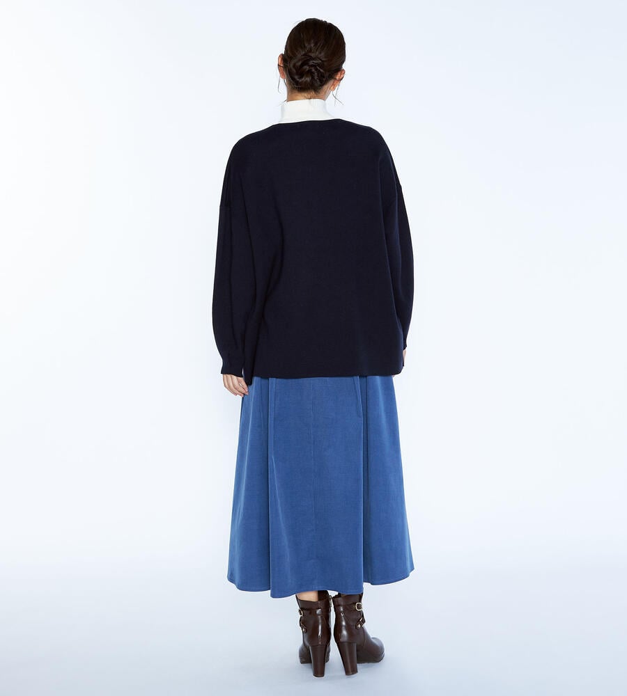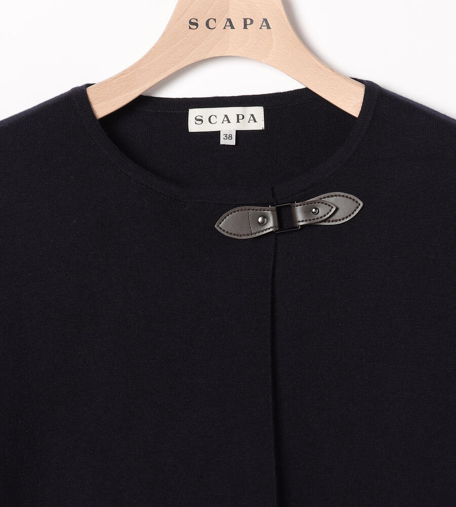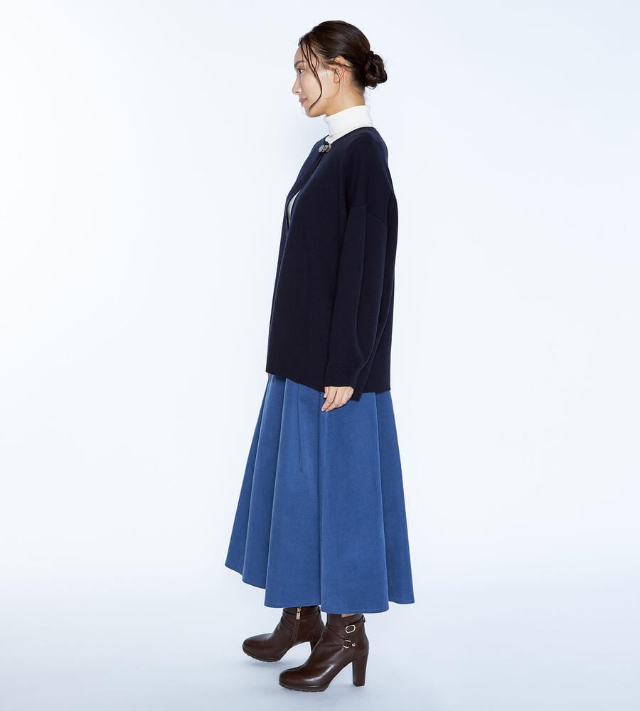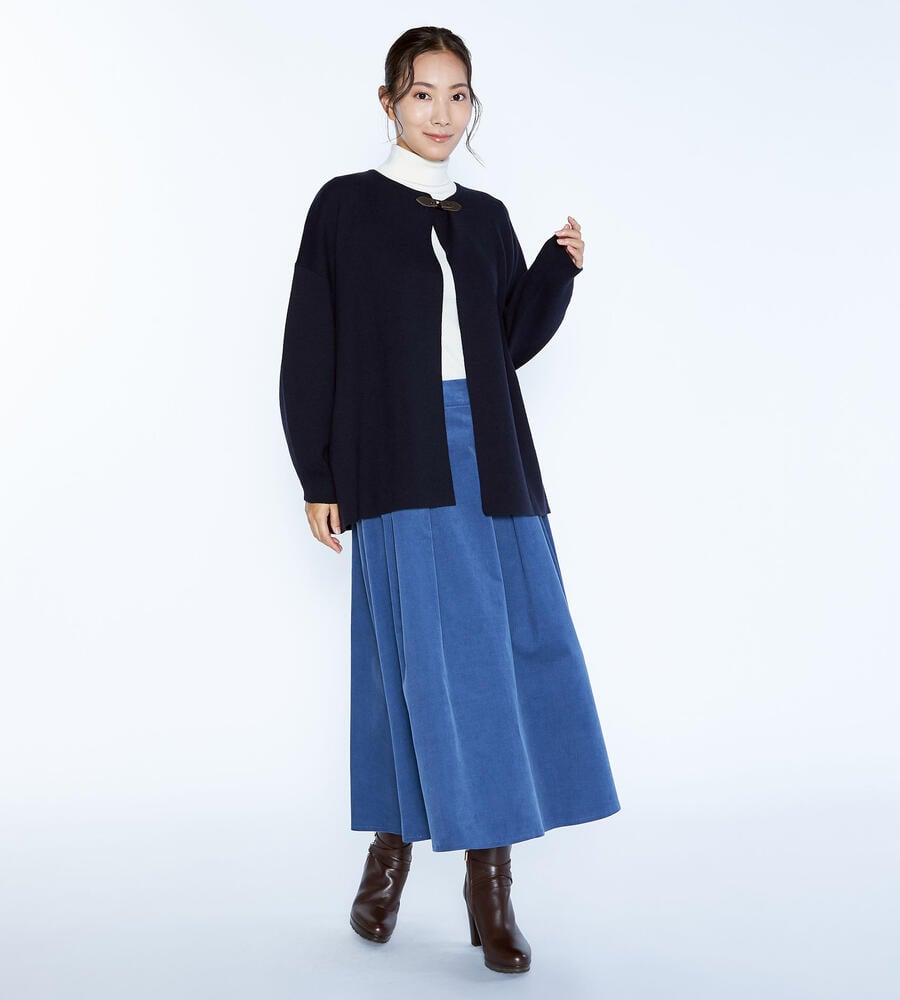 秋冬シーズンのコーディネートで重宝する長袖ニットジャケット。ノーカラーのすっきりとした首周りで様々なトップスと好相性。首元のレザー風ミニベルトの留め具がスタイリッシュなデザインアクセント。ゆとりのあるシルエットと袖も今年らしいポイント。シンプルなデザインで様々な着こなしにマッチするアイテムです。