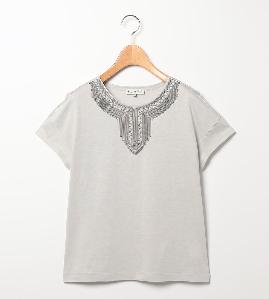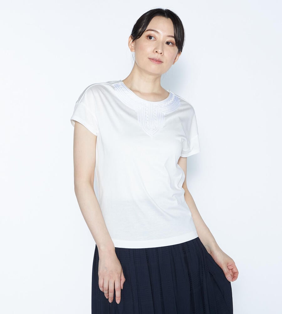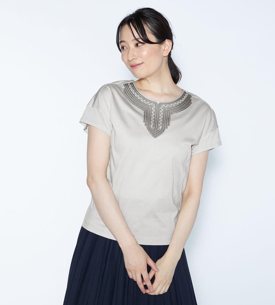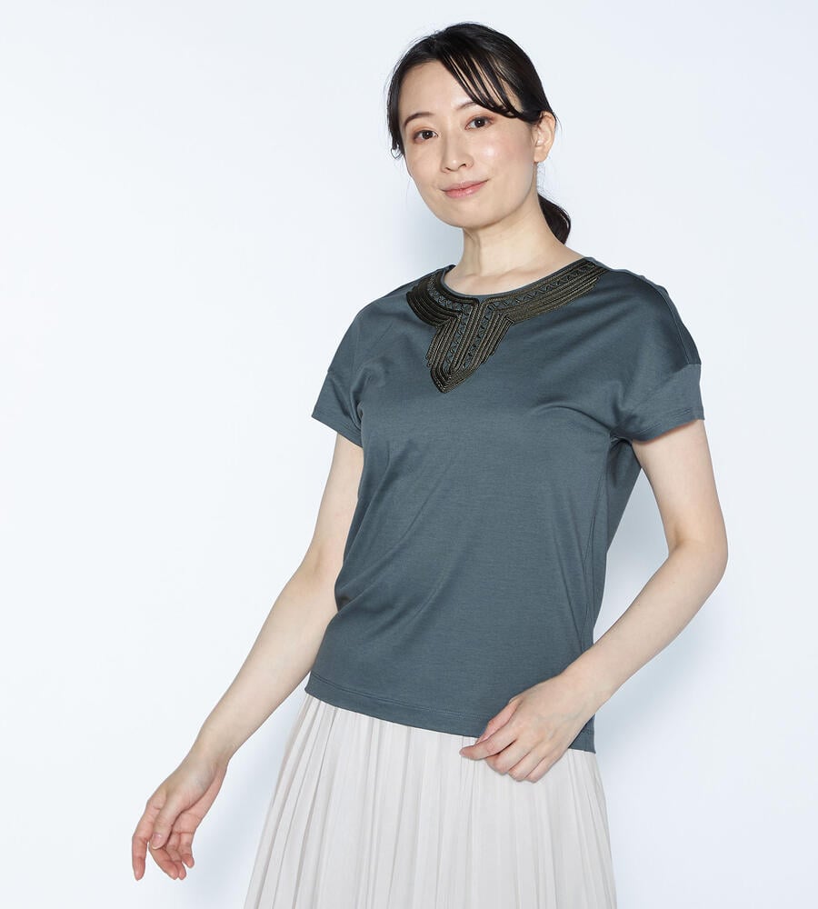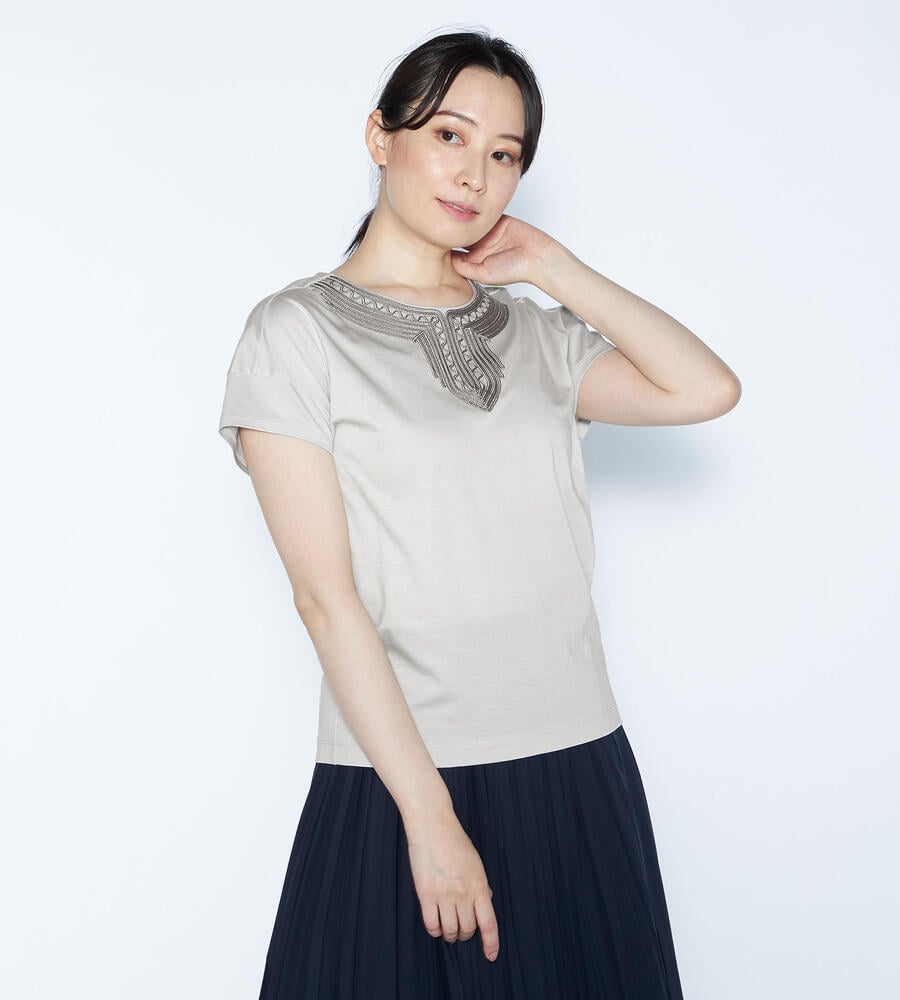 スムースでなめらかな天竺素材で仕立てた、ミニフレンチスリーブカットソー。適度に光沢感のある生地がエレガントなムードを演出します。首回りのエキゾチックなコード刺繍がおしゃれなデザインアクセント。すっきりコンパクトなシルエットで、様々なボトムとマッチ。毎日の着こなしで活躍するアイテムです。
