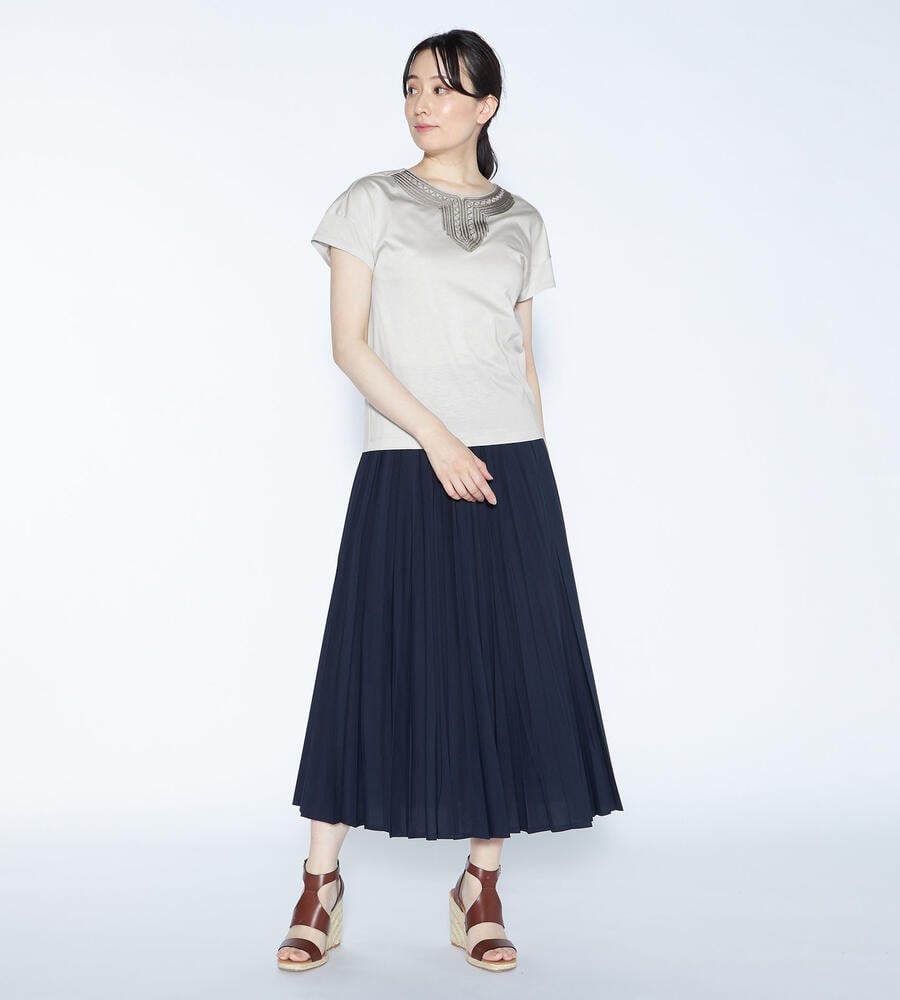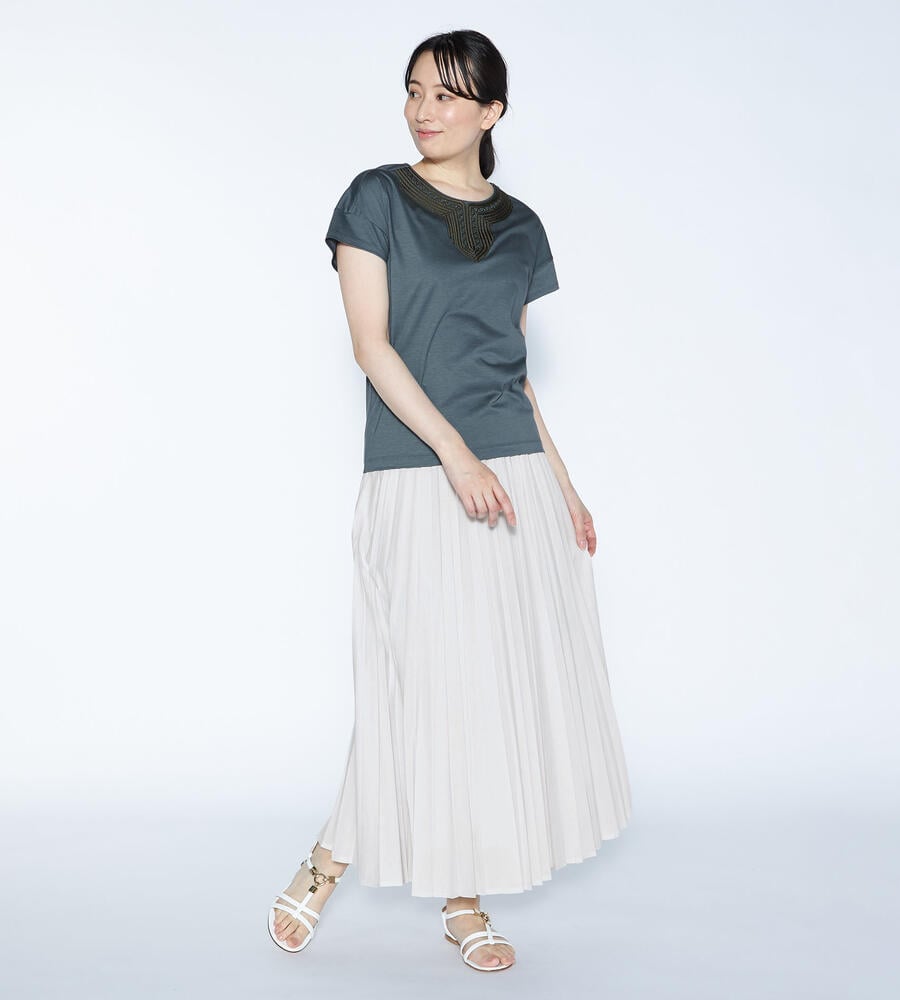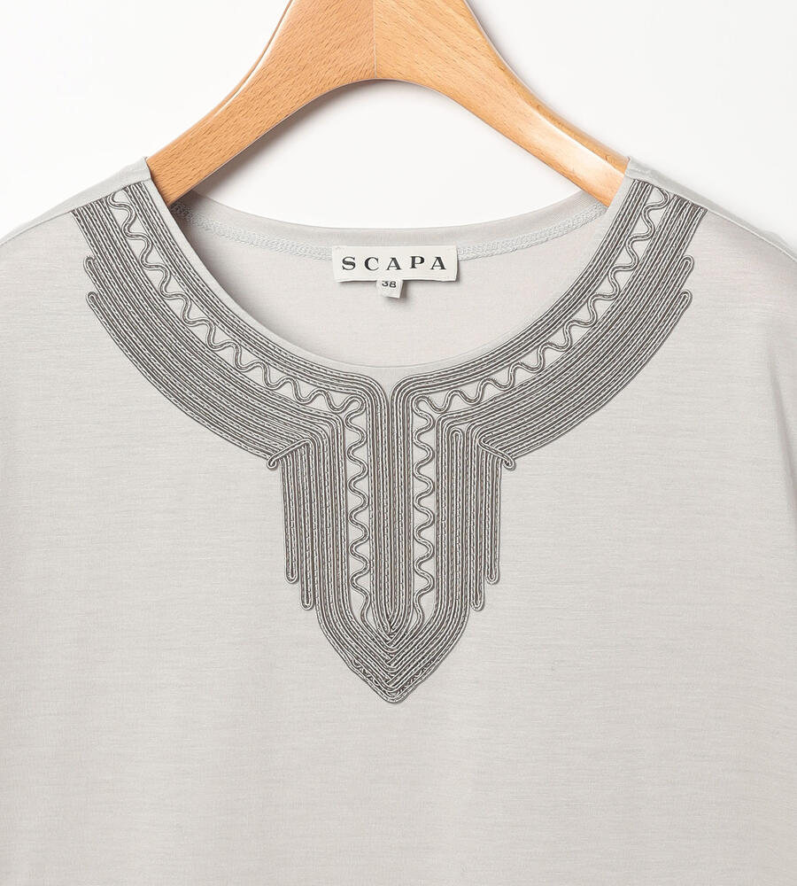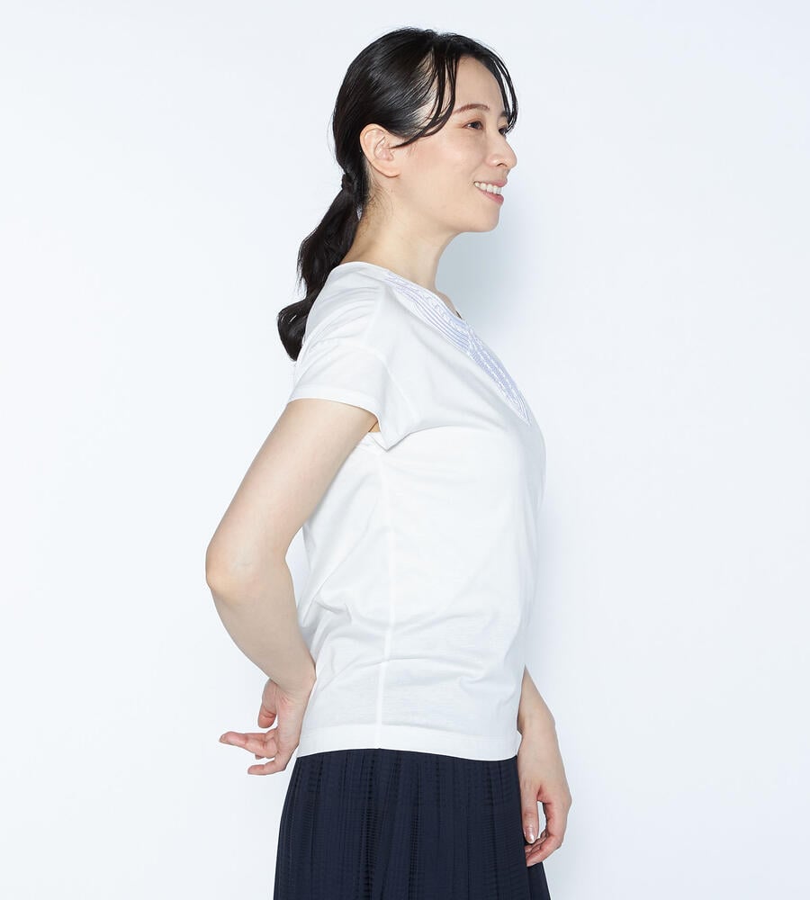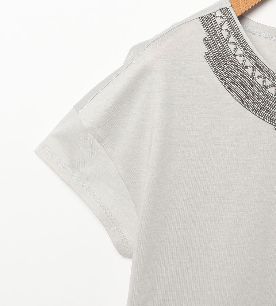 スムースでなめらかな天竺素材で仕立てた、ミニフレンチスリーブカットソー。適度に光沢感のある生地がエレガントなムードを演出します。首回りのエキゾチックなコード刺繍がおしゃれなデザインアクセント。すっきりコンパクトなシルエットで、様々なボトムとマッチ。毎日の着こなしで活躍するアイテムです。