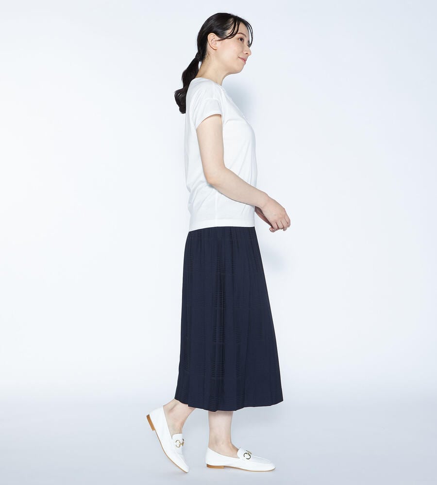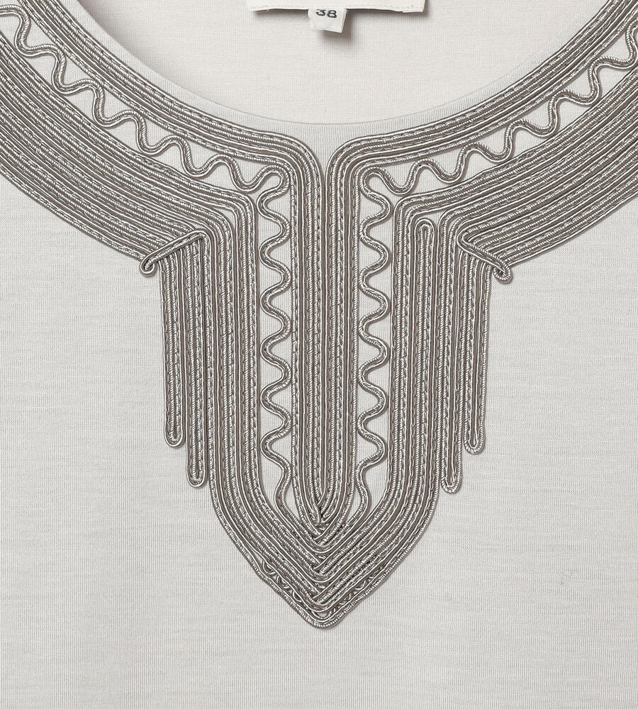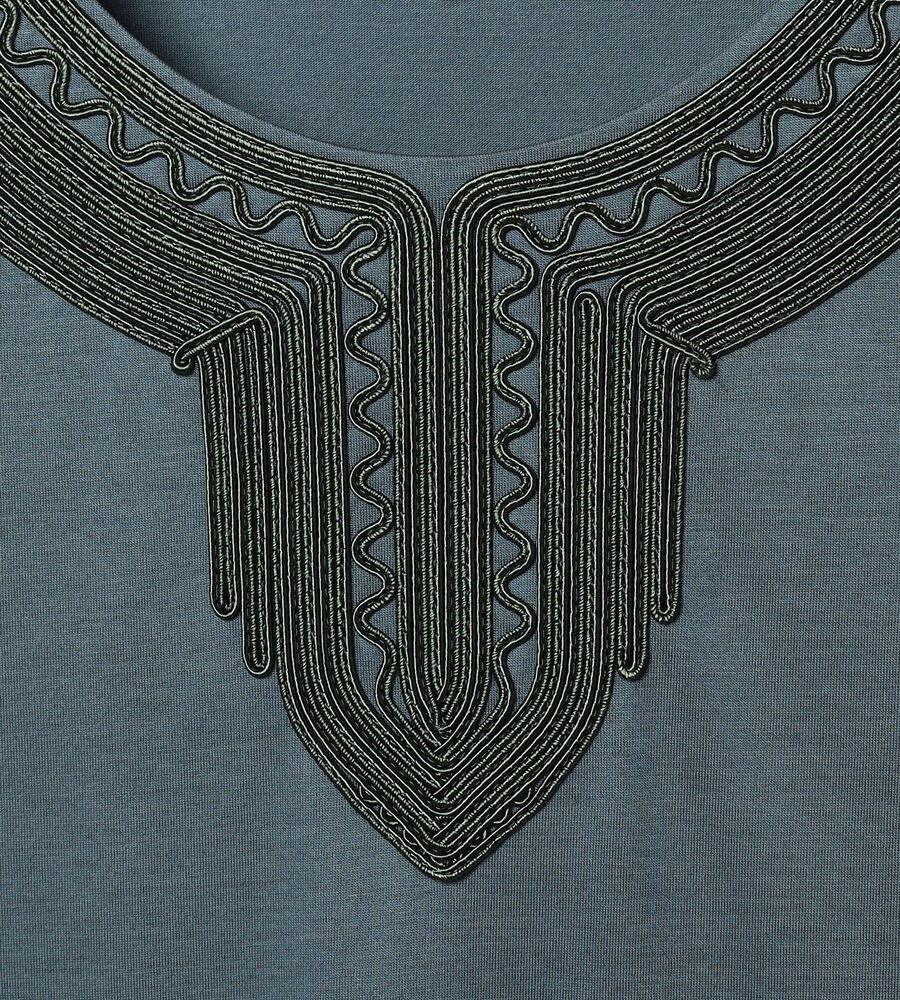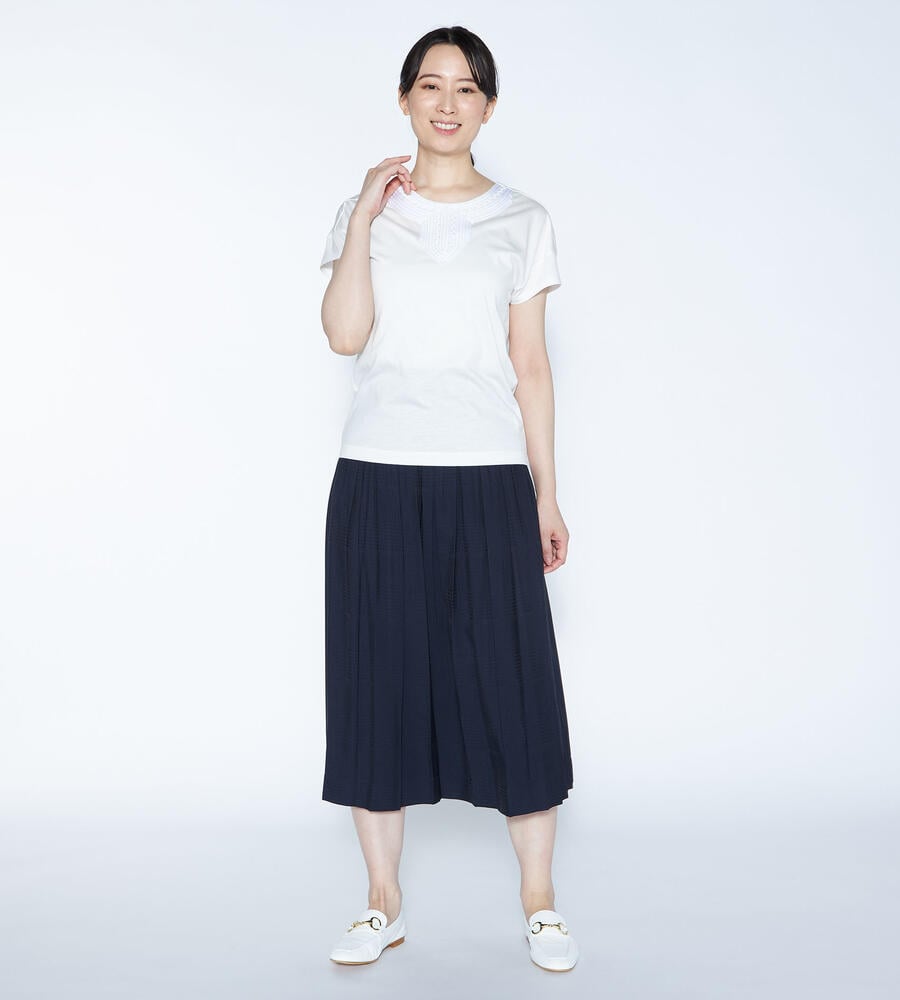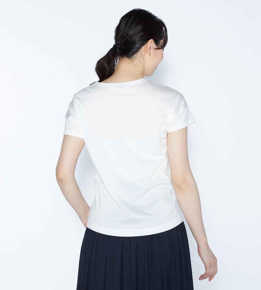 スムースでなめらかな天竺素材で仕立てた、ミニフレンチスリーブカットソー。適度に光沢感のある生地がエレガントなムードを演出します。首回りのエキゾチックなコード刺繍がおしゃれなデザインアクセント。すっきりコンパクトなシルエットで、様々なボトムとマッチ。毎日の着こなしで活躍するアイテムです。