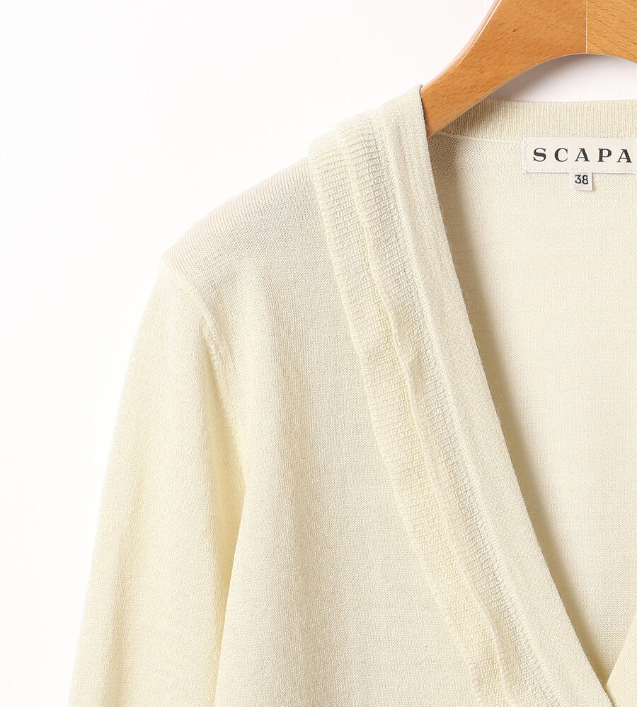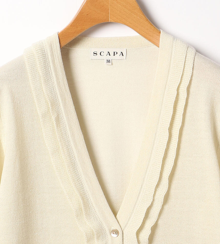 首周りにフリルを配し、女性らしい印象に仕上げたVネックニットカーディガン。シンプルな無地ながら、近くで見ると繊細なラメ糸がさりげなく煌めきます。袖口と裾にもリブやラインを配すなど、細部までこだわりが感じられる丁寧な仕上がり。適度な薄地で扱いやすく、一枚あると幅広い季節のコーディネートに重宝します。