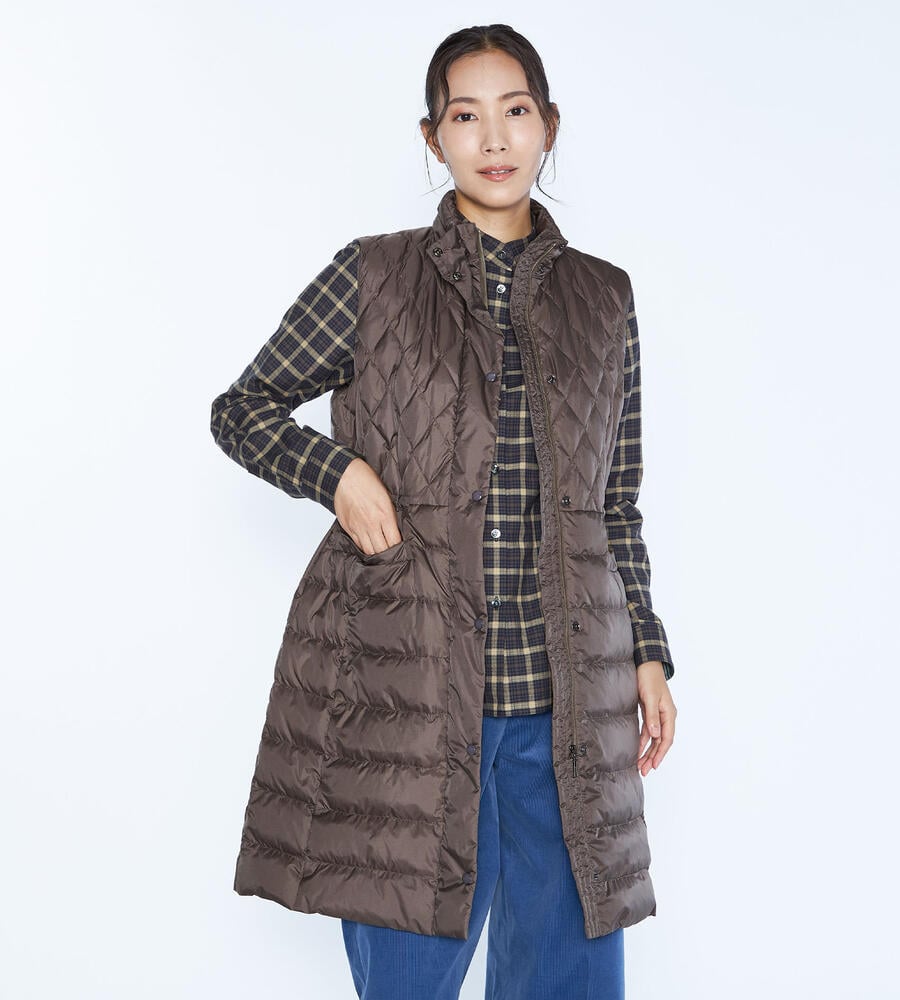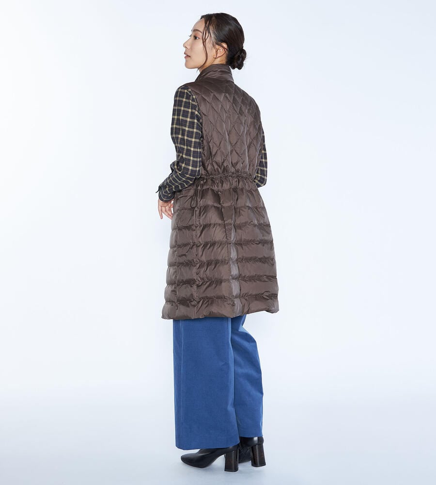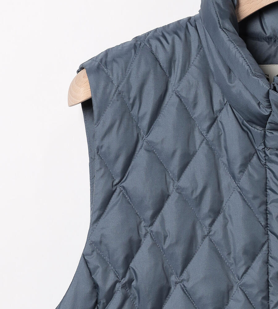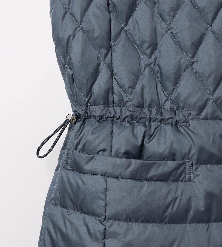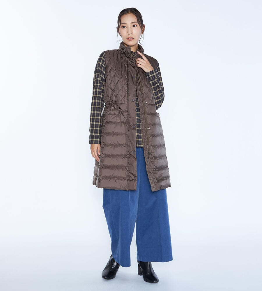 ダイヤ柄とボーダー柄のキルトを用いて、表情豊かに仕上げたベスト。ダウンとフェザーを用いており、軽いながらも暖かな着心地を味わえます。インに厚手のものを合わせやすいよう、アームホールを広く開けているのもポイント。ウエストをぎゅっと絞ることで、フェミニンな着こなしを楽しめます。