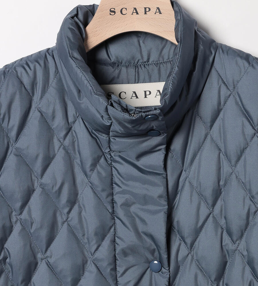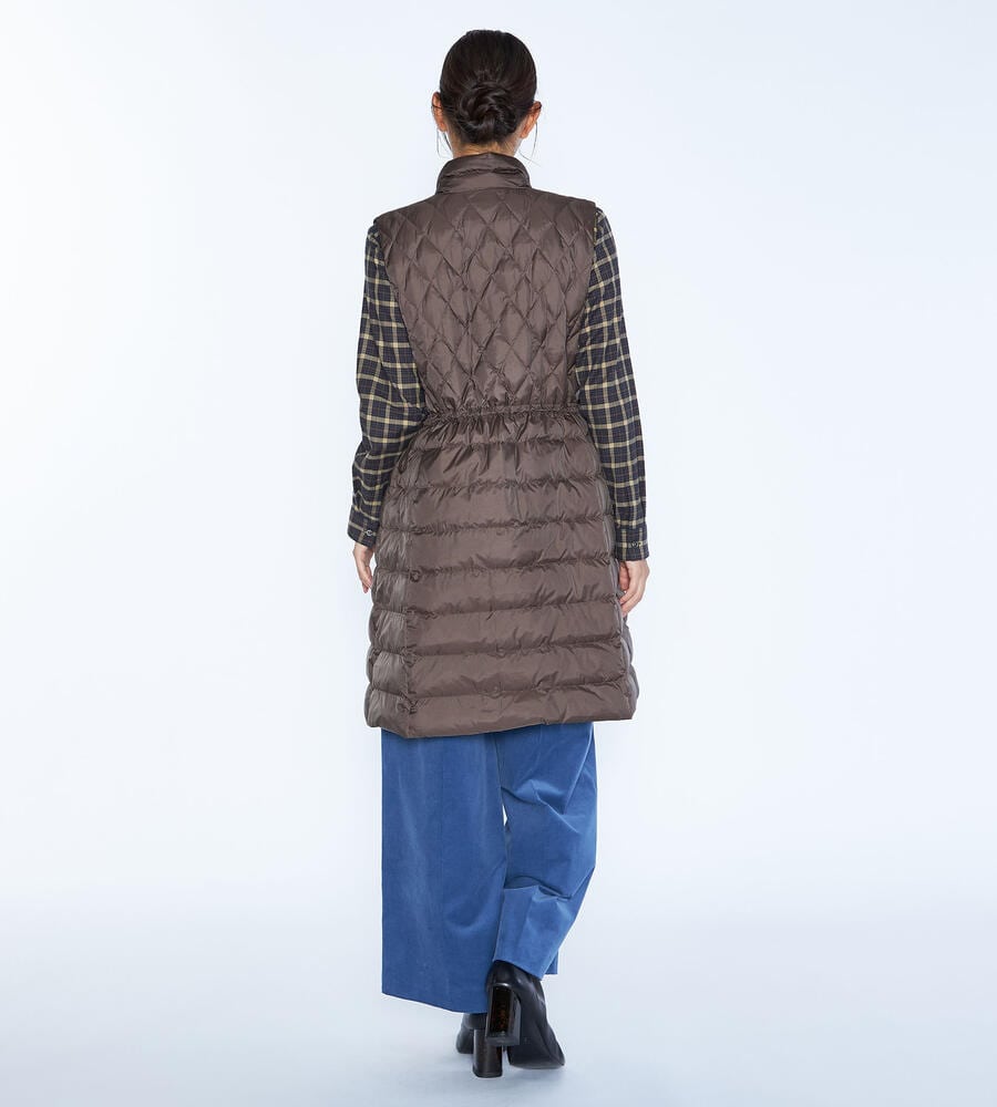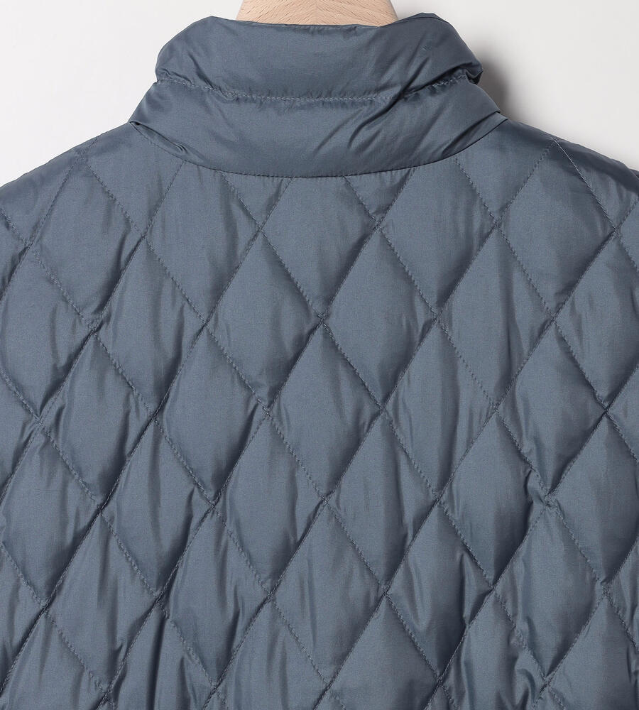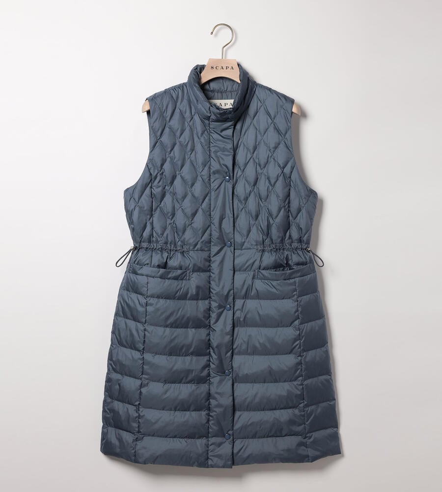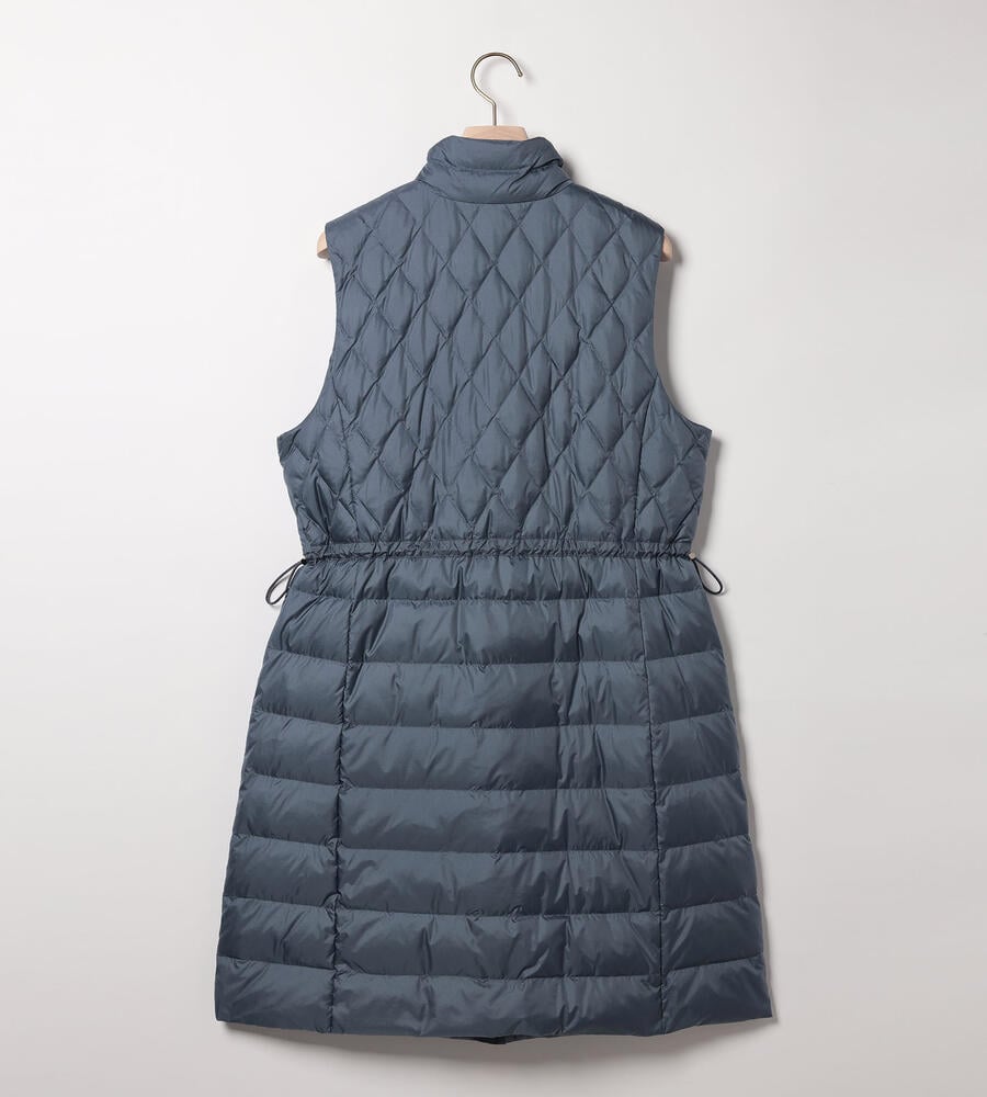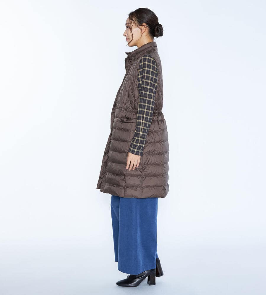 ダイヤ柄とボーダー柄のキルトを用いて、表情豊かに仕上げたベスト。ダウンとフェザーを用いており、軽いながらも暖かな着心地を味わえます。インに厚手のものを合わせやすいよう、アームホールを広く開けているのもポイント。ウエストをぎゅっと絞ることで、フェミニンな着こなしを楽しめます。