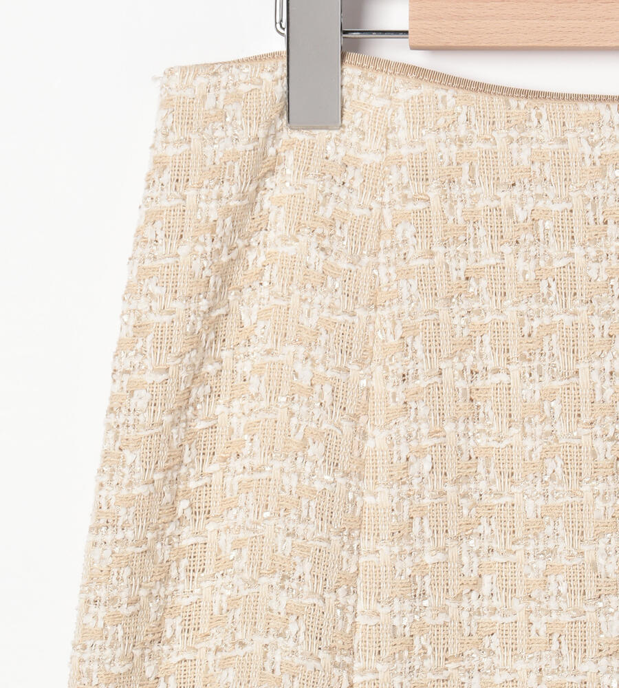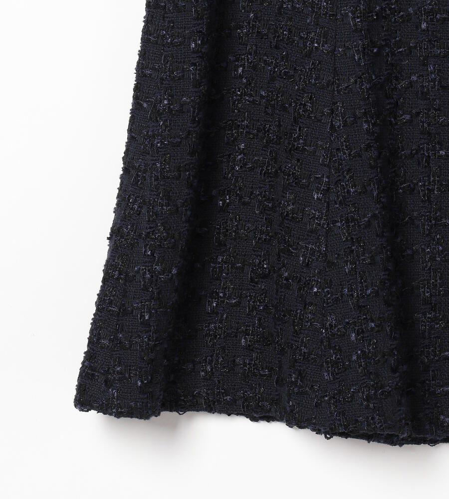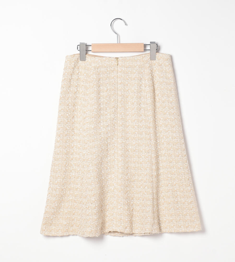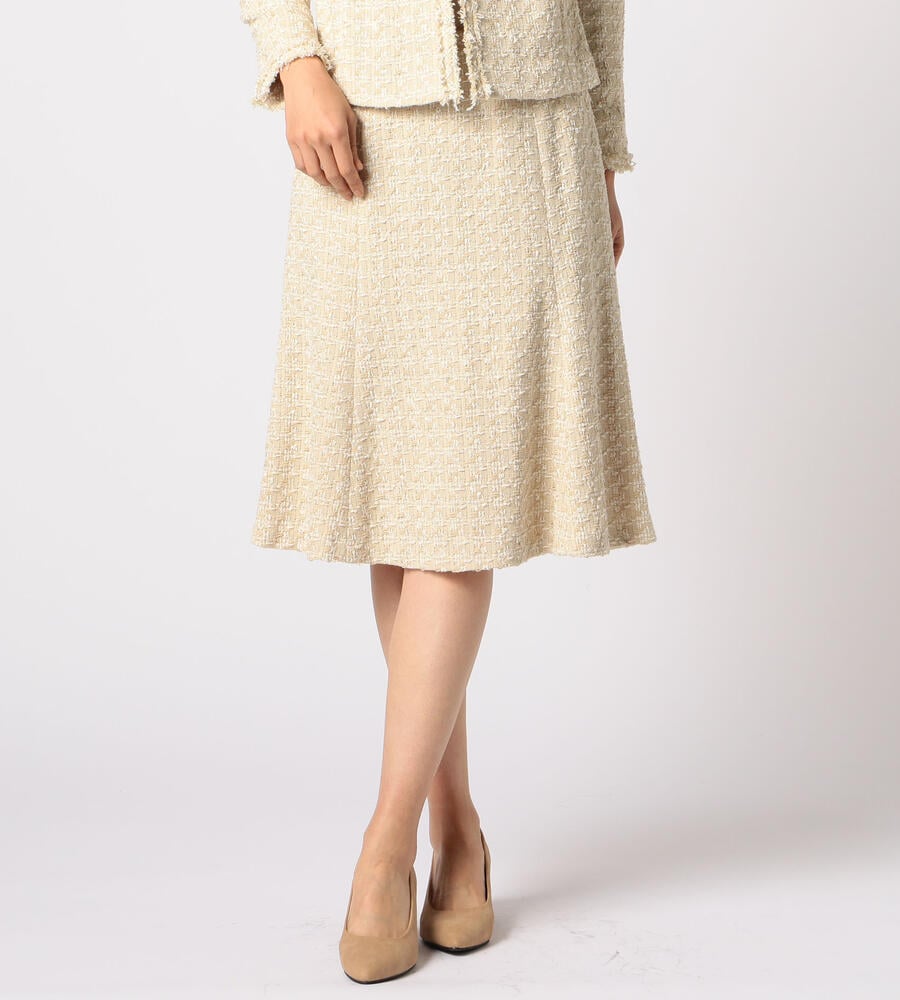 裾に向かってゆるやかに広がるフレアシルエットが美しいスカート。品の良いラメ糸を織り込んだツィード風素材がレディなスタイルを叶えます。バックジップクロージャーで着脱もスムーズ。同素材のジャケットとセットアップで着こなすと、より洗練されたムードに。