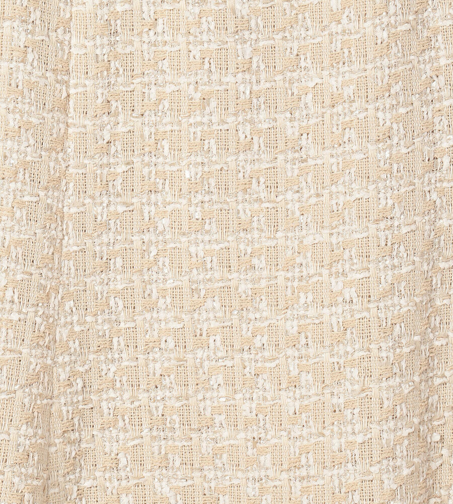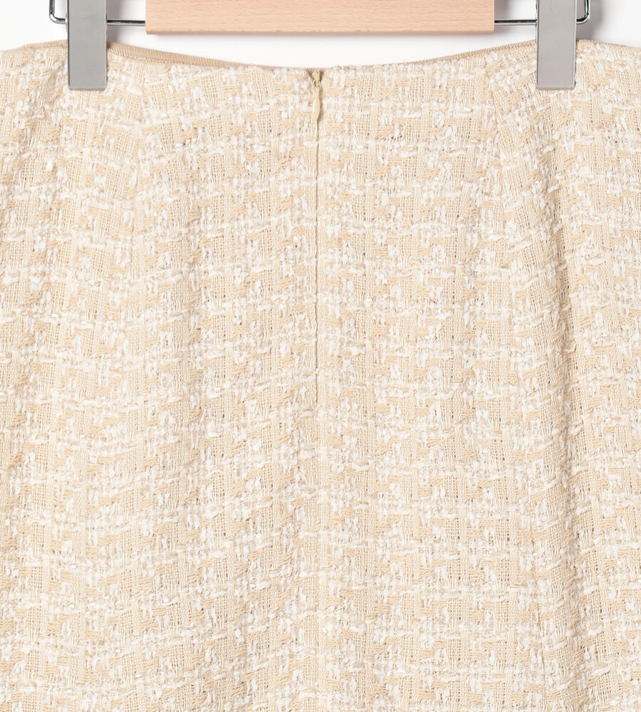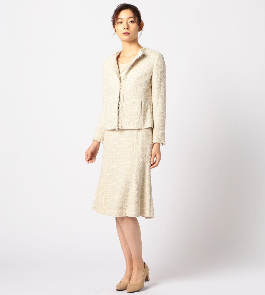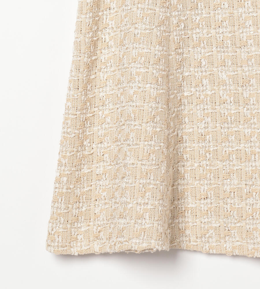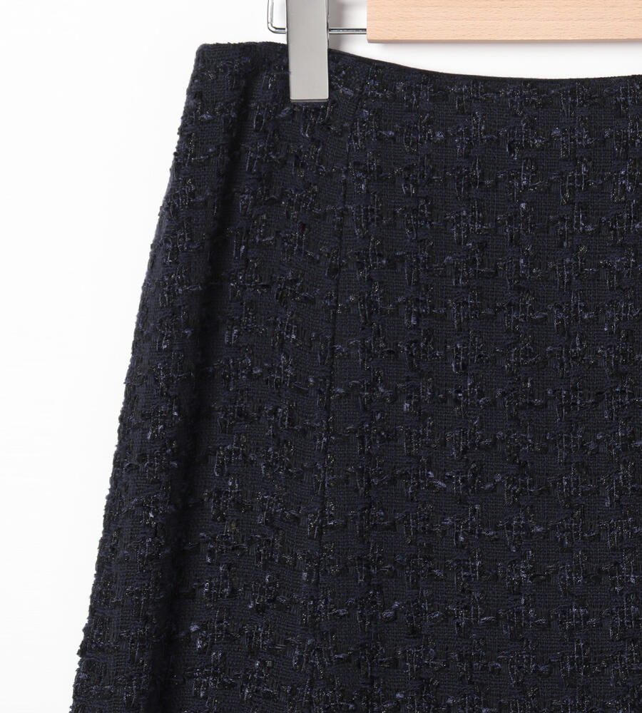 裾に向かってゆるやかに広がるフレアシルエットが美しいスカート。品の良いラメ糸を織り込んだツィード風素材がレディなスタイルを叶えます。バックジップクロージャーで着脱もスムーズ。同素材のジャケットとセットアップで着こなすと、より洗練されたムードに。