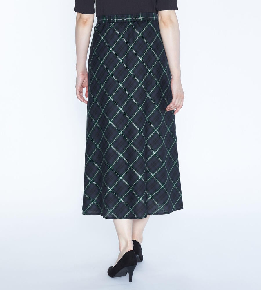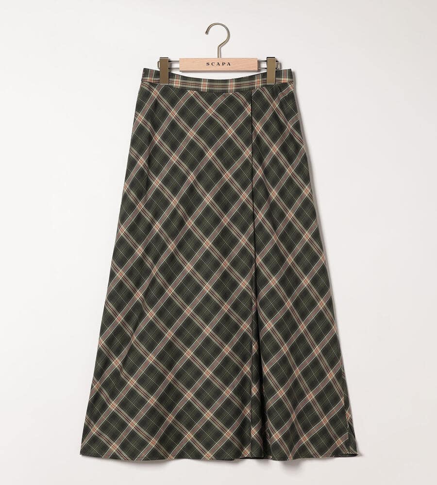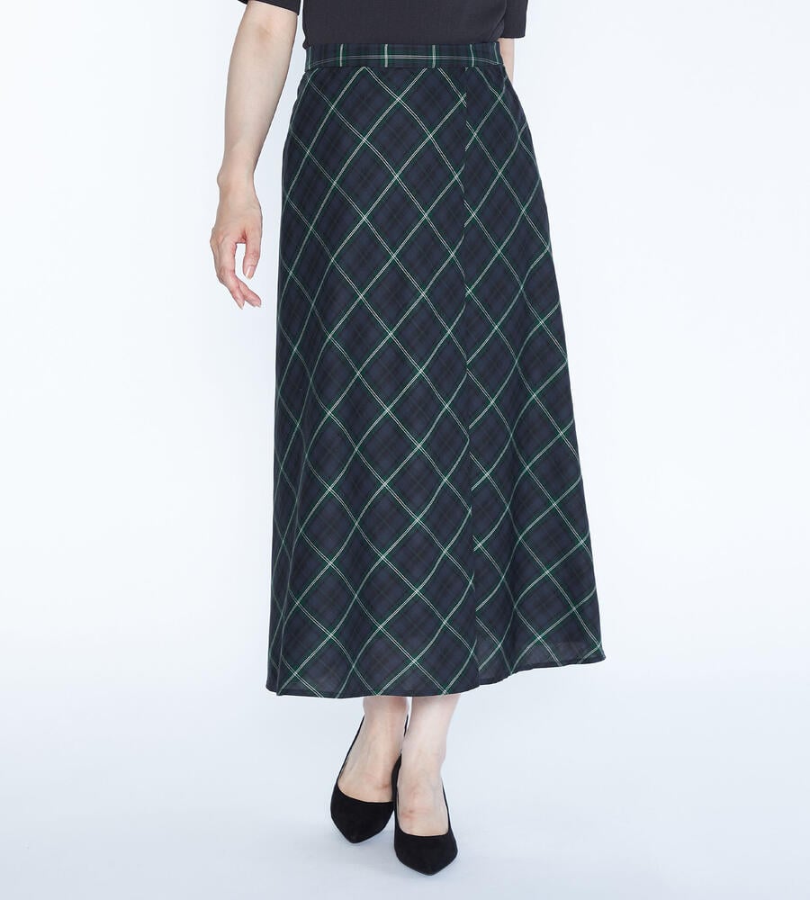 トラッド感とモードな雰囲気のバランスが良いバイアスチェック柄のスカート。左前にタックを施したキルト風のシルエットです。風合いは柔らかく、ドレープや揺れ感がきれいに出て女性らしさが引き立ちます。上品に穿きこなせる長めの丈感。後ろウエストにゴムが入り、フィット感良く身に着けられます。