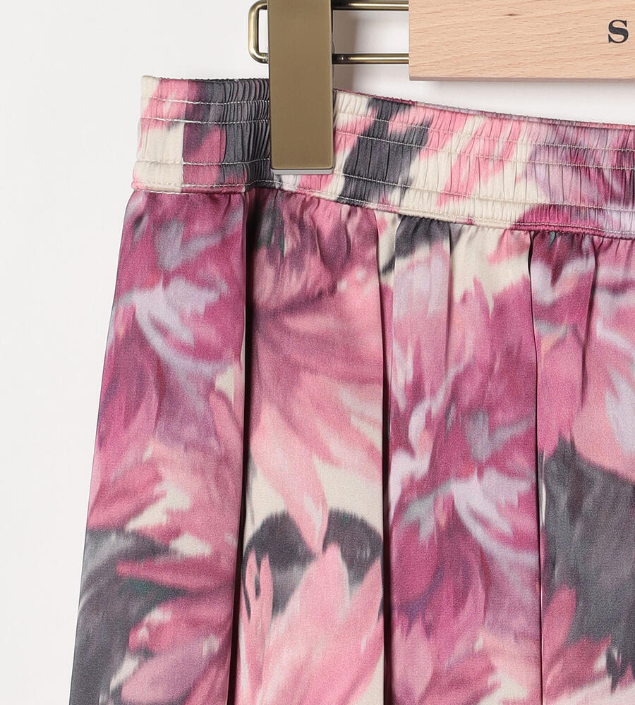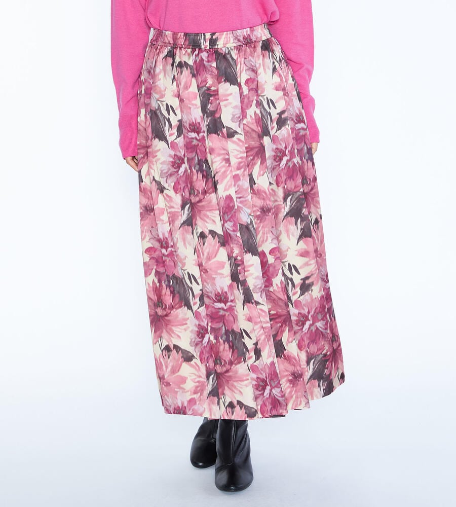 華やかなカラー使いが気分を高めてくれるフラワープリントスカート。幅広プリーツが上品かつクラシカルな雰囲気をプラス。ウエストがゴム仕様になった着心地の良さが嬉しいポイント。しなやかな素材が流れるように美しいシルエットを演出します。