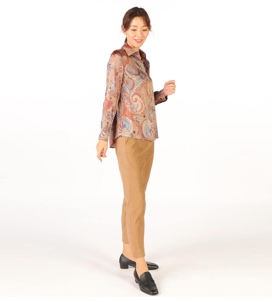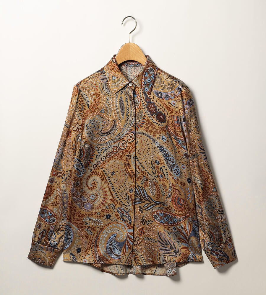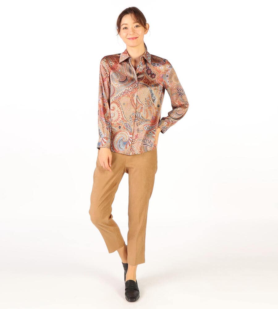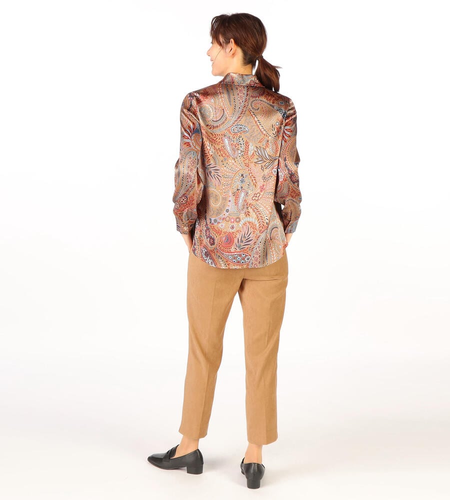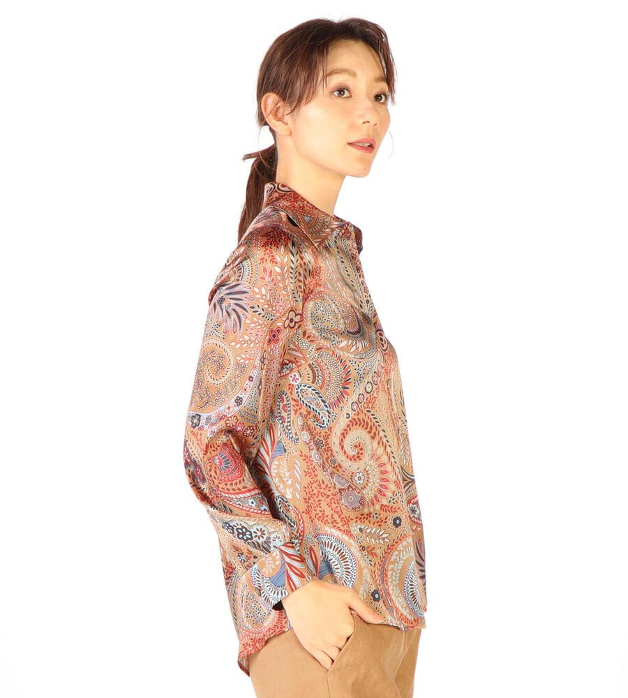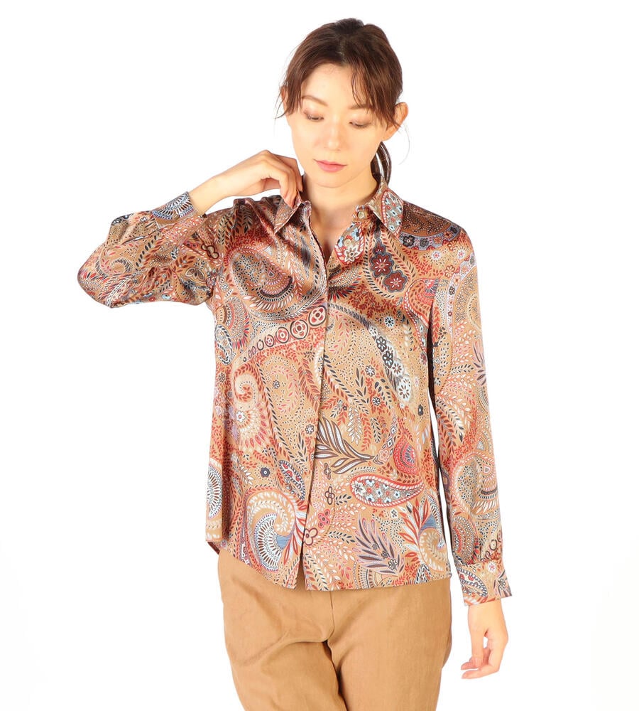 草木をモチーフにしたビンダ柄をシックなカラーで仕上げたブラウス。美しい光沢感のあるシルク混素材からエレガントなムードが溢れ出す、スペシャルな装いにぴったりのアイテムです。フロントはボタンの見えない比翼仕立てですっきりとした印象に。ウエストイン、アウト、どちらのスタイルにも対応します。