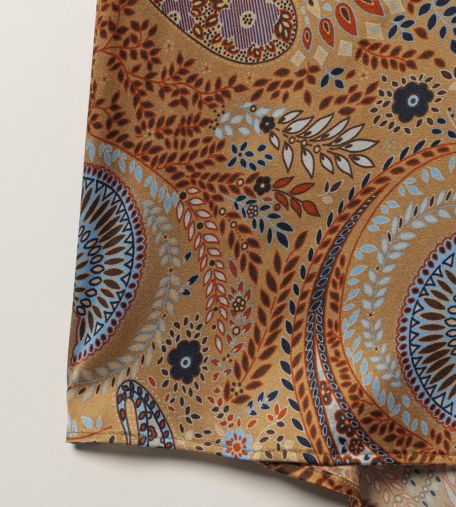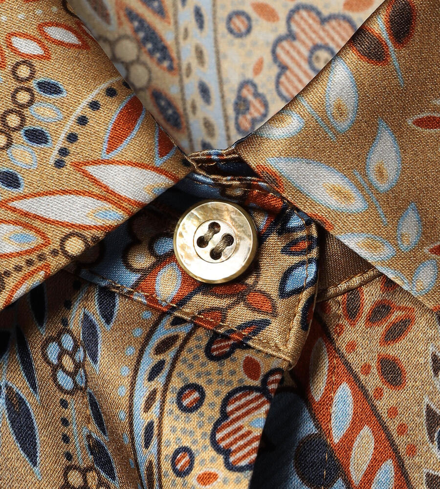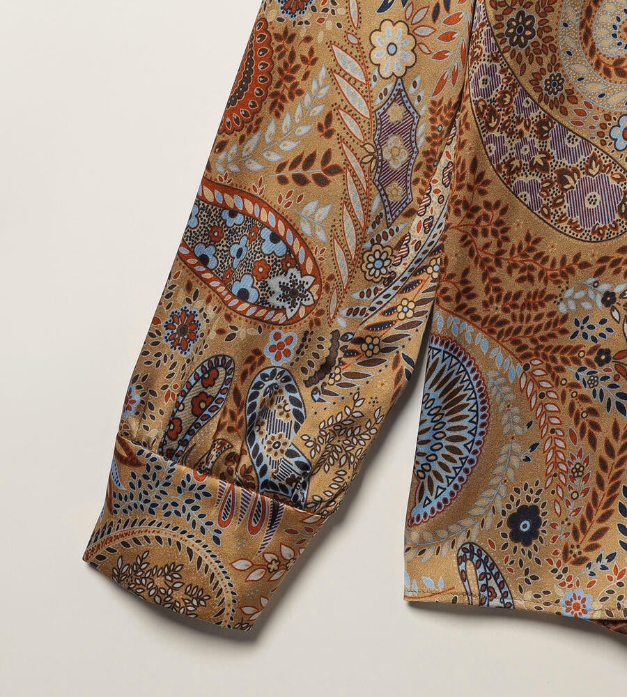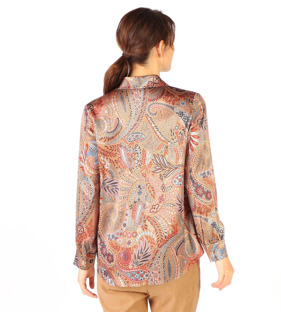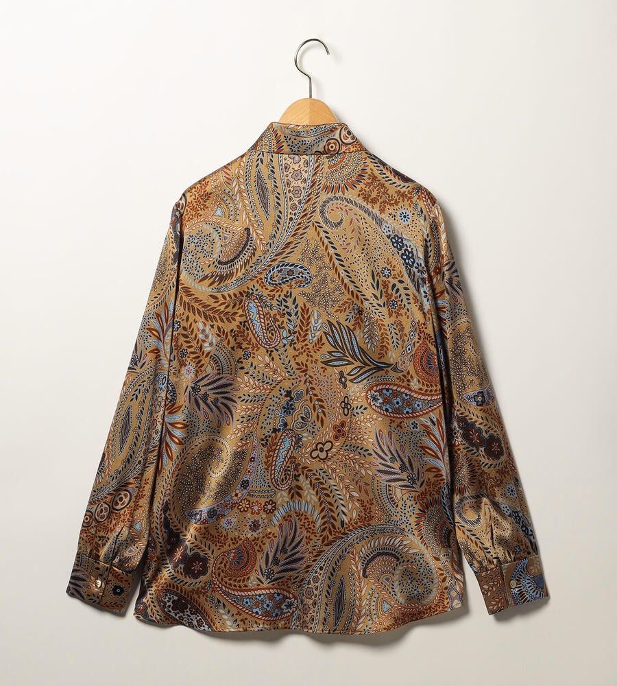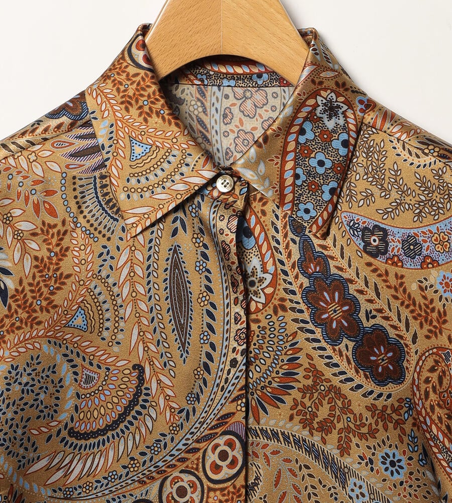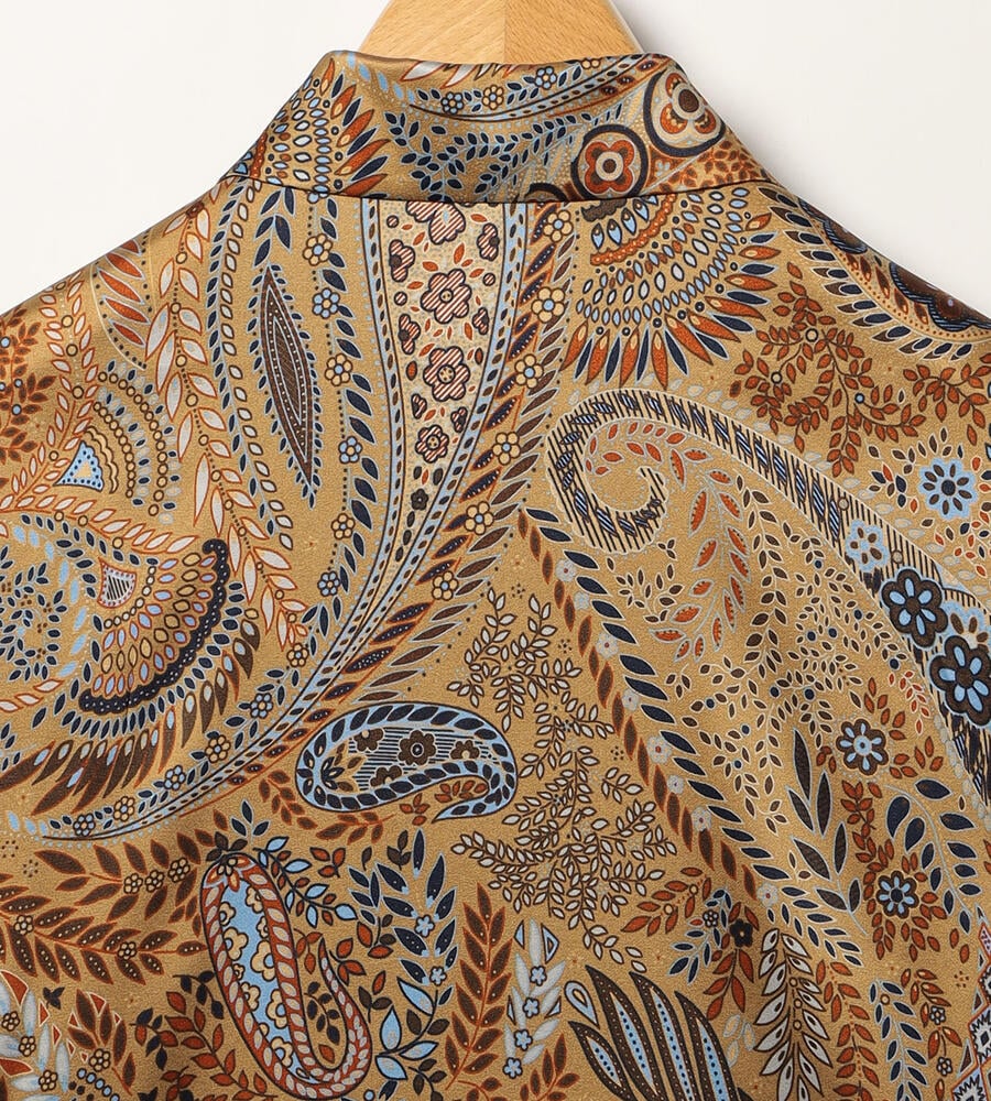 草木をモチーフにしたビンダ柄をシックなカラーで仕上げたブラウス。美しい光沢感のあるシルク混素材からエレガントなムードが溢れ出す、スペシャルな装いにぴったりのアイテムです。フロントはボタンの見えない比翼仕立てですっきりとした印象に。ウエストイン、アウト、どちらのスタイルにも対応します。