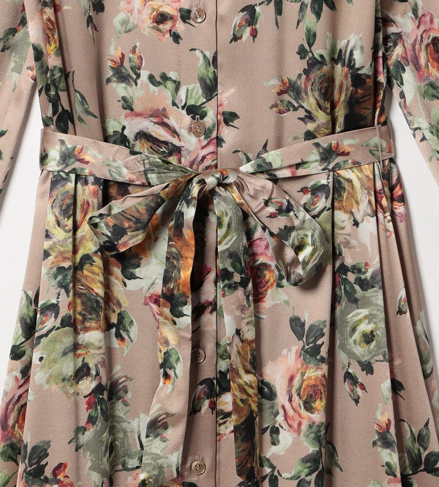 絵画のように美しく表現されたビンダフラワープリントのシャツワンピース。フロントはボタン仕様。上品な艶感としなやかさを持つ、シルクとポリウレタンをブレンドしたサテン素材を採用しています。ウエストベルトのオンオフで雰囲気のアレンジを楽しむことができるアイテムです。