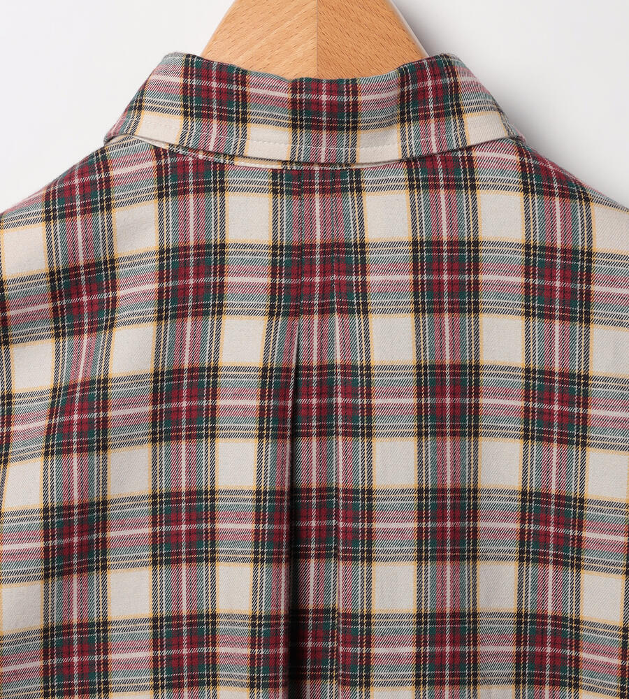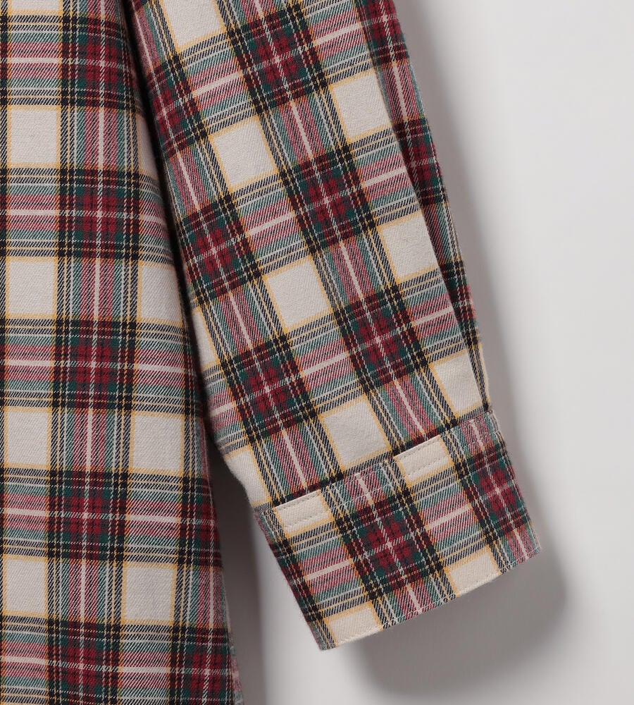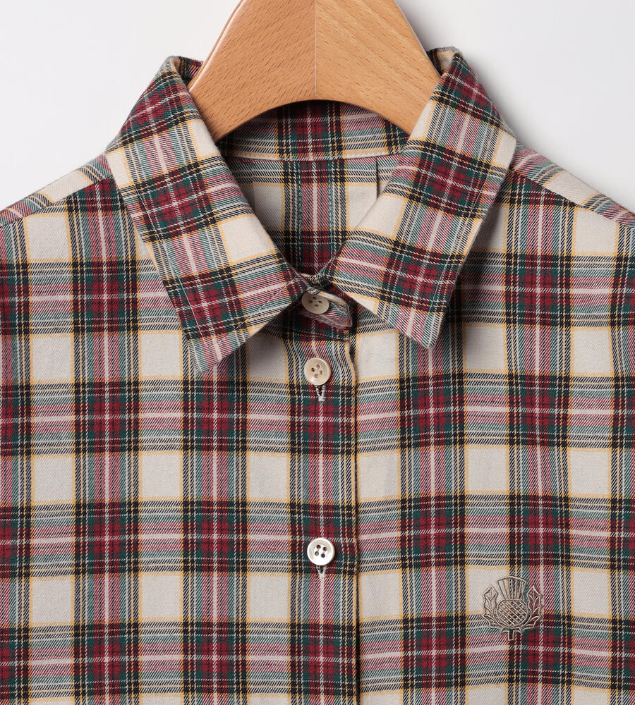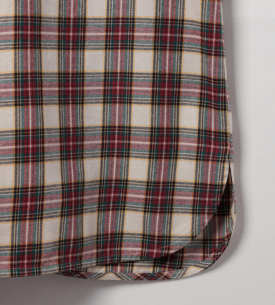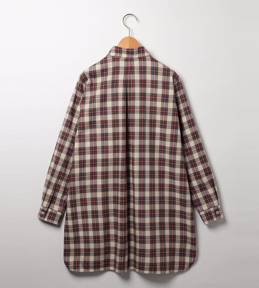 温かみのあるコットンフランネル生地で仕立てた長袖ブラウスです。ヒップが隠れるロング丈で、細身のパンツやロングスカートとのコーディネートもお楽しみいただけます。裾がラウンドカットされているため、タックアウトしたスタイルも様になるのがポイント。胸元には、エンブレム風の刺繍が施されています。