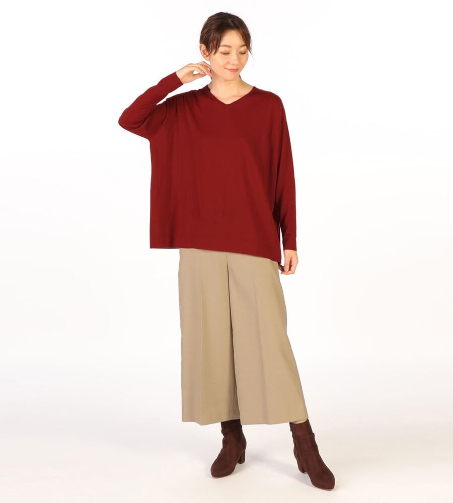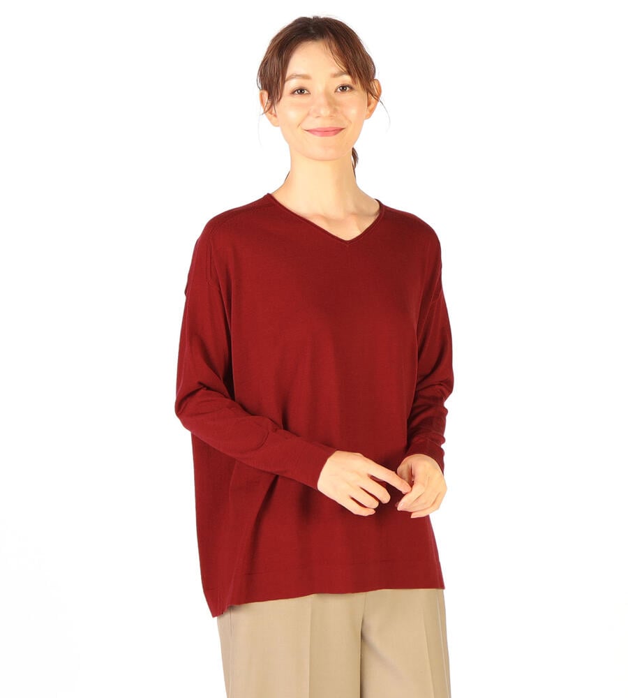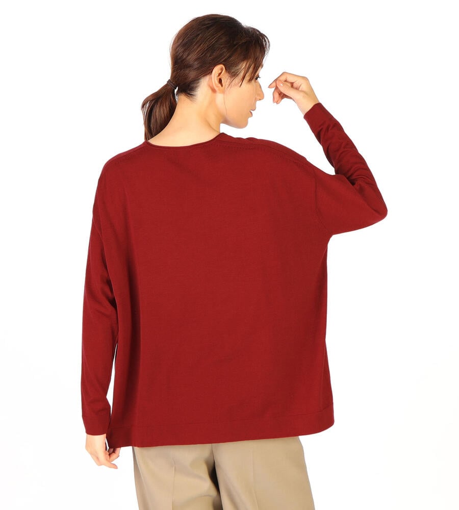 襟付きの長袖ウールのVネックブラッキーニット。密度の高い編み感がエレガントな表情の一枚。今年らしいデザインディティールのゆとりのあるオーバーサイズシルエットとドロップショルダーがこなれ感あるデザイン。シンプルなデザインで様々なボトムとマッチ。毎日の着こなしで活躍するアイテムです。