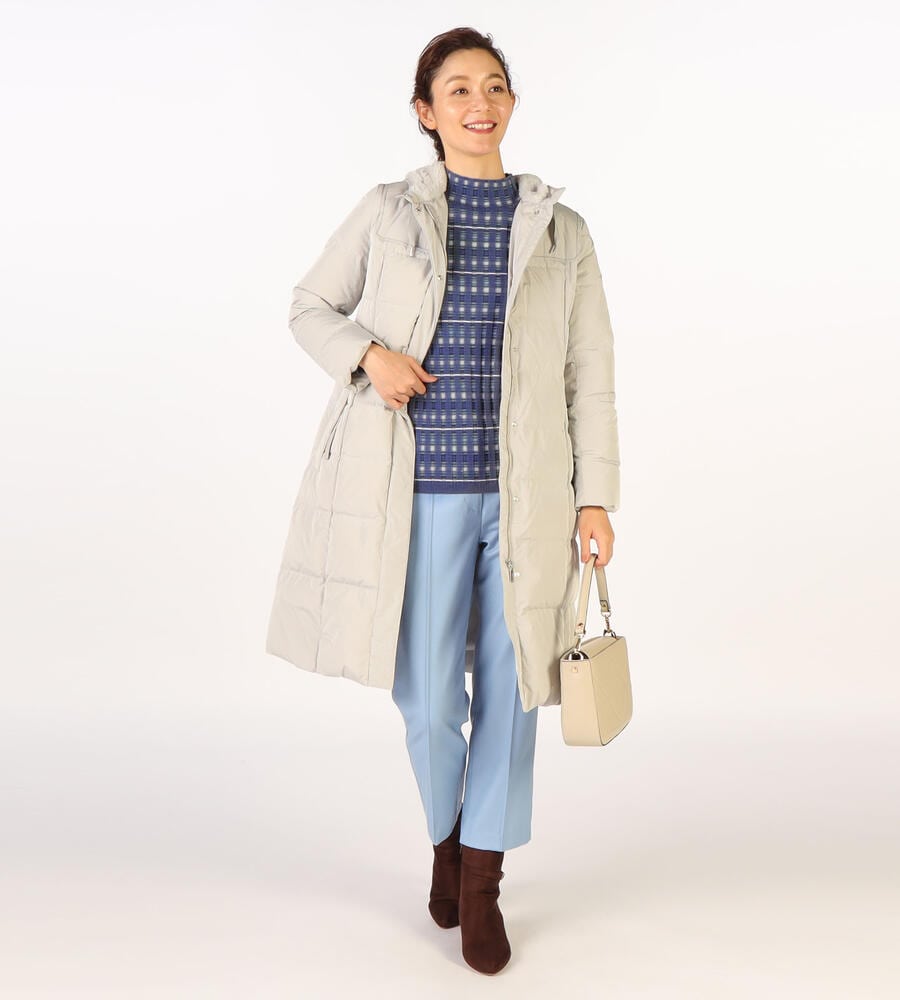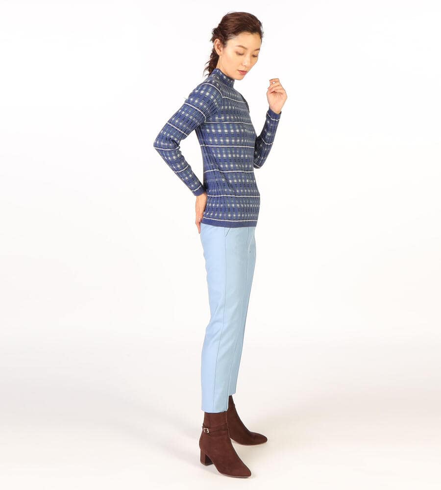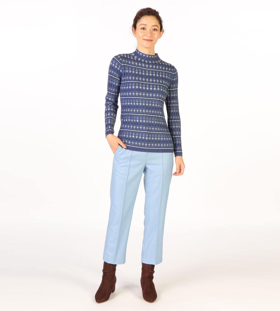 凹凸のある編み地とボーダー柄を組み合わせたデザインが着こなしのアクセントになるニットプルオーバー。ボディにフィットするシルエットは1枚着としても、インナーとしても使い勝手が良くおすすめです。ボトルネックで首まわりもあたたか。