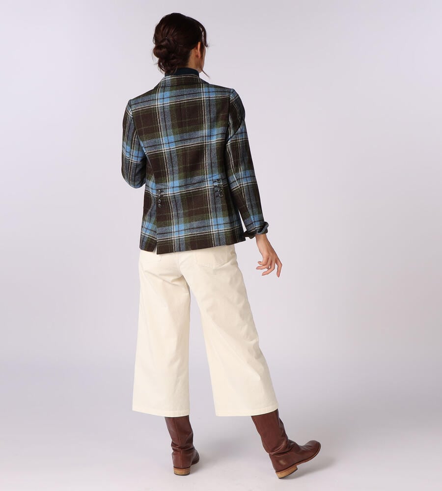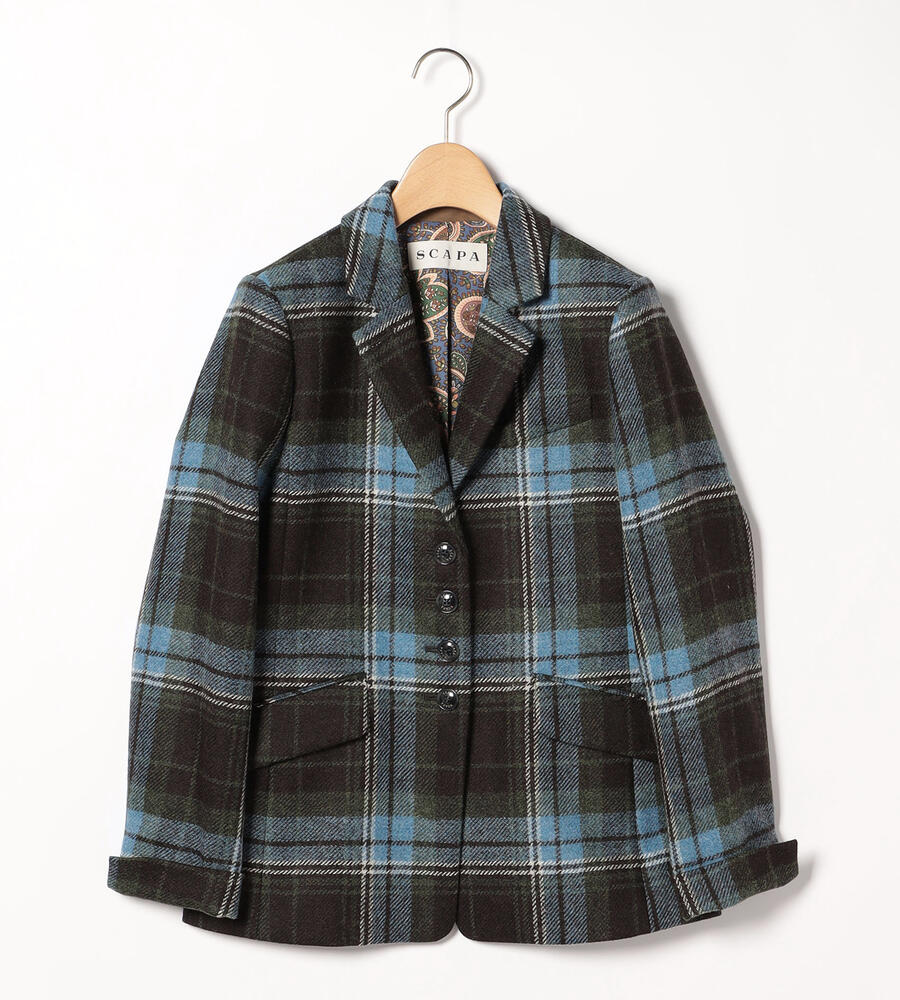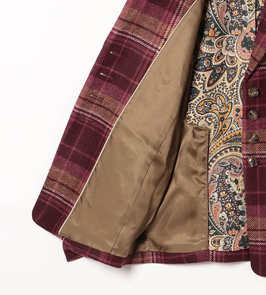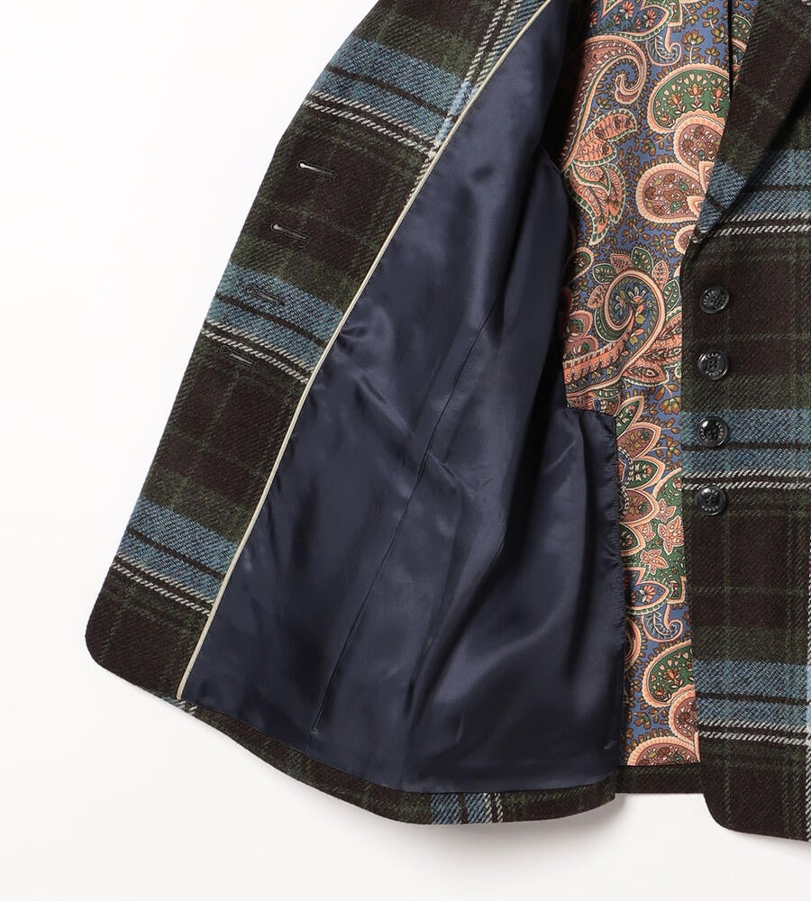 トラディショナルな印象のチェック柄ジャケット。存在感のある1枚なので、シンプルなコーディネートのアクセントとしてもお使いいただけます。インパクトのあるハッキングポケットやボタン位置など、乗馬ジャケットを思わせるディテールにも注目です。裏地には華やかなペイズリー柄をあしらうなど、見えない部分までこだわりを詰め込みました。