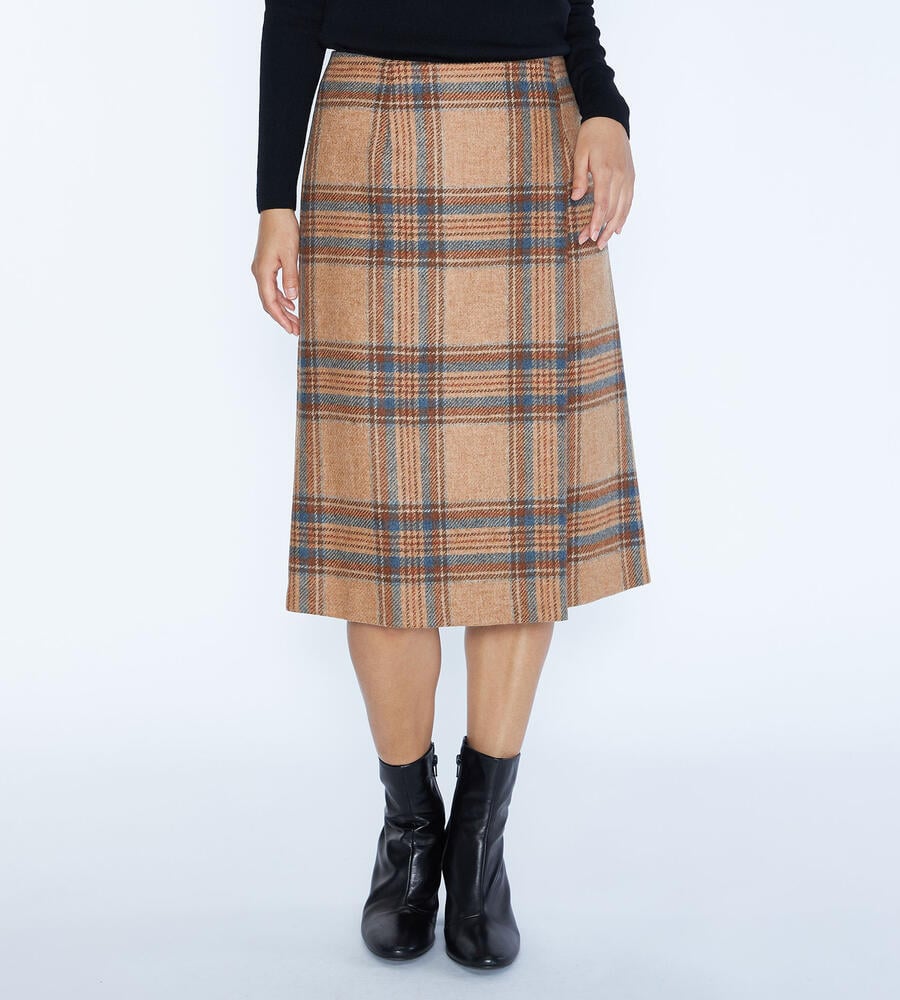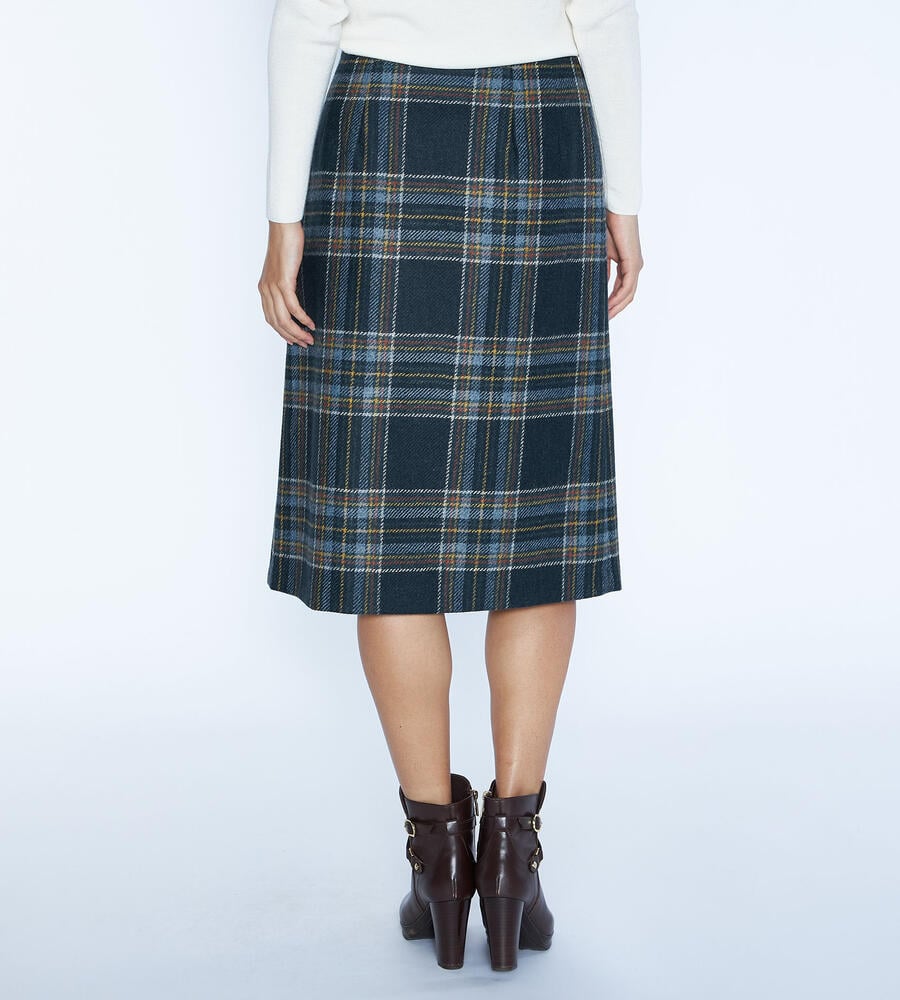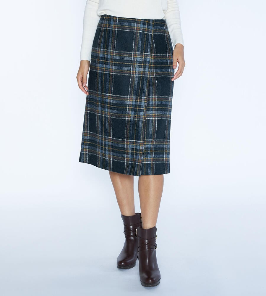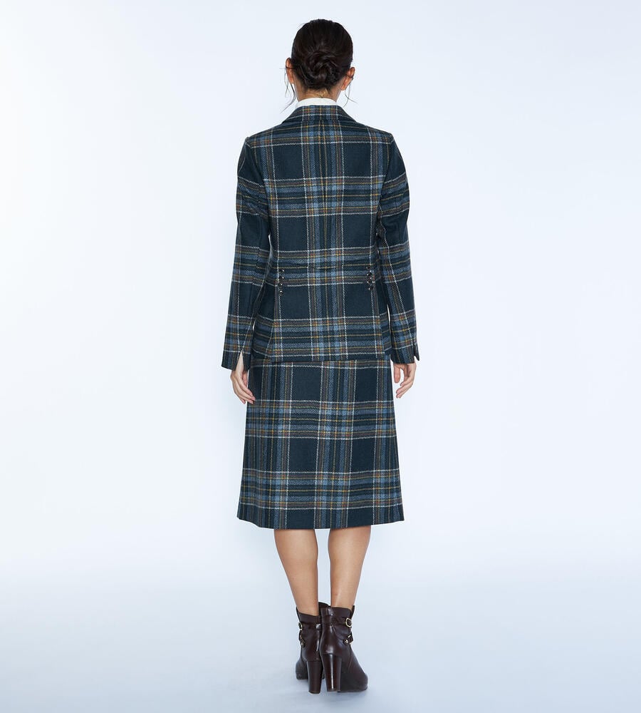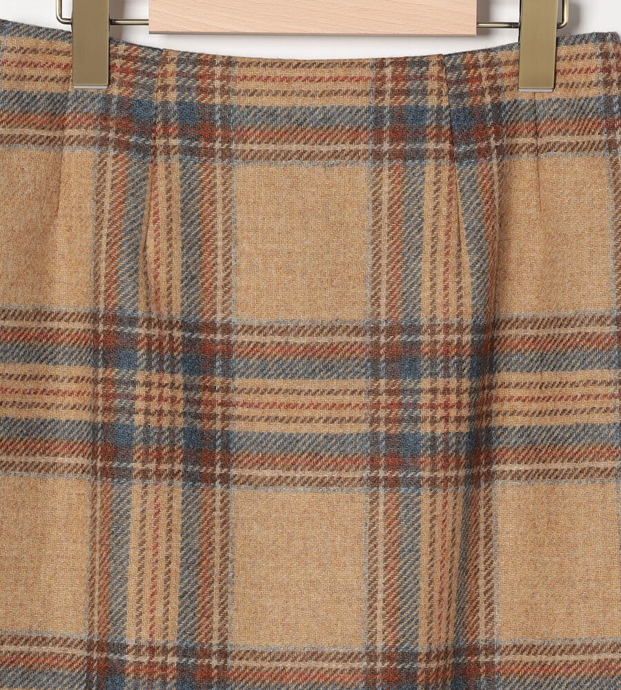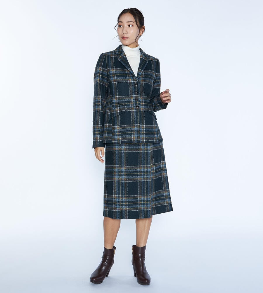 イギリス産の上質なウール素材を用いたスカート。ジェントルな空気感が漂うチェック柄を用いて、正統派の風格ある表情に仕上げています。フロントが重なって見えるラップ風の仕立て。膝が隠れる程度の着丈で、凛とした着こなしを楽しめます。同素材のジャケットを合わせたセットアップスタイルもおすすめです。