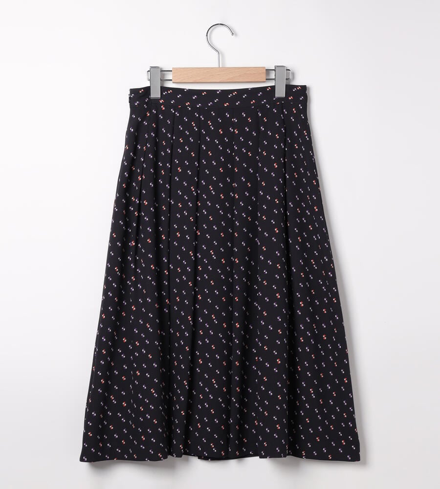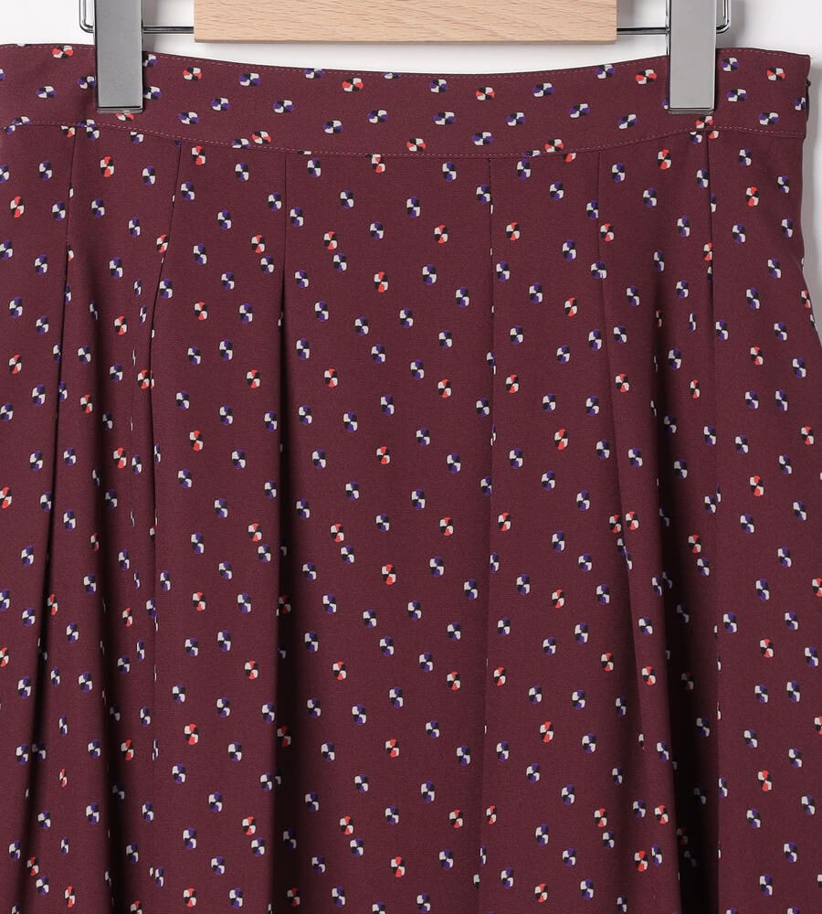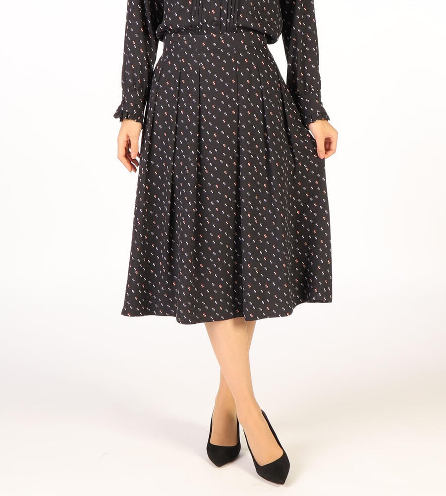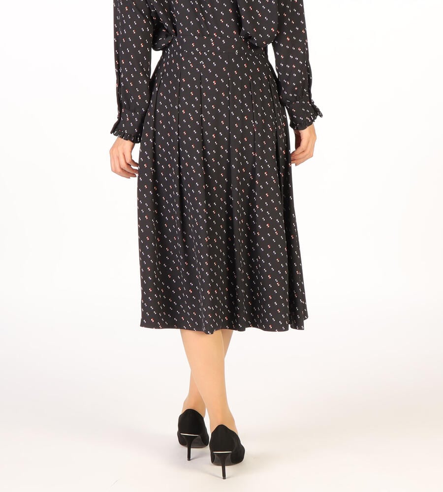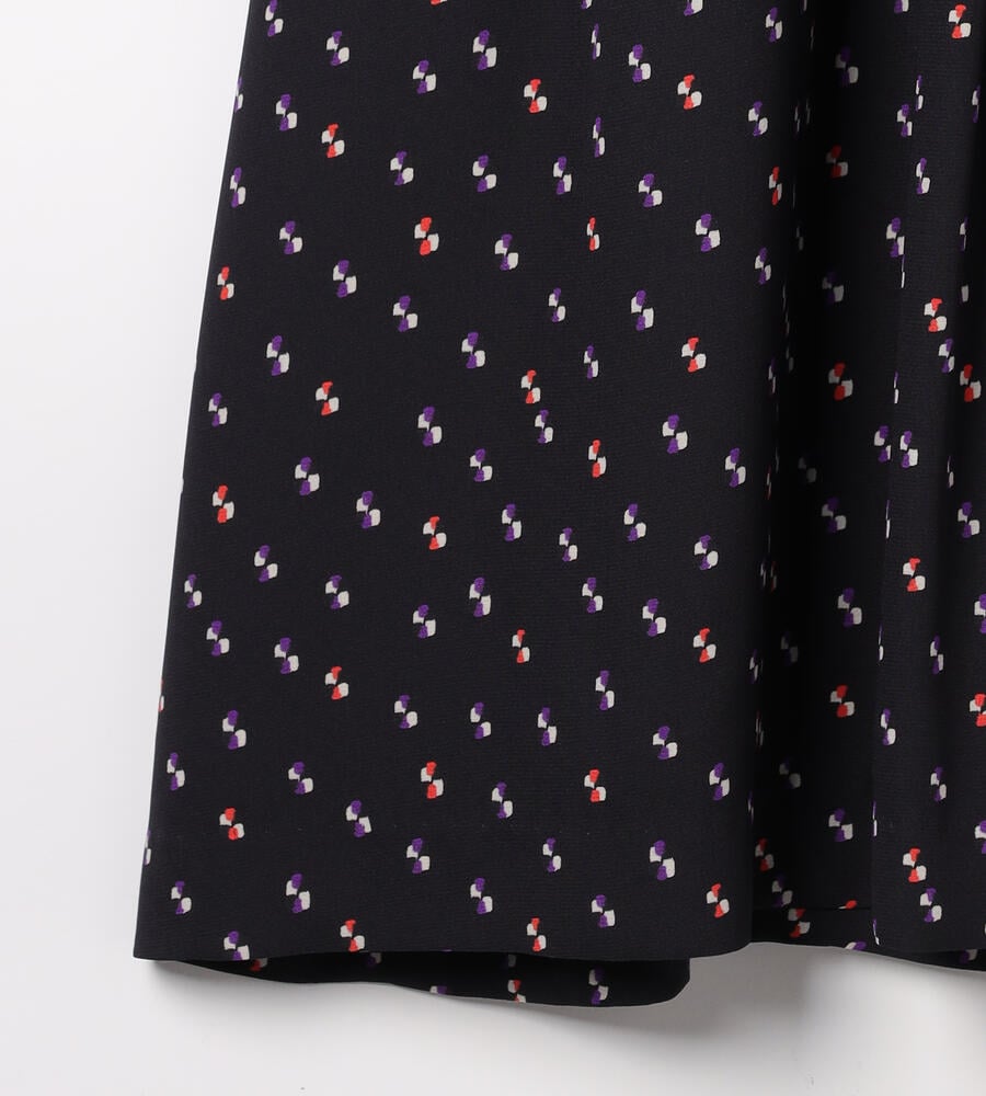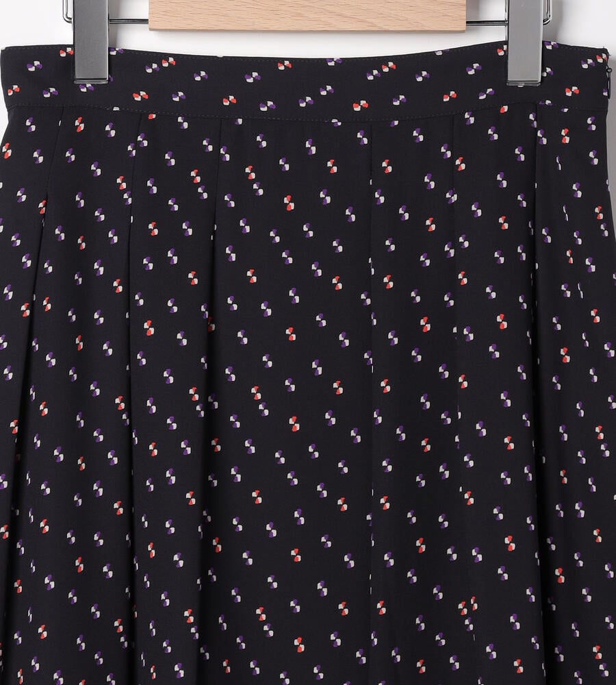グラフィカルでレトロな雰囲気のドット柄が全面にプリントされた、華やかな印象のミディ丈スカート。プリーツ入りの、フレアでドレープ感のあるフェミニンなシルエットがポイント。ベルトのないスッキリとしたウエスト周りで、お手持ちのトップスに合わせやすくシックで華やかな着こなしが完成するアイテムです。