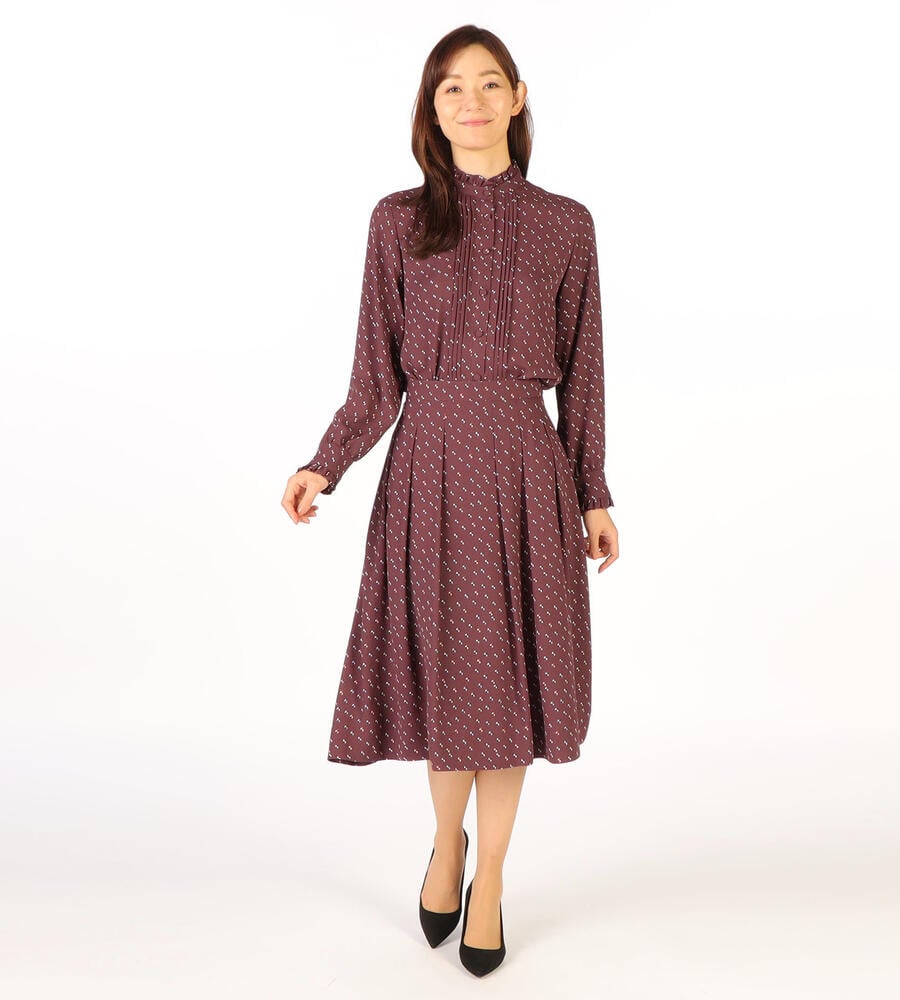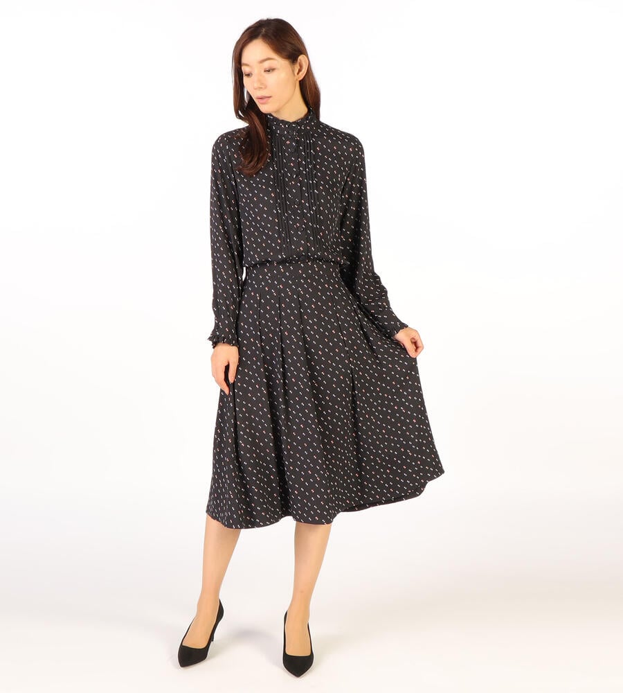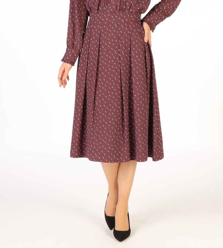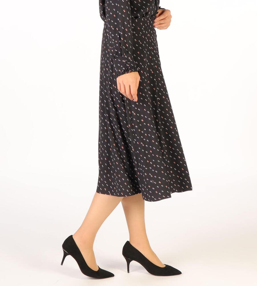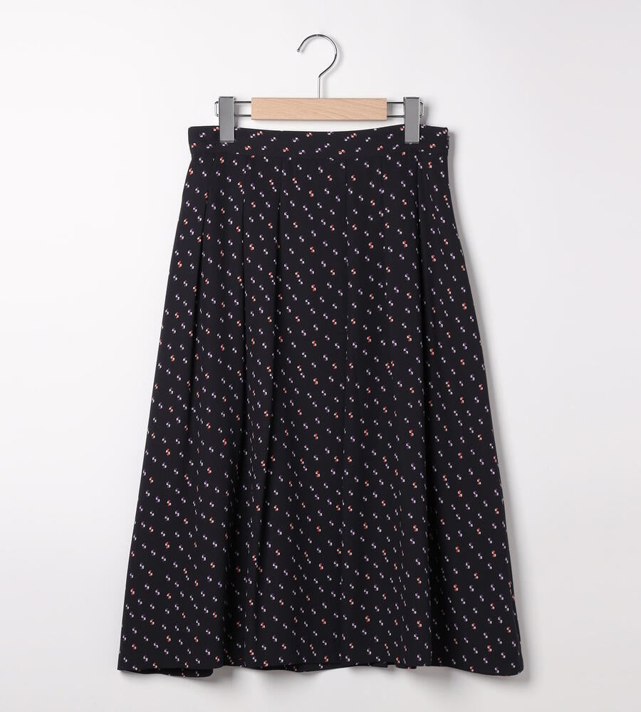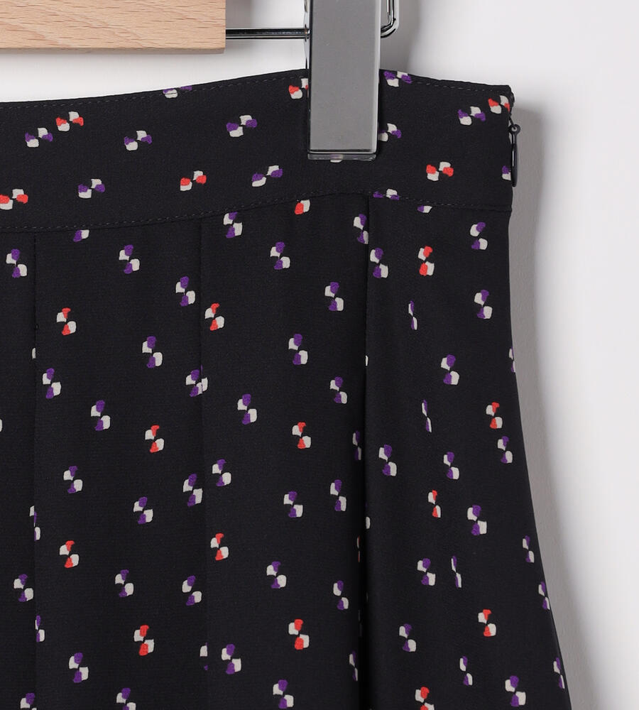 グラフィカルでレトロな雰囲気のドット柄が全面にプリントされた、華やかな印象のミディ丈スカート。プリーツ入りの、フレアでドレープ感のあるフェミニンなシルエットがポイント。ベルトのないスッキリとしたウエスト周りで、お手持ちのトップスに合わせやすくシックで華やかな着こなしが完成するアイテムです。