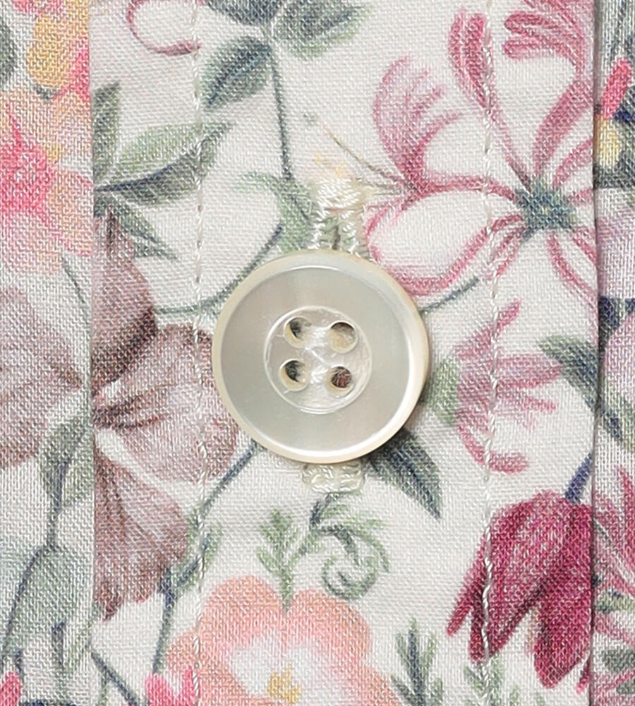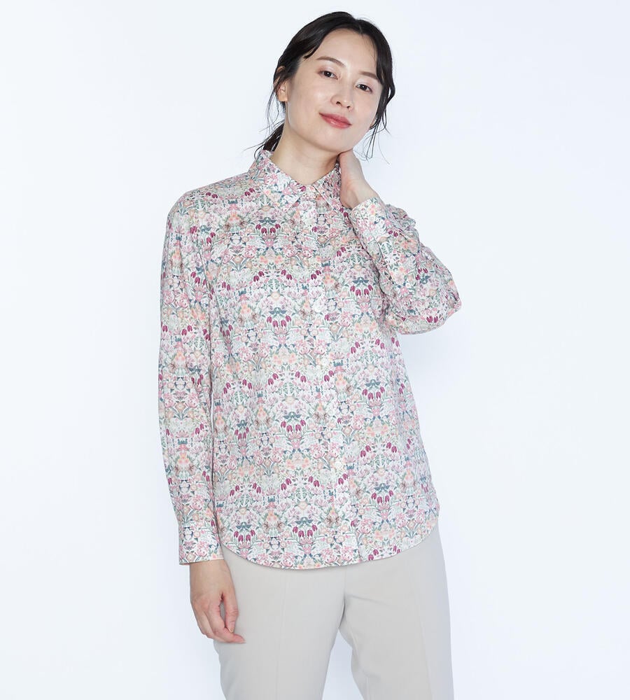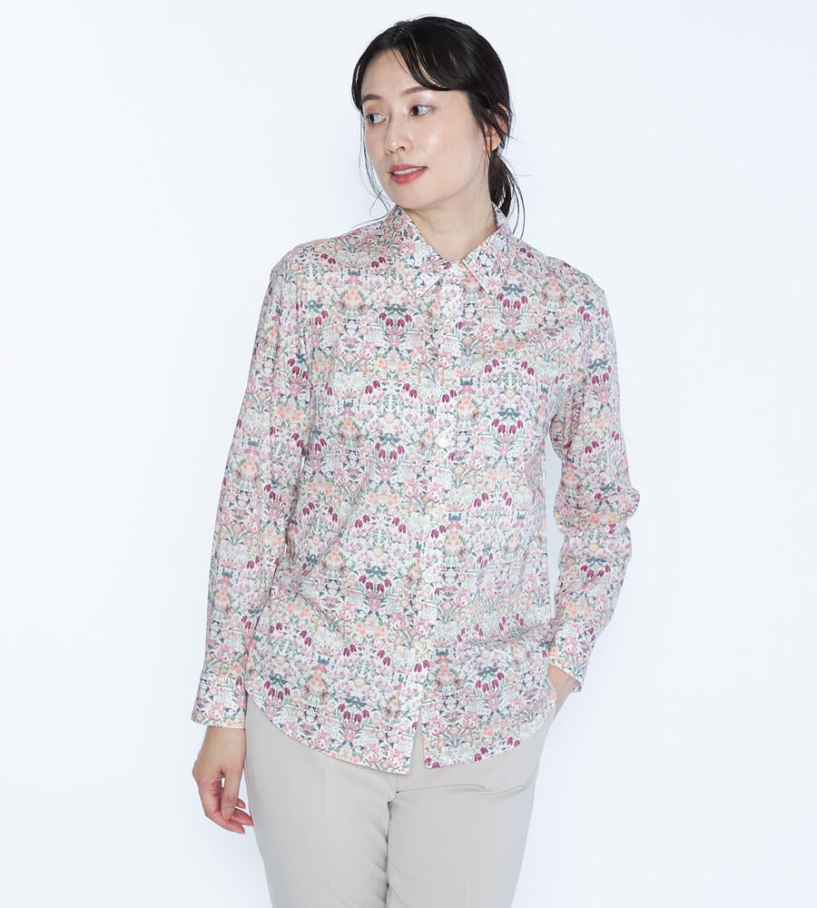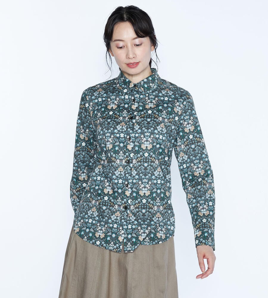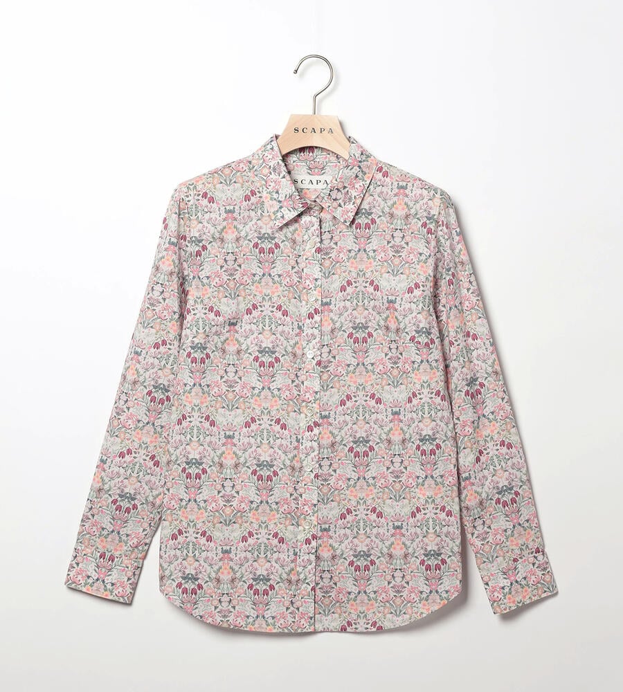 表情を明るく見せてくれる美しいカラー使いのリバティプリントシャツ。さらりとした風合いのコットン100%素材を採用。スタンダートなシルエットはコーディネートに合わせやすく、1枚着としてはもちろん、インナーとしてプリントアクセントを取り入れたいときにもおすすめです。