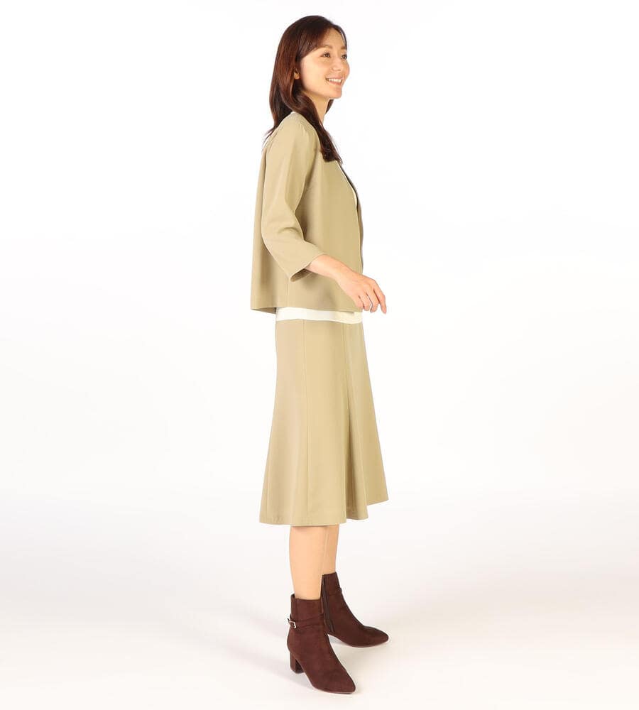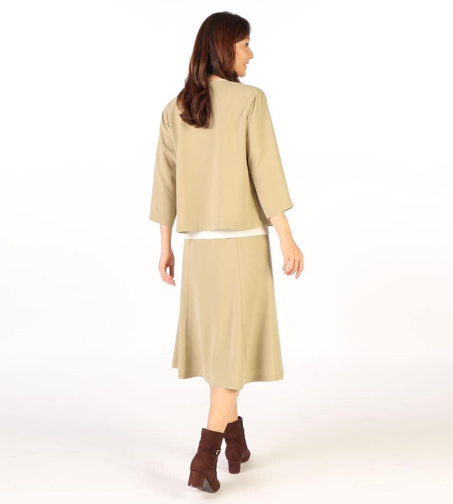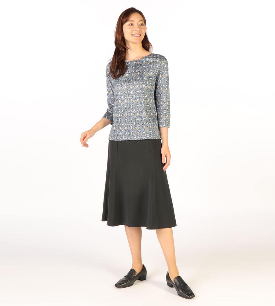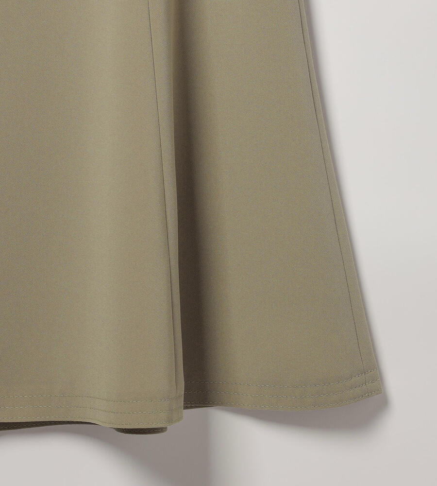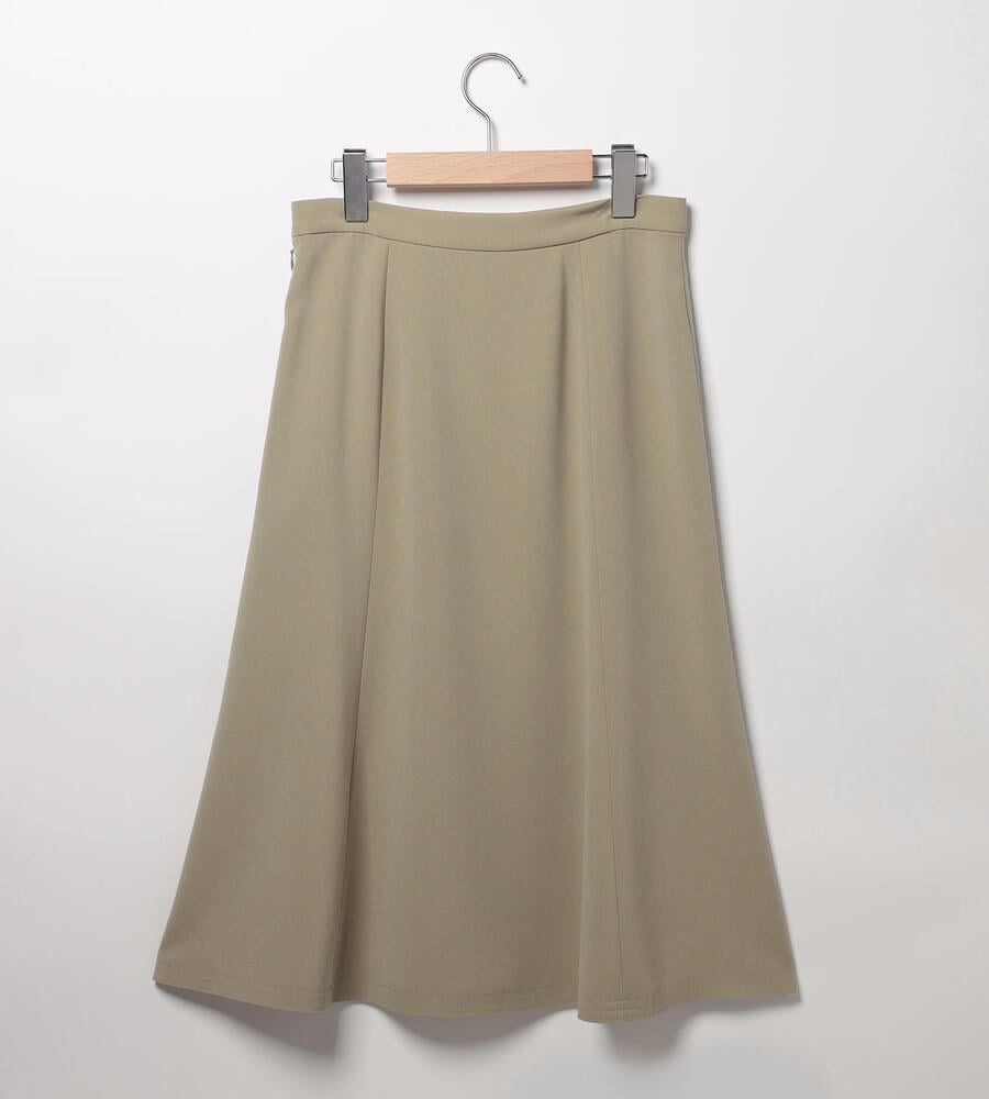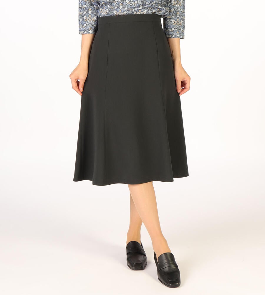 さらっとなめらかな肌触りのドライストレッチ生地で仕立てたミディ丈スカート。ストレッチ性があるので、身体の動きに合わせて伸縮する快適な履き心地の生地感が魅力。ハリ感があり、フレアでドレープ感のあるシルエットがエレガント。シンプルで合わせやすい無地で様々な着こなしで活躍するアイテムです。