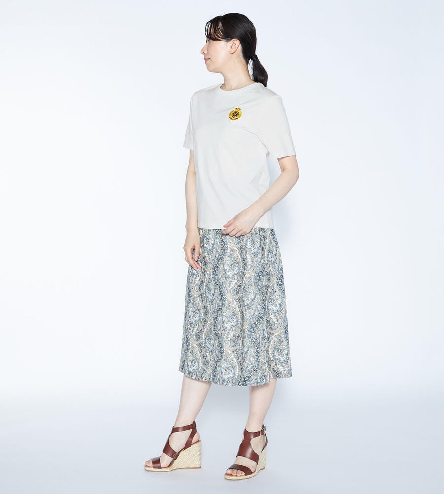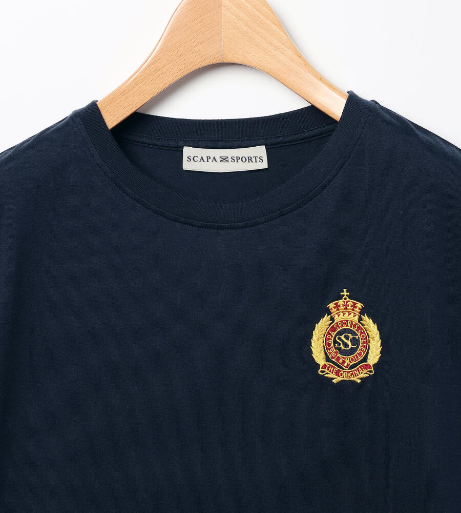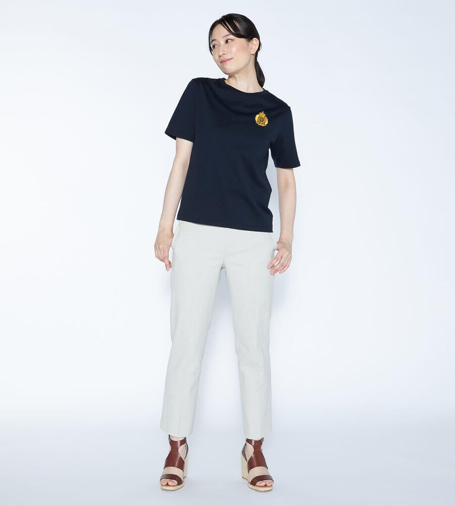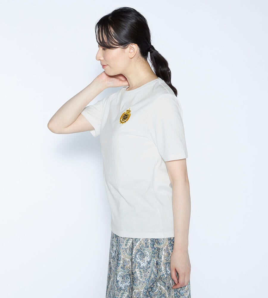 肌当たりの良い天竺素材を用いたTシャツです。シンプルながらも胸元に添えワッペンで、クラシカルな雰囲気を高めた1点です。身体にすっきりと寄り添うシルエットで、スマートな装いを演出。デニムなどを合わせたカジュアルなスタイリングはもちろん、スカートなどを合わせて、敢えてフェミニンに着こなすのもおすすめです。