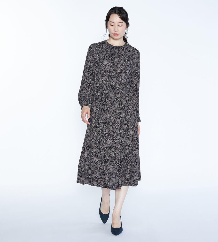 線画でデザインしたフラワープリントの長袖ワンピース。シックな配色やロング丈のデザインで大人のコーディネートに仕上がります。ウエストと袖口の切り替えにはボリューム控えめのフリルをあしらい、女性らしさをさりげなくプラス。存在感があり、1枚でコーディネートが決まるのも魅力のアイテムです。