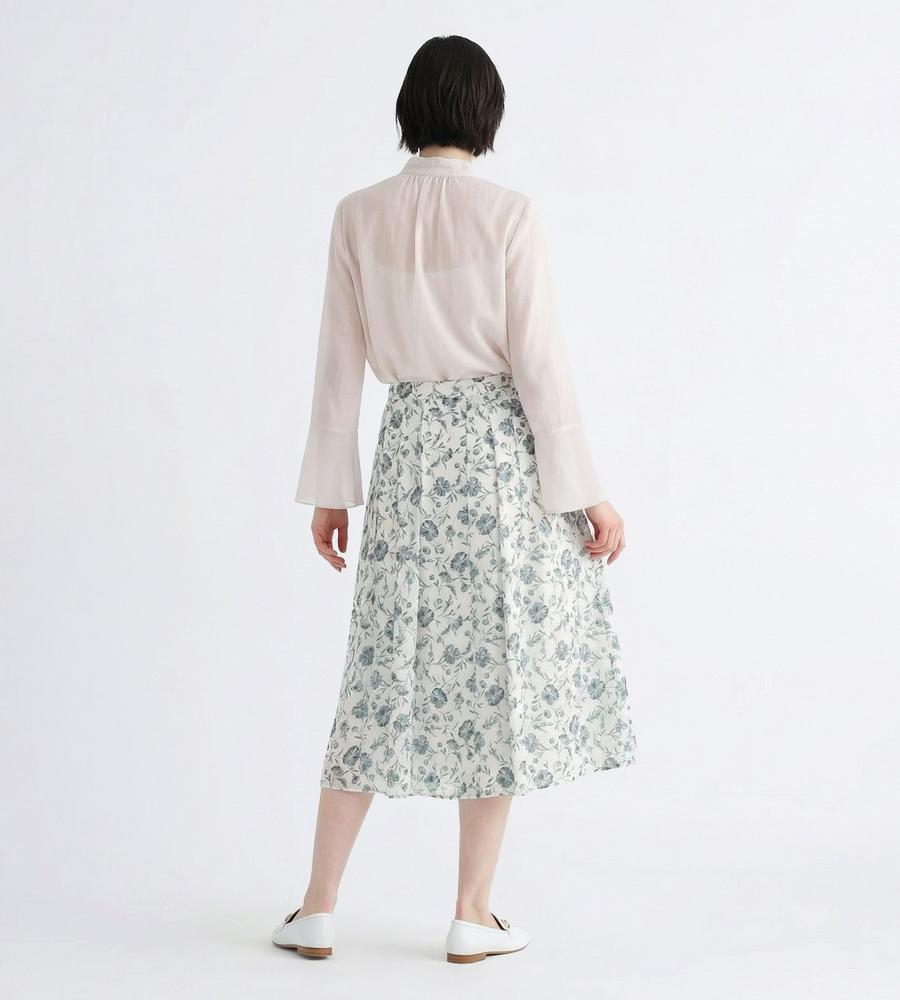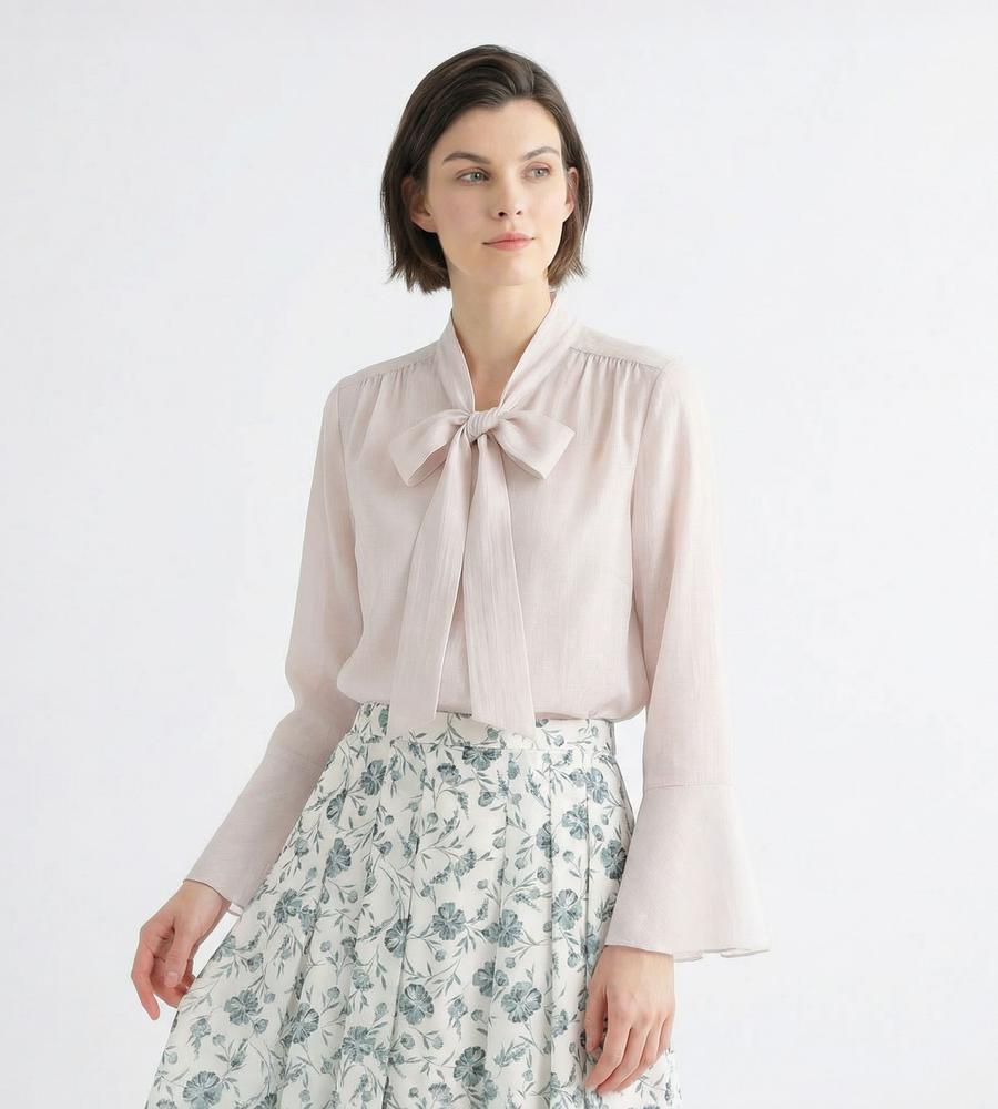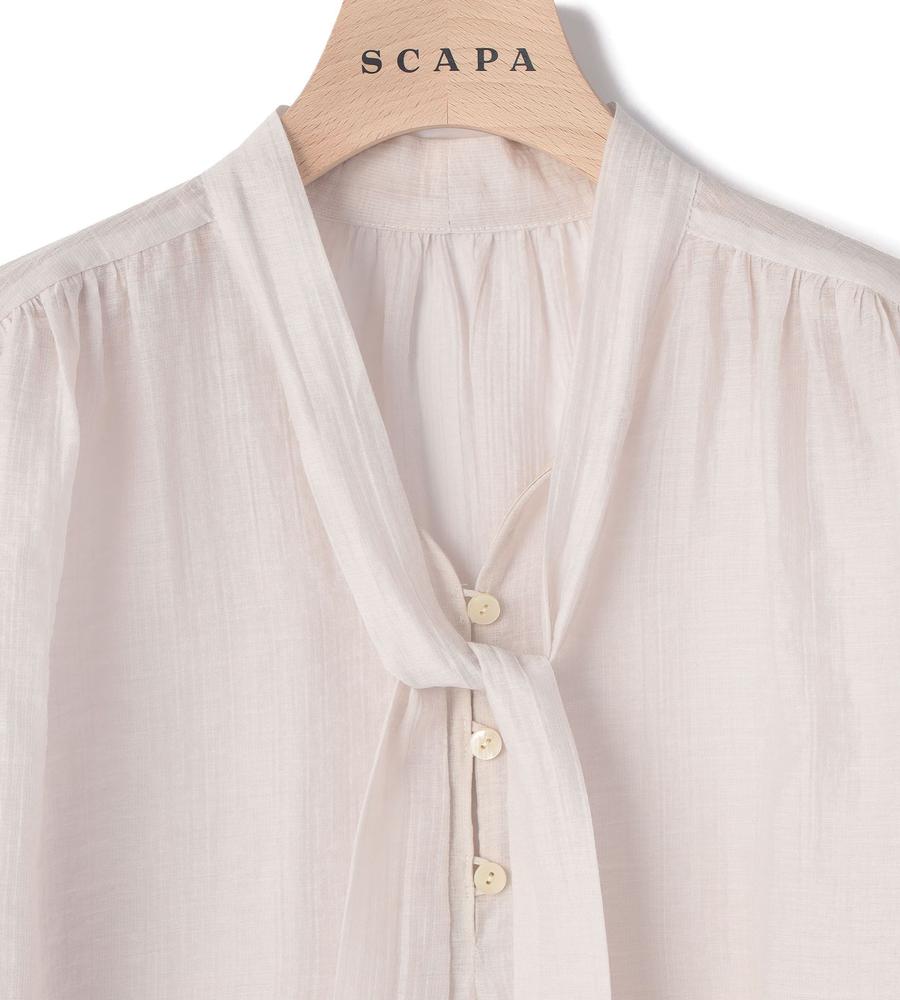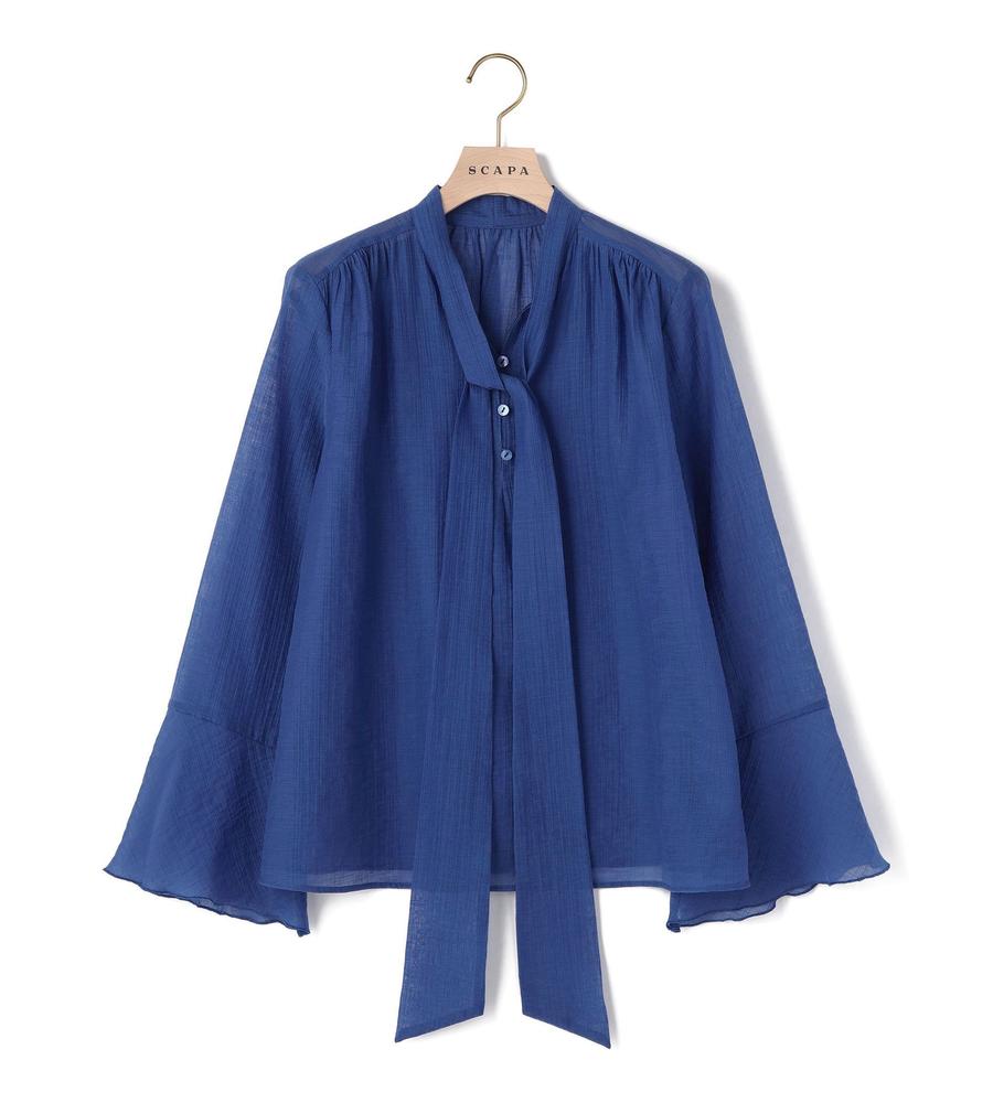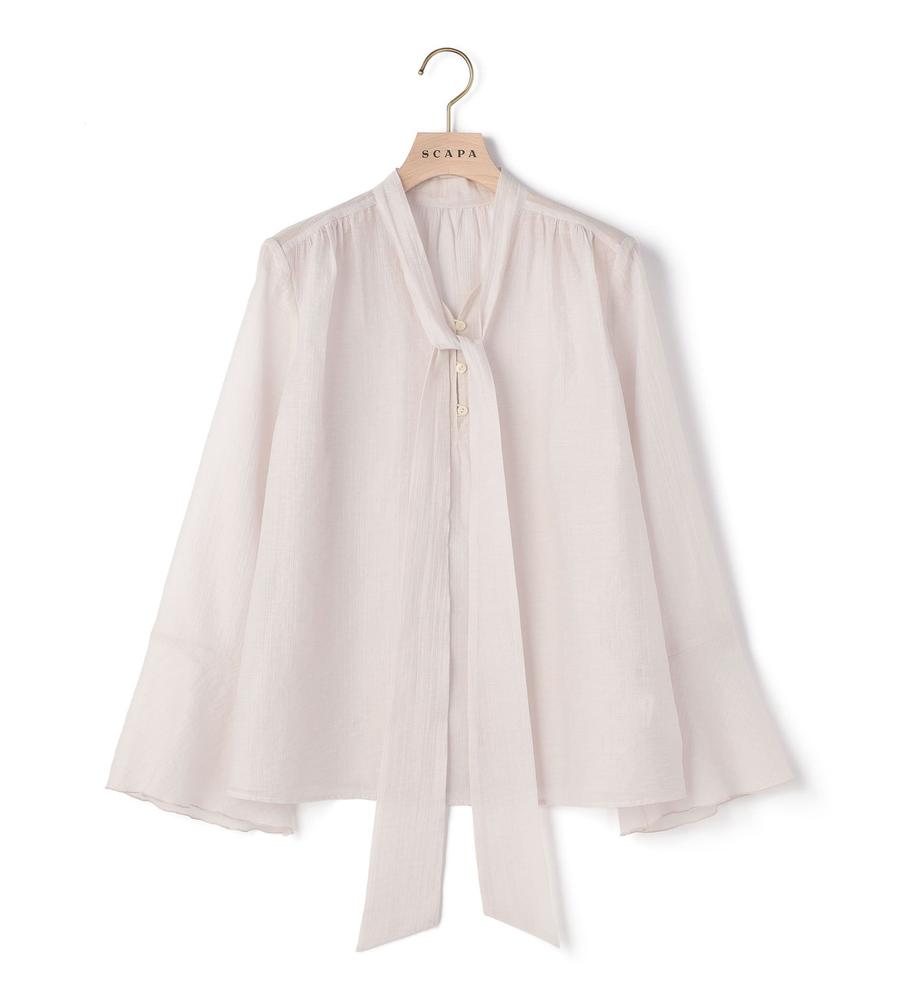シアーな生地感がフェミニンなブラウス。落ち感のあるボウタイが、大人っぽい華やぎを演出するポイントに。フレア仕立てになった袖口も、モードな表情を楽しませてくれます。