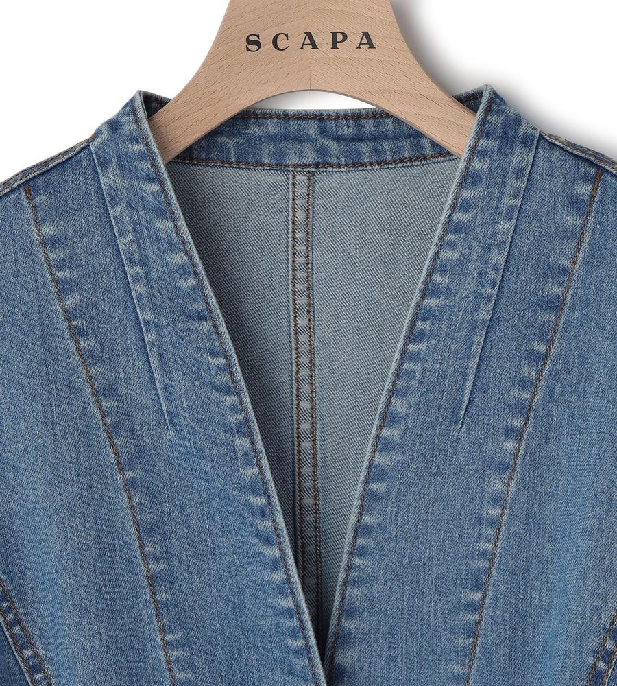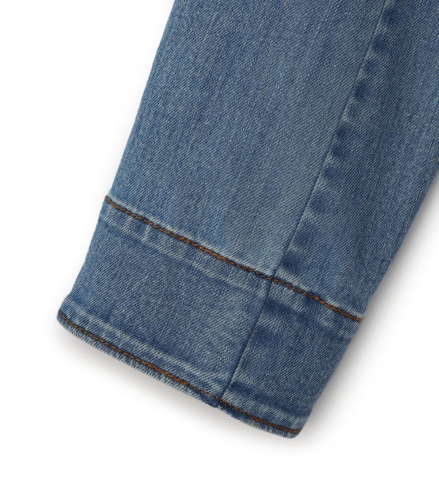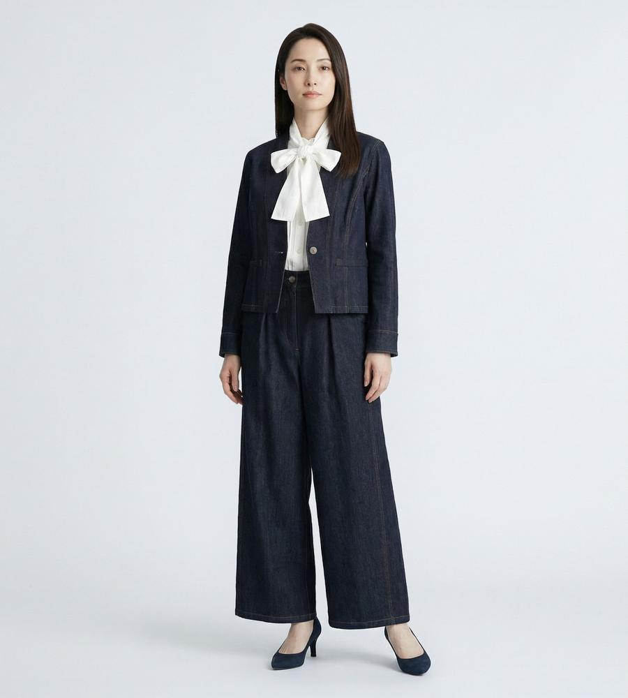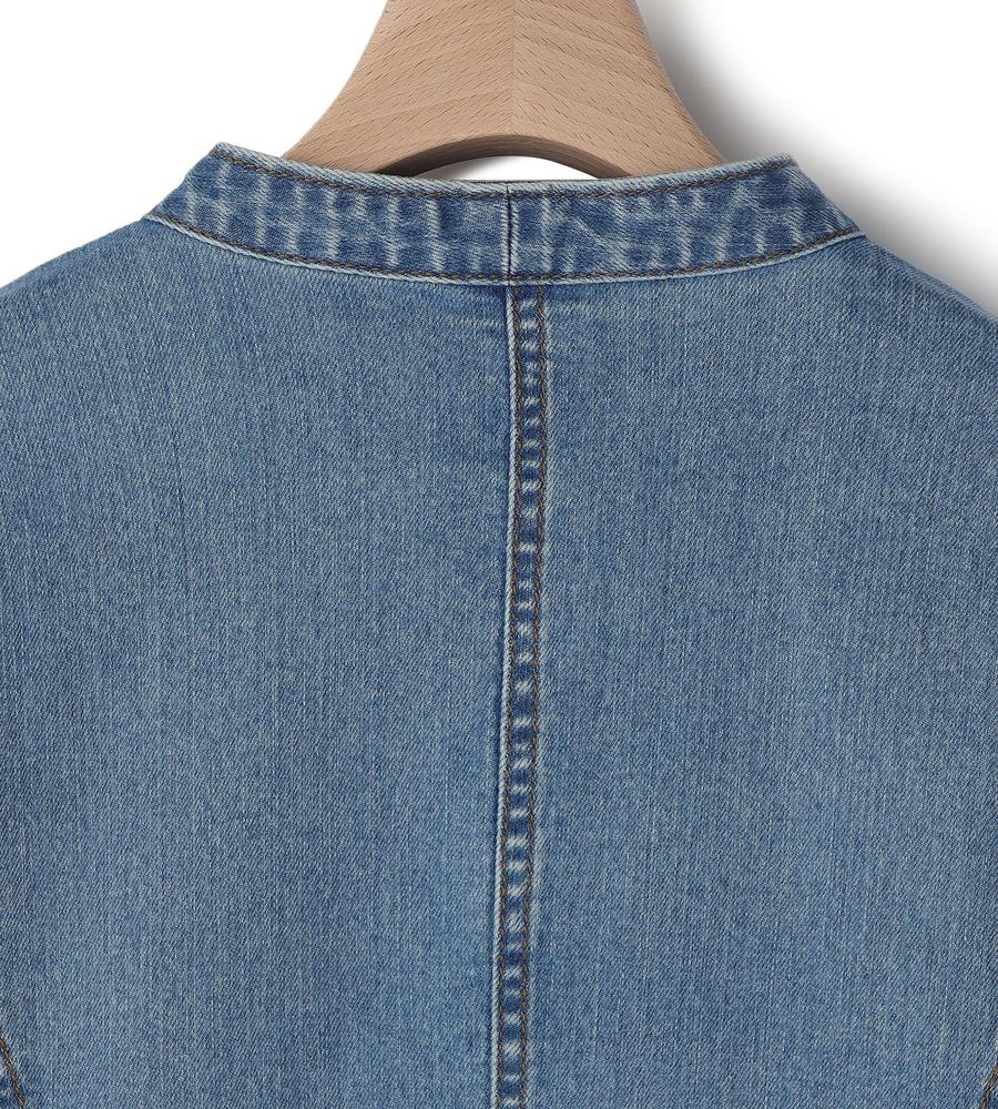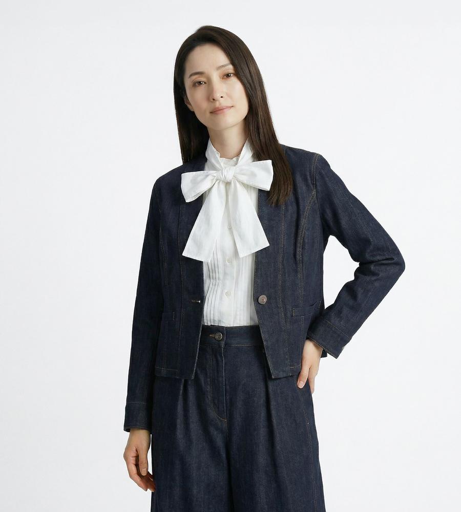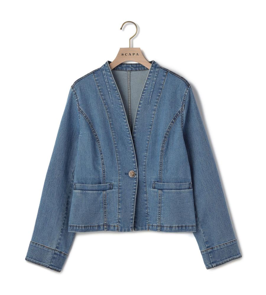 シャープなノーカラーできれいめにもスタイリングしやすいデニムジャケット。すっきりした腰丈やワンボタンで、こなれた装いを楽しめそう。ストレッチが入っているため、着心地が快適なのも魅力です。