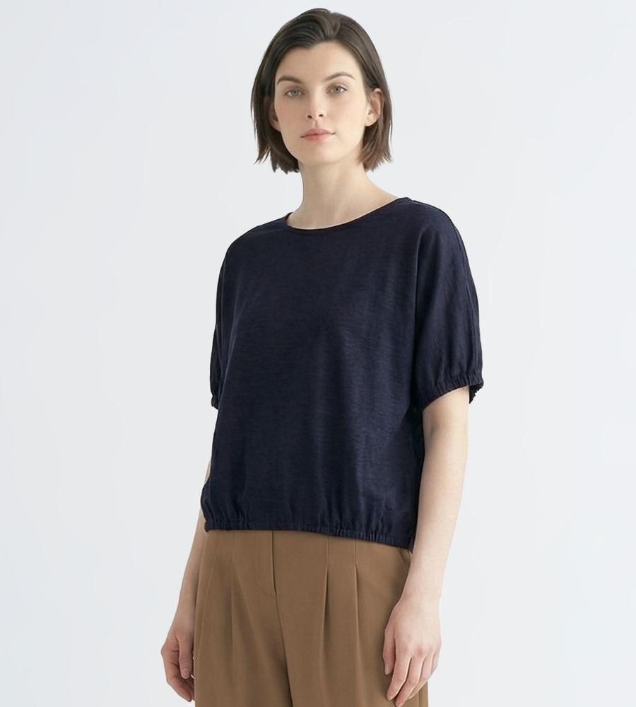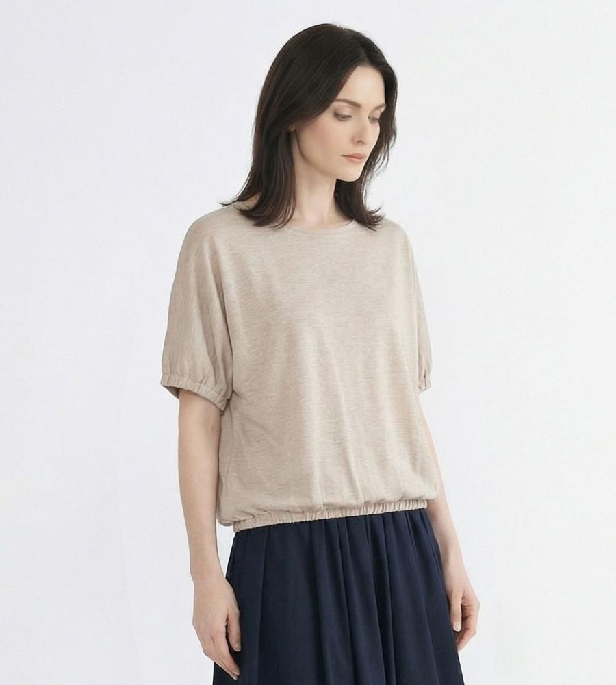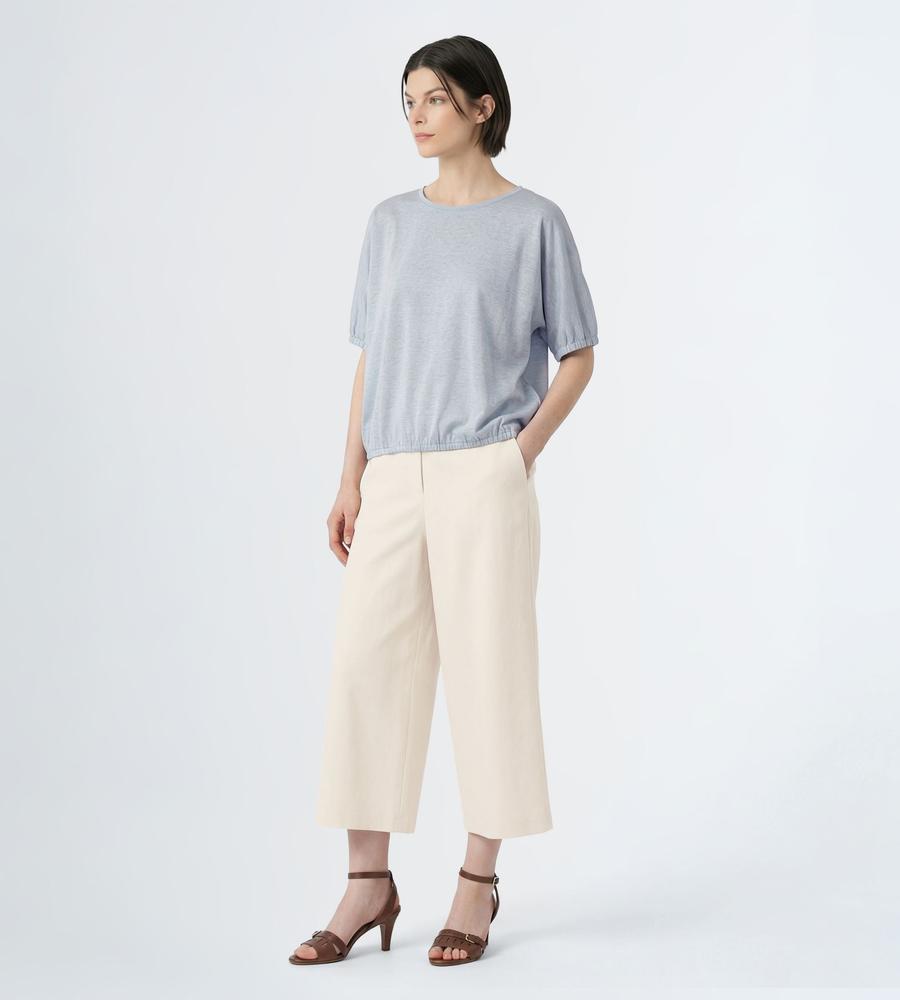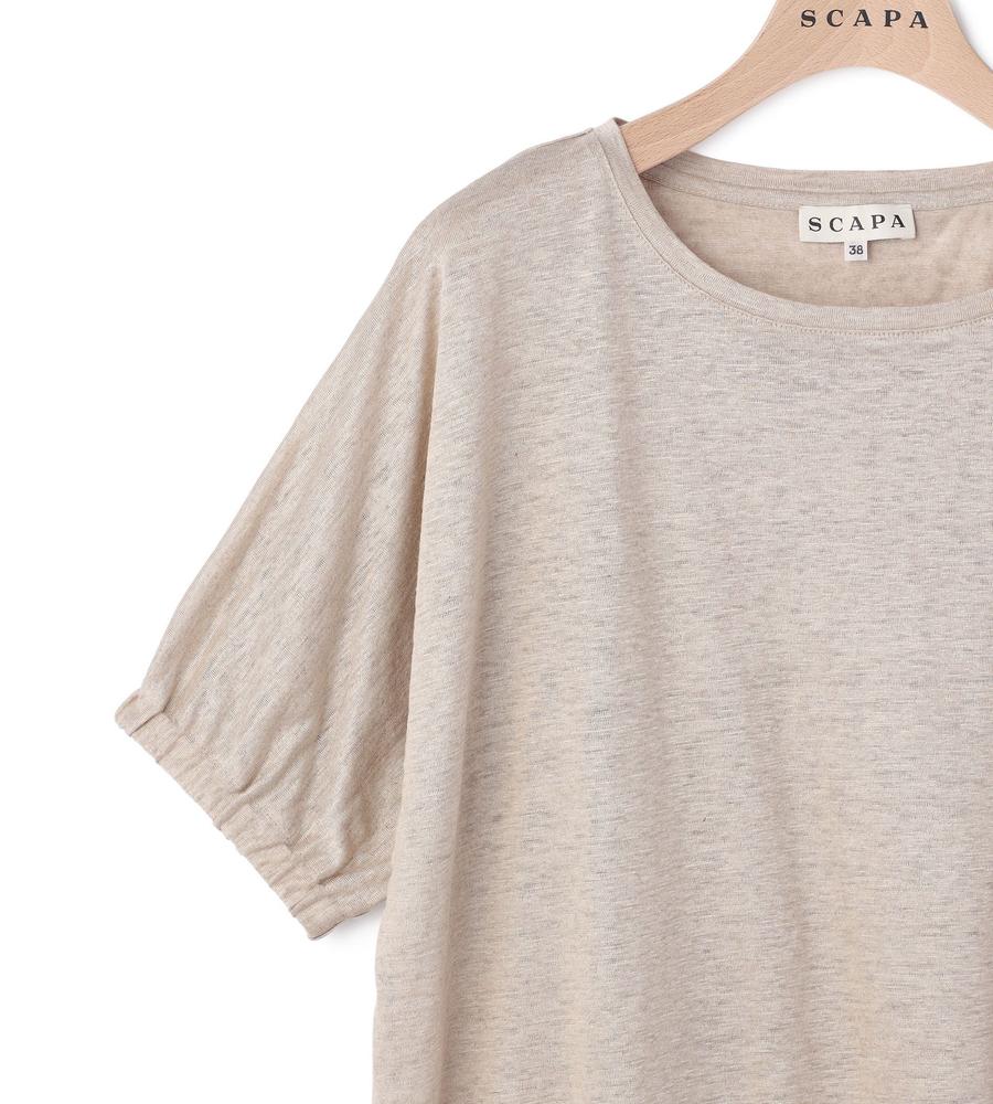 肌にサラッと心地よく着られる、リネン100%仕立てのプルオーバーカットソーです。生地にシルケット加工をほどこすことで、表面にシルクのような光沢感をプラスしました。シルエットに丸みを持たせる袖口と裾のギャザー使いもポイント、色違いで欲しくなる脱カジュアルな大人の半袖トップスです。