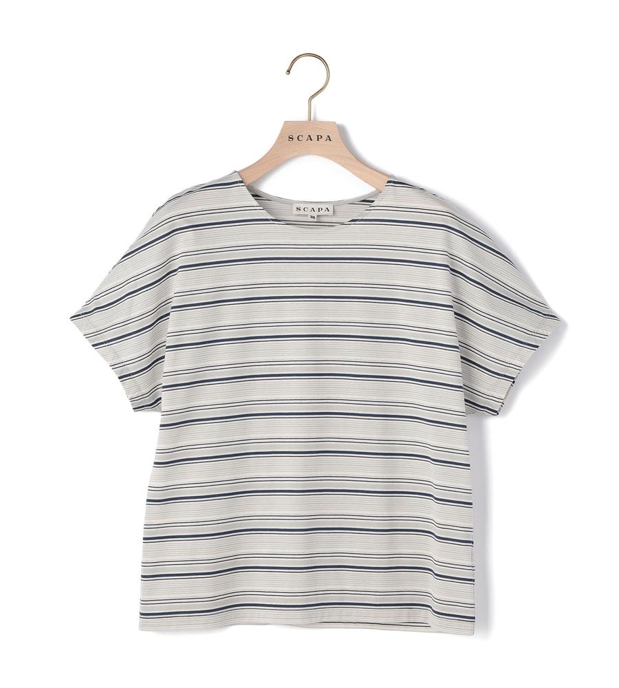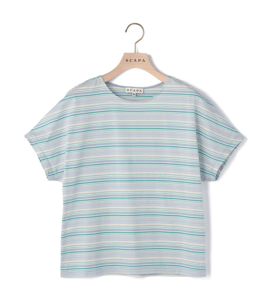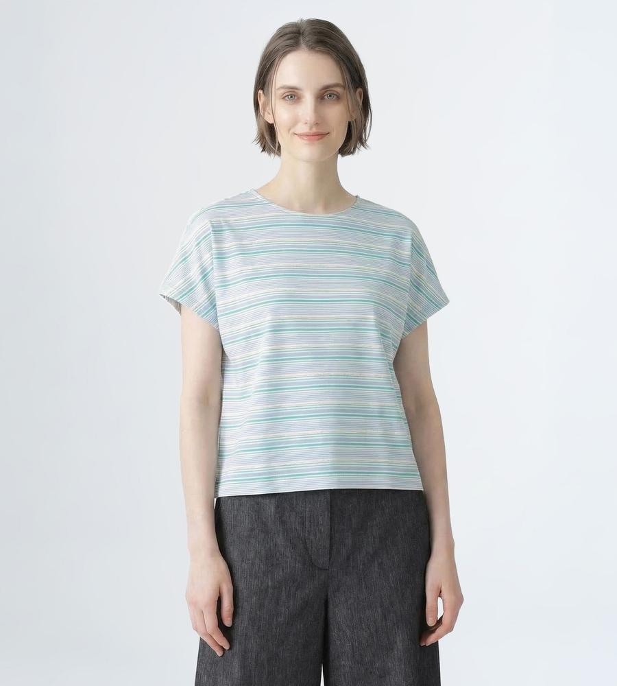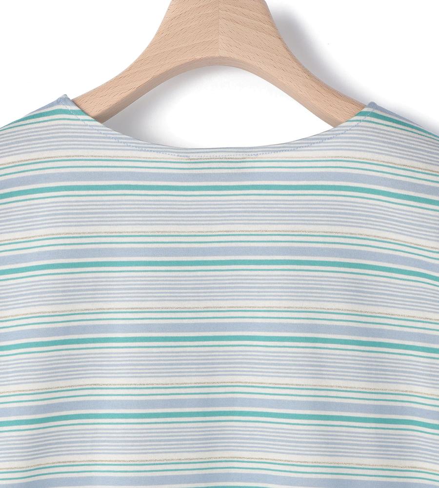 これからの季節にぴったりなマルチボーダー柄の半袖カットソーです。さりげないラメ混のボーダーラインに注目、袖に切り替えを作らないデザインが柄をきれいに見せてくれます。フレンチスリーブが脱カジュアル着こなしをかなえてくれるポイント、1枚着はもちろんインナーとしても存在感を発揮するアイテムです。