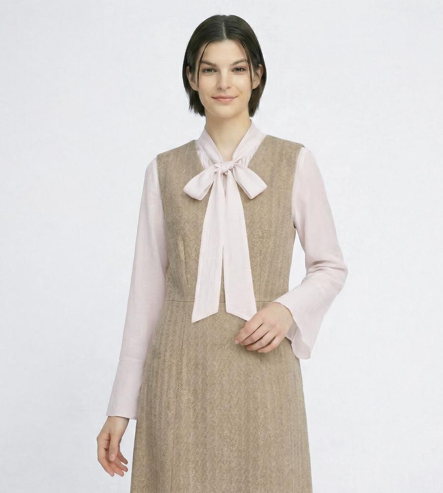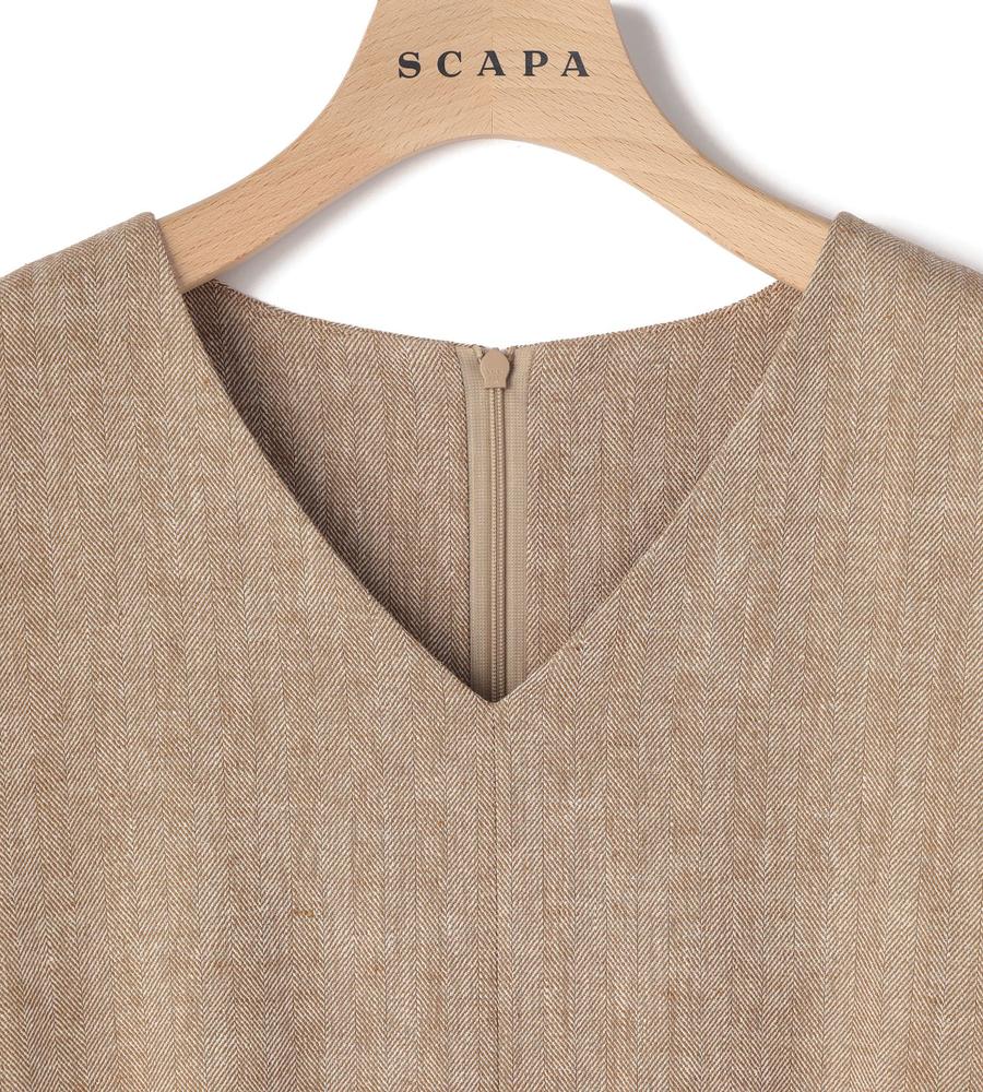 さらりとした肌ざわりが心地良いヘリンボーン柄ワンピース。Vネックのセミフレアシルエットで、スマートな着こなしが叶います。合わせるインナー次第でロングシーズン活躍する一着。