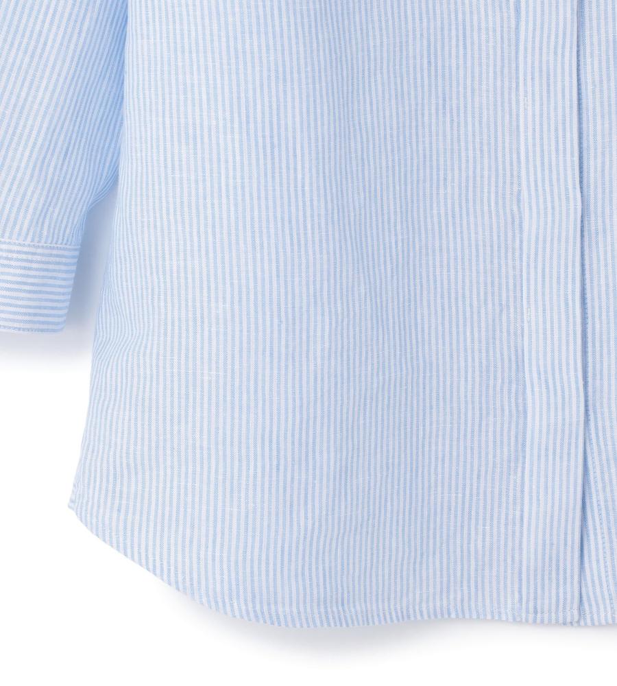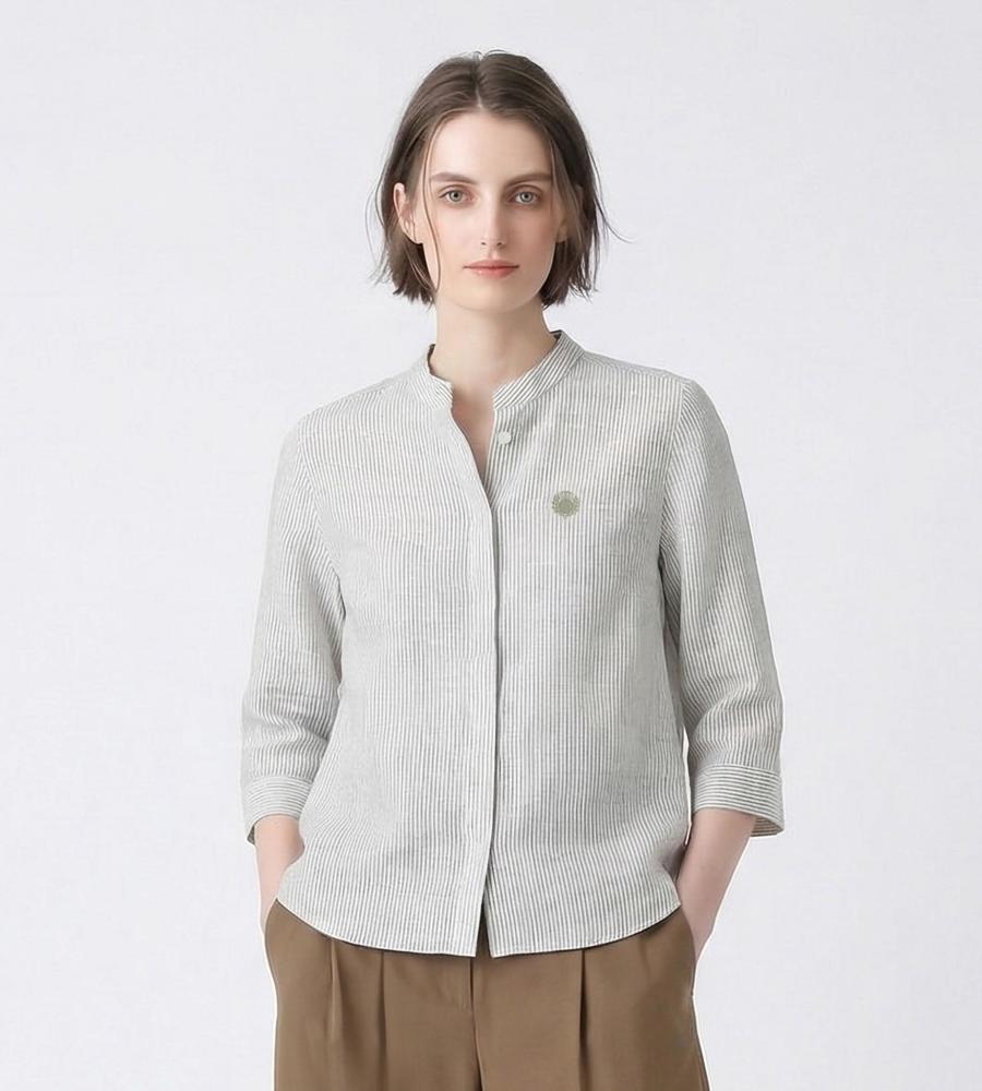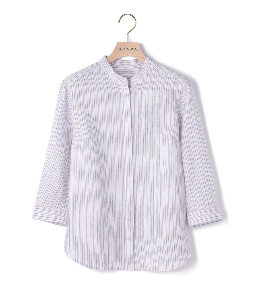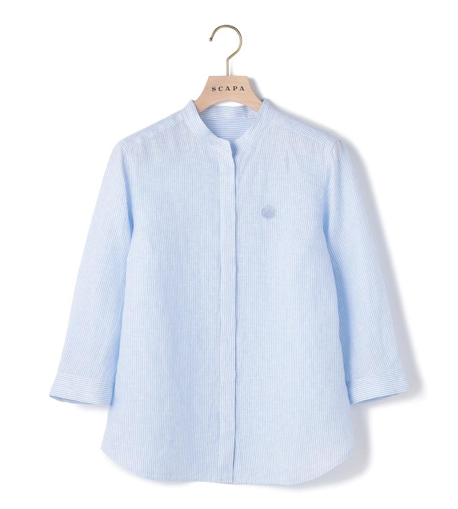 肌にさらっと心地よく着られるリネン100%素材のシャツです。これからの季節にぴったりの爽やかなストライプ柄、顔まわりをすっきりと見せてくれるバンドカラーで仕上げました。1枚着はもちろんボタンを開けて羽織りとしてあわせるのもおすすめ、ロングシーズンお使いいただける7分袖もポイントです。